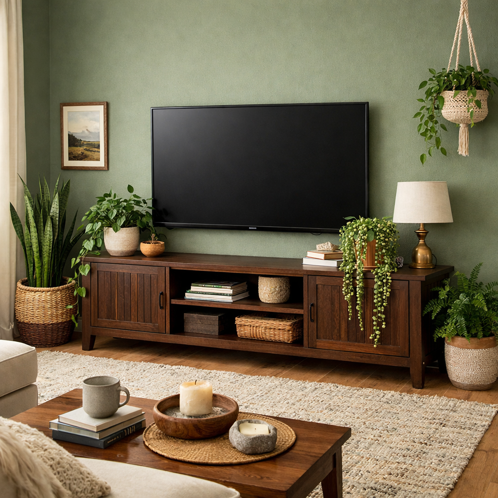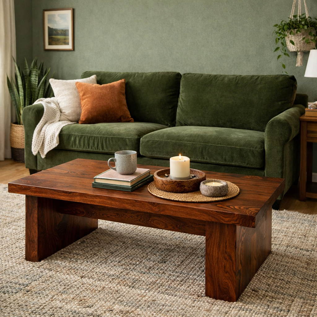 Picture this: a velvety moss-green sofa sitting across from a richly stained, handcrafted wood coffee table. The organic wood grain pops brilliantly against the earthy green, giving your living room that highly sought-after “lived-in, layered” aesthetic.