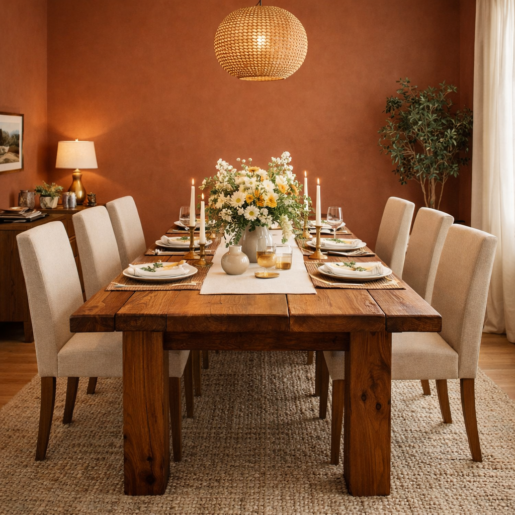 Design Tip: If you are painting your dining room a warm terracotta, ground the space with a massive, rustic solid wood dining table. The combination of the baked-clay wall color and the handcrafted imperfections of natural wood creates a dining space that feels intimate, expensive, and ready for a spring dinner party.
