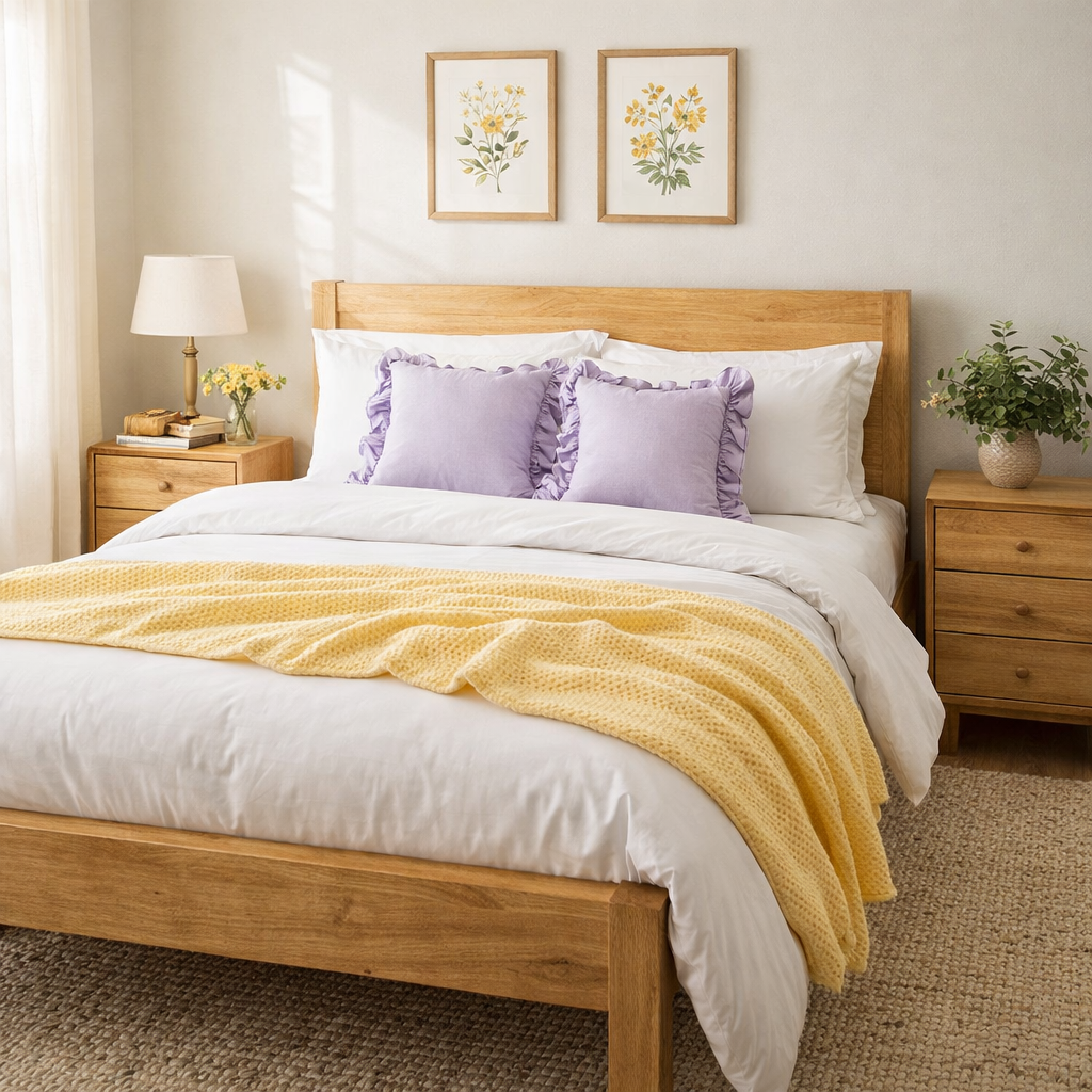 - Try this: Refresh your bedroom by swapping out heavy winter bedding for light linen sheets in butter yellow and lavender. Frame the space with a beautiful, natural-finish mango wood platform bed. Mango wood has a stunning, slightly golden undertone that perfectly complements cheerful pastel palettes without making the room feel like a nursery.