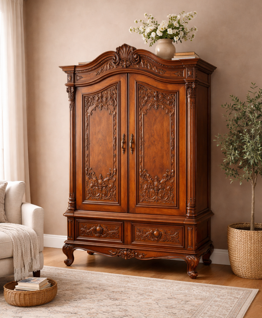 - The Sierra Way: If you have soft mocha walls, this is your chance to let an intricate, hand-carved piece of furniture do all the talking. A striking freestanding solid wood armoire or a richly detailed wood sideboard becomes an instant piece of art against a soft, creamy backdrop.