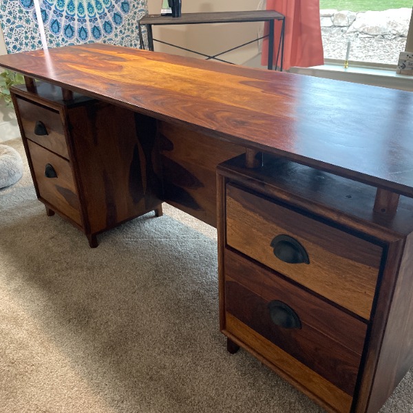 My desk in person is so much nicer then the pictures you really get to see how beautiful the wood really is! The process took very long but in the end I am very happy! Not happy with the freight service of when desk was being delivered but the two guys who actually delivered my desk were very good and professional!