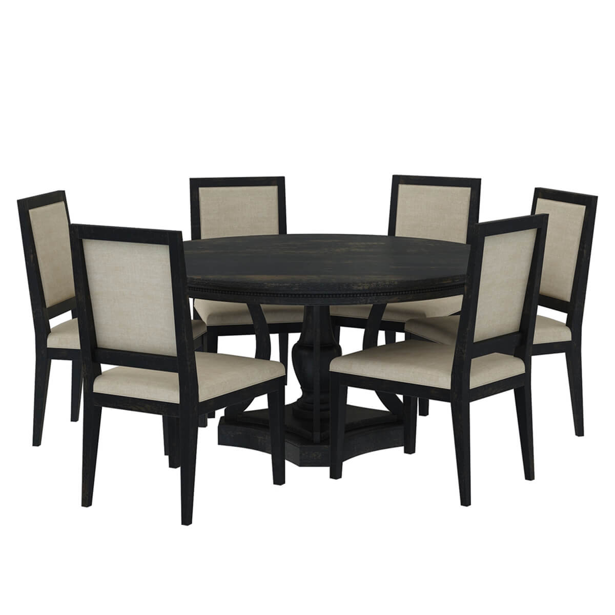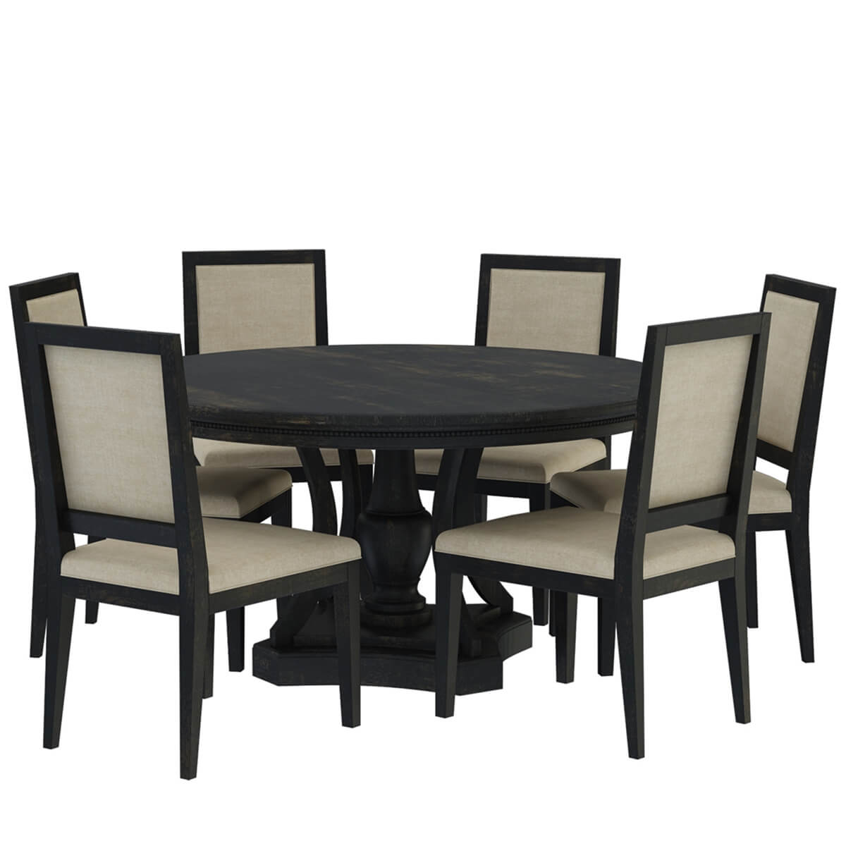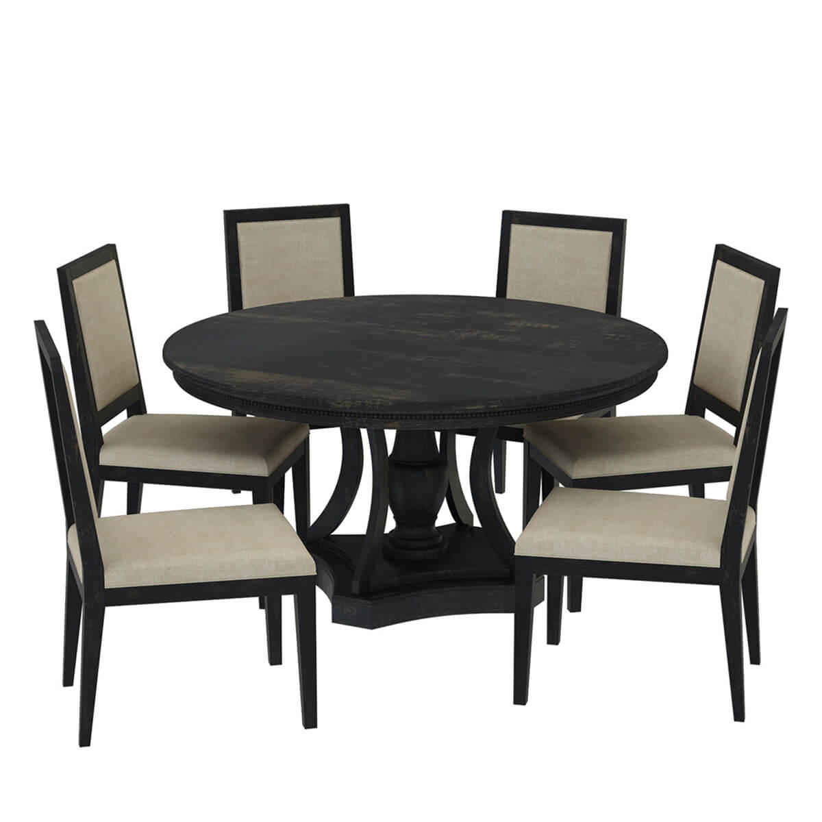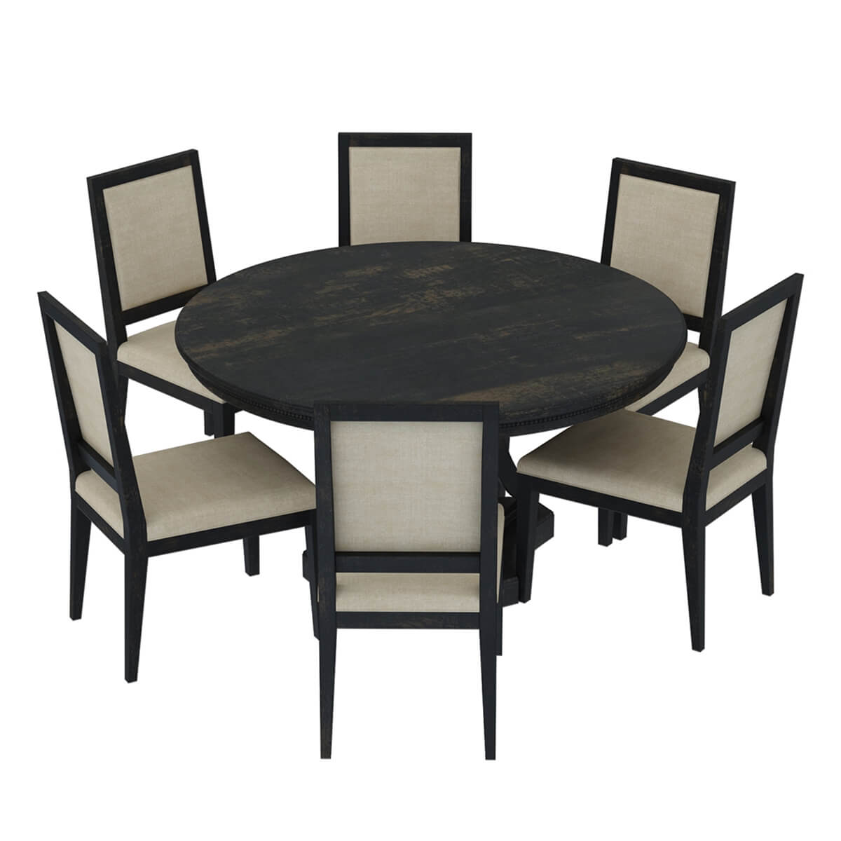 Your dining room will enjoy a chic upgrade when you furnish your home with our exceptional Abingdon Rustic Solid Wood Round Pedestal Dining Table & 6 Upholstered Chairs Set. This transitional style rustic dining room set is handcrafted from solid wood in a dark weathered finish for upscale styling with a casual vibe.