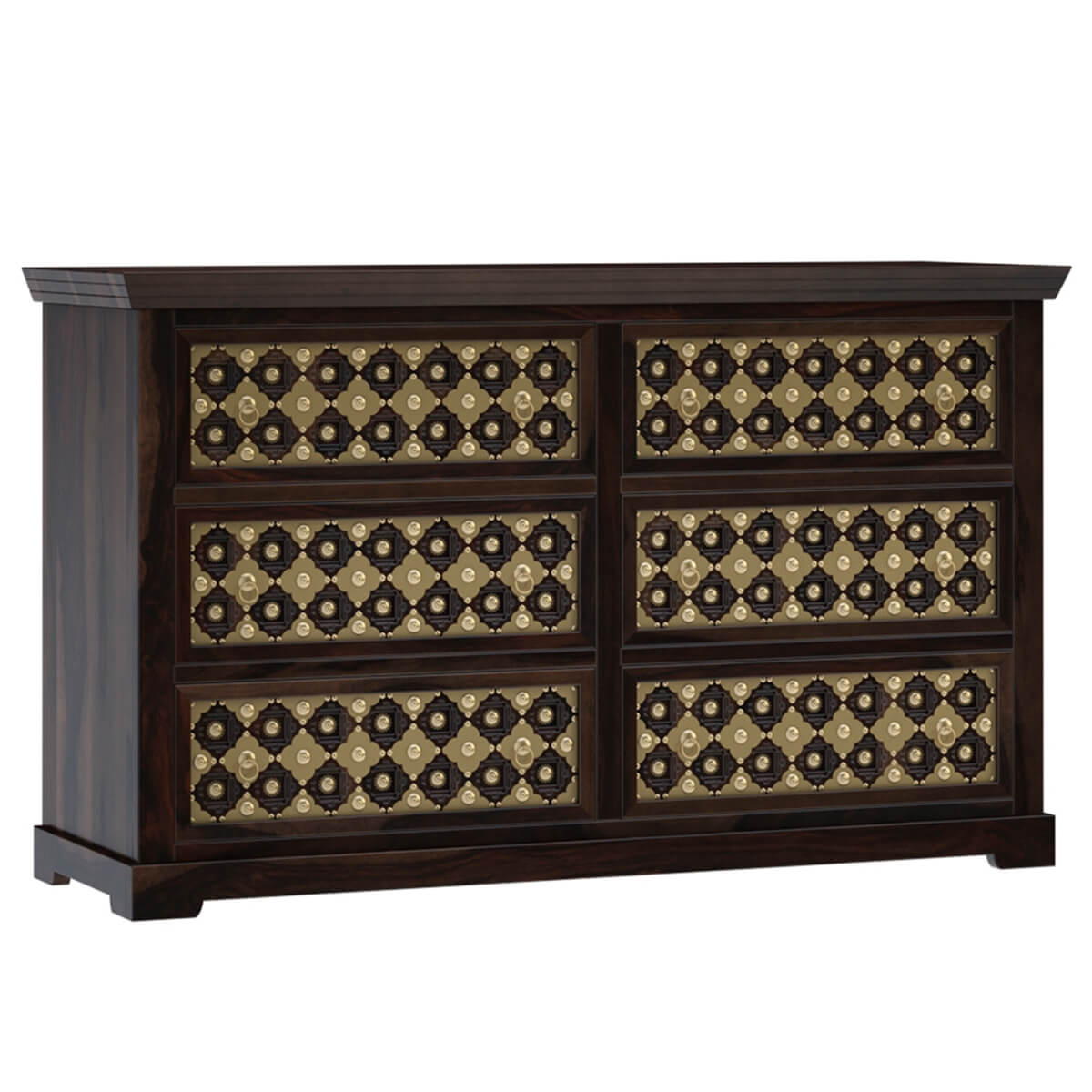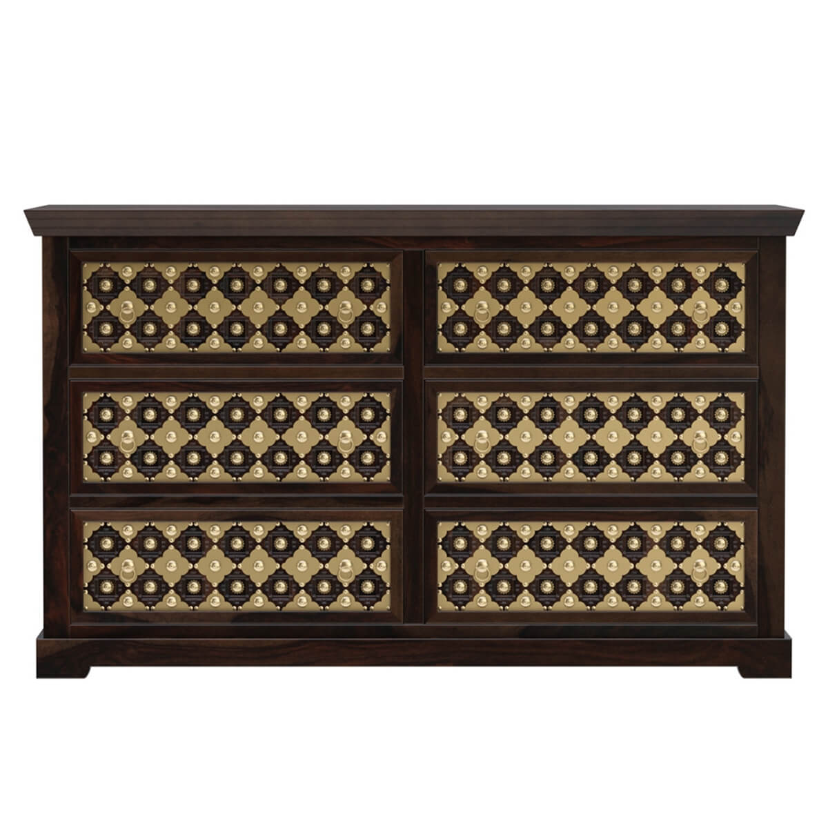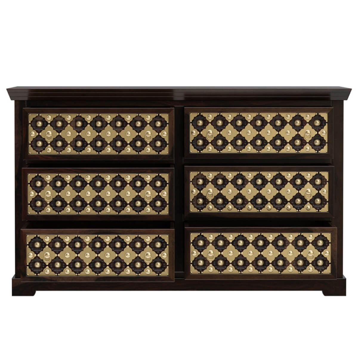 This double dresser evokes a worldly charm by blending colors, shapes, and textures in a tasteful exhibition that transforms any space into an extraordinary destination of style. The rectangular profile is a showcase on which a stunning rendering of quatrefoil brass accents with sunburst rivets against a warm espresso stain. Sleek ring pulls play into this design scheme, blending seamlessly to offer function without detracting from this wondrous and worldly display. A platform base with bracket-style feet warm the piece and enhance the feel of the Old World glamour. Fitted with six drawers, there is more than enough room to properly organize your wardrobe and there is more than enough room along the top to display your decorative curios, caddies, and jewelry holders.
