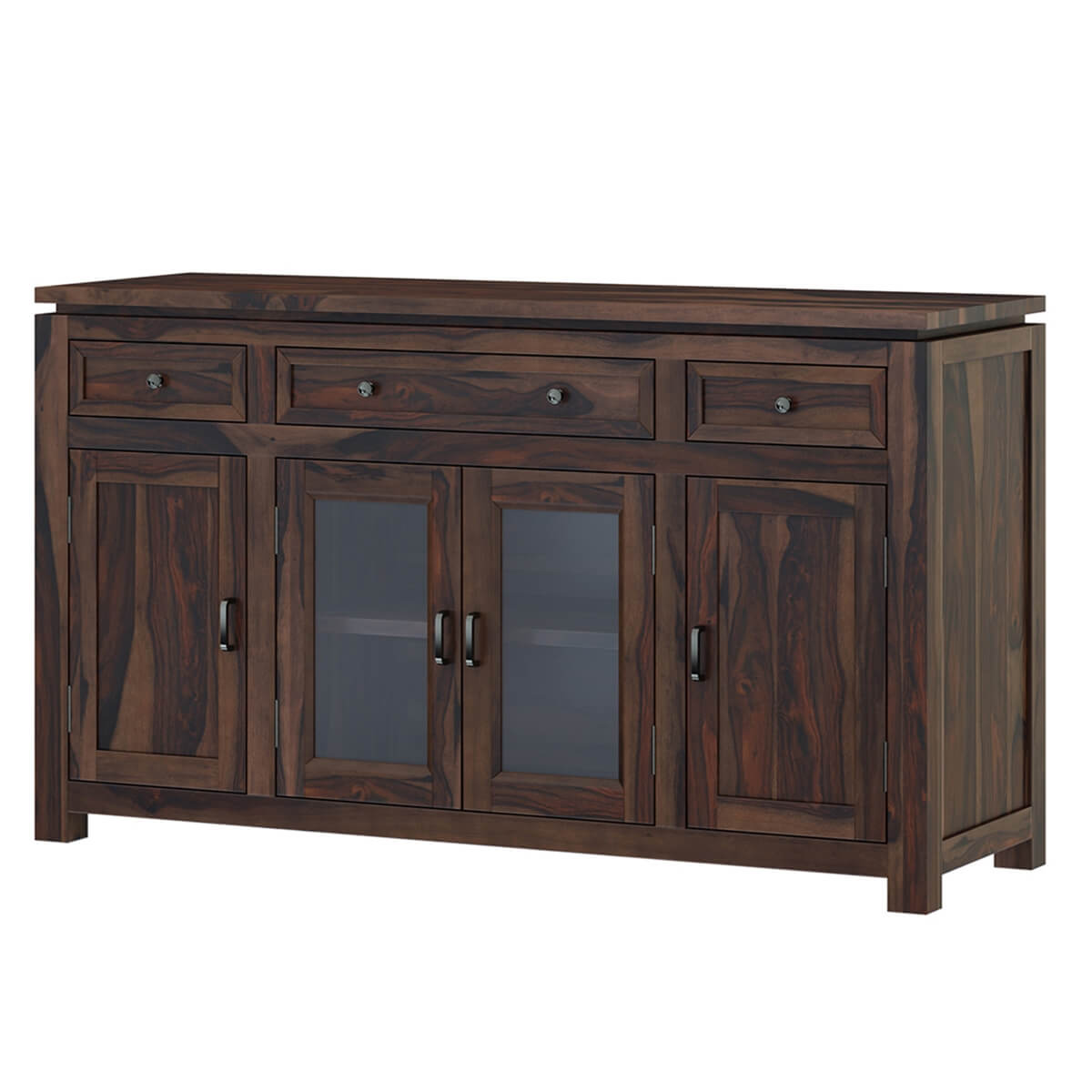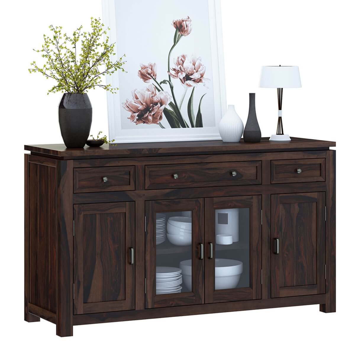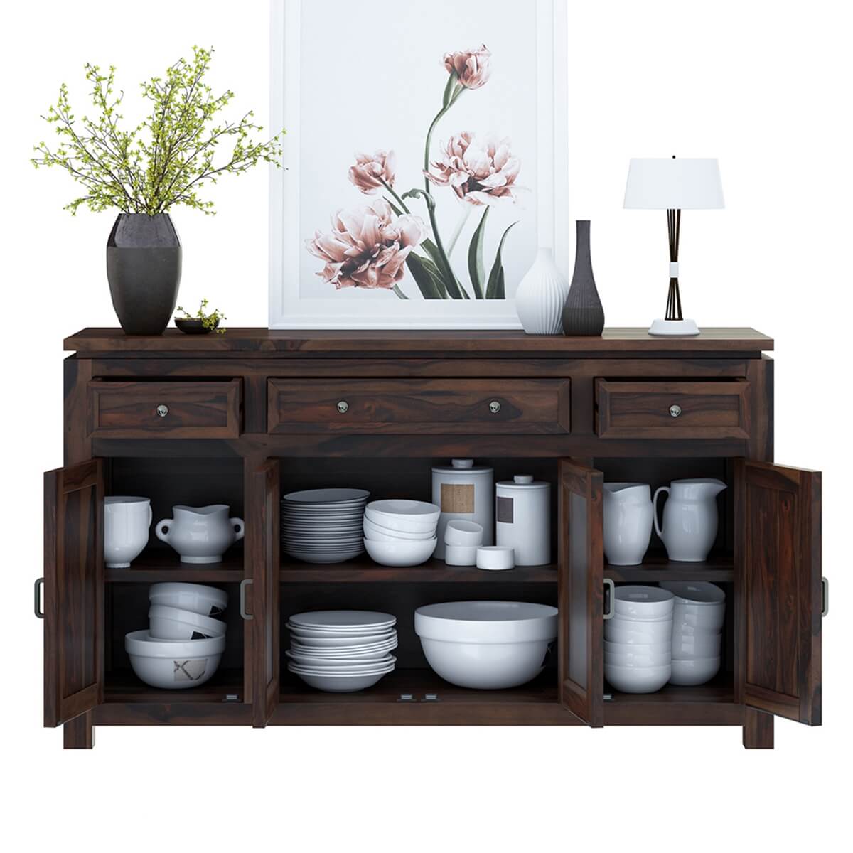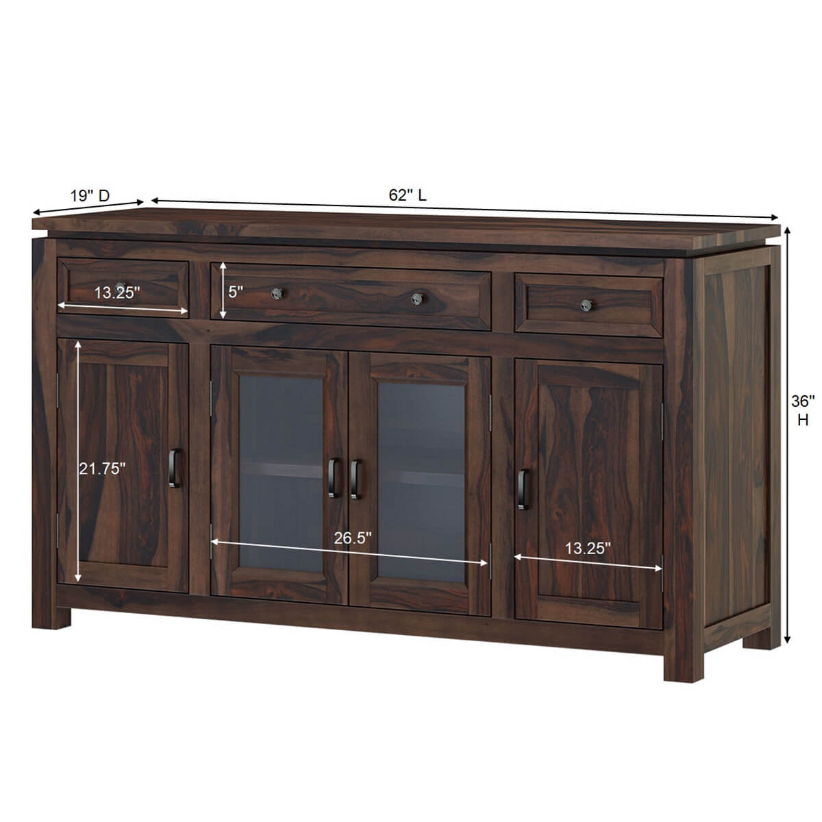 Elegant and stylish, our Sela Classic Rustic Solid Wood 3 Drawer Large Buffet Sideboard Cabinet is a modern take on skillfully made dining furniture. Urban outlook, streamlined silhouette, and graceful in-lay are some of the best features this long buffet cabinet offers. Entirely handcrafted from Solid Wood, this large sideboard boasts its visually striking finish that runs all over its body and brings out the natural aura and texture of the Solid Wood.