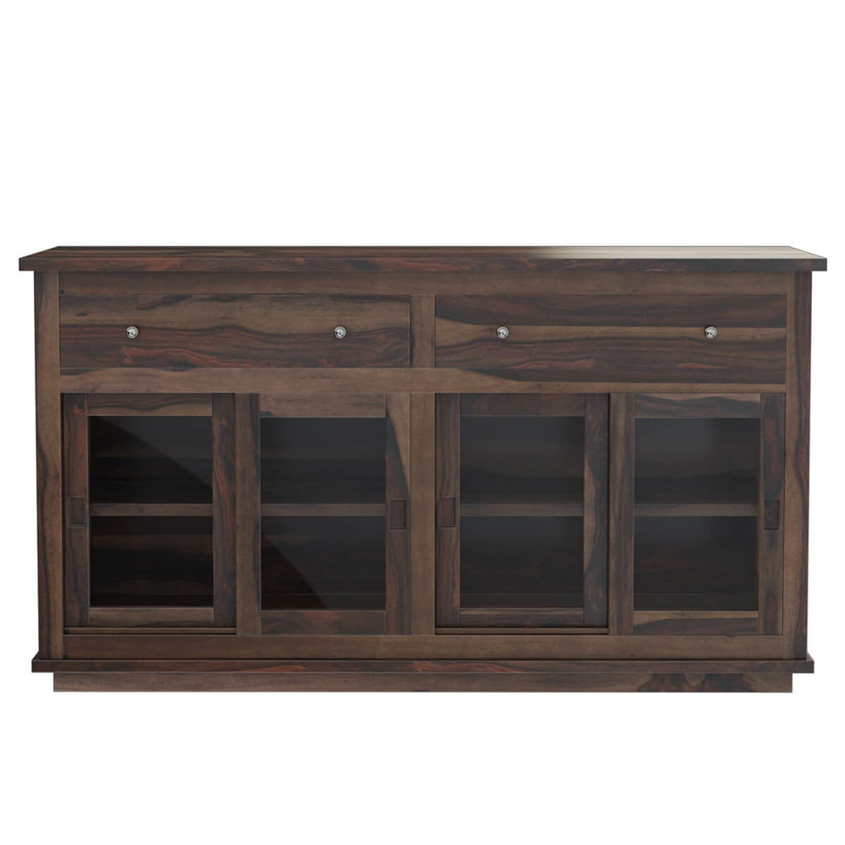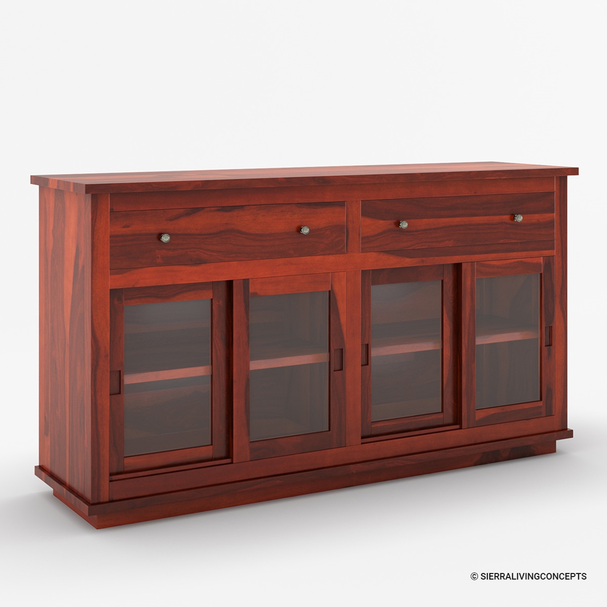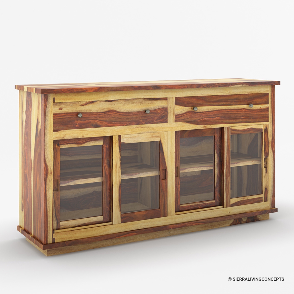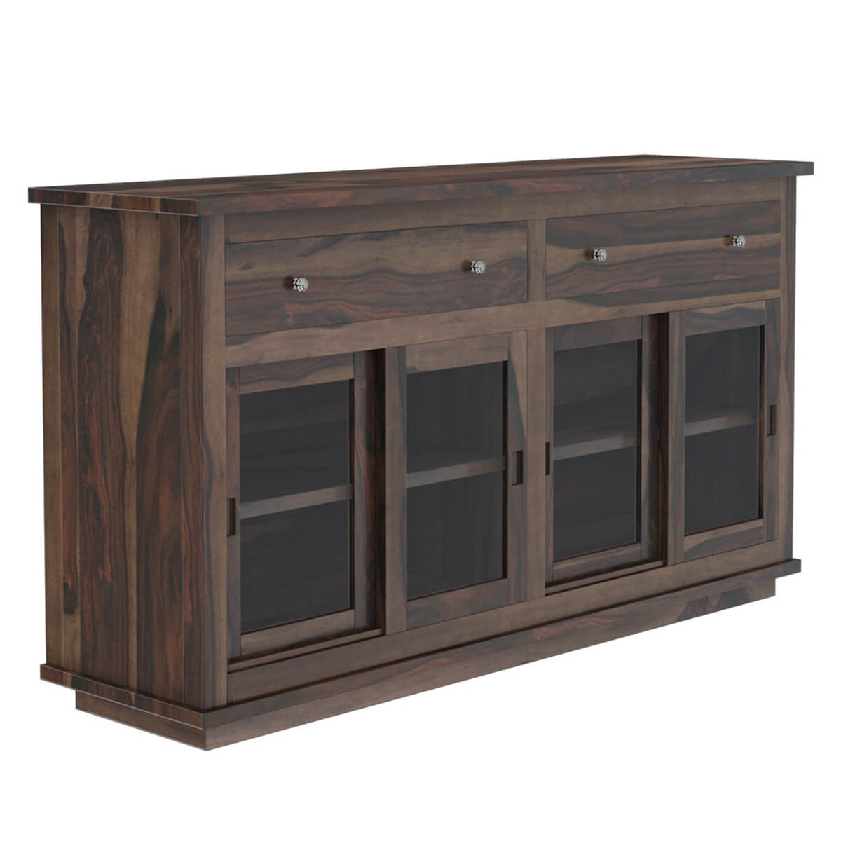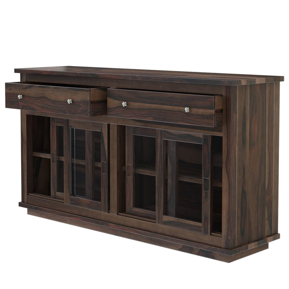 Bestow a modern and vibrant appeal to your kitchen collection by availing our Pescara Rustic Solid Wood 2 Drawer Large Buffet with Sliding Glass Door. Entirely handmade, this 65-inches long sideboard offers an impressive amount of storage space and a classy, sophisticated outlook. Made from 100% Solid wood, this long buffet sideboard reflects its beauty with its rich tones, clean-lined silhouette, a gorgeous deep stain, and robust heirloom design.