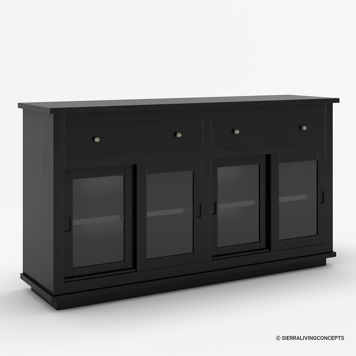 Offering ample storage space, it consists of two top drawers with double knob hardware and 2 shelved cabinets with sliding glass doors. Store all your dinnerware, serveware, linens, cups, glasses, and other dining essentials in these spacious compartments to enjoy a clutter-free and well-organized kitchen space. These stylish glass doors allow you to exhibit your beautiful dishes and glassware while maintaining their safety and tidiness.