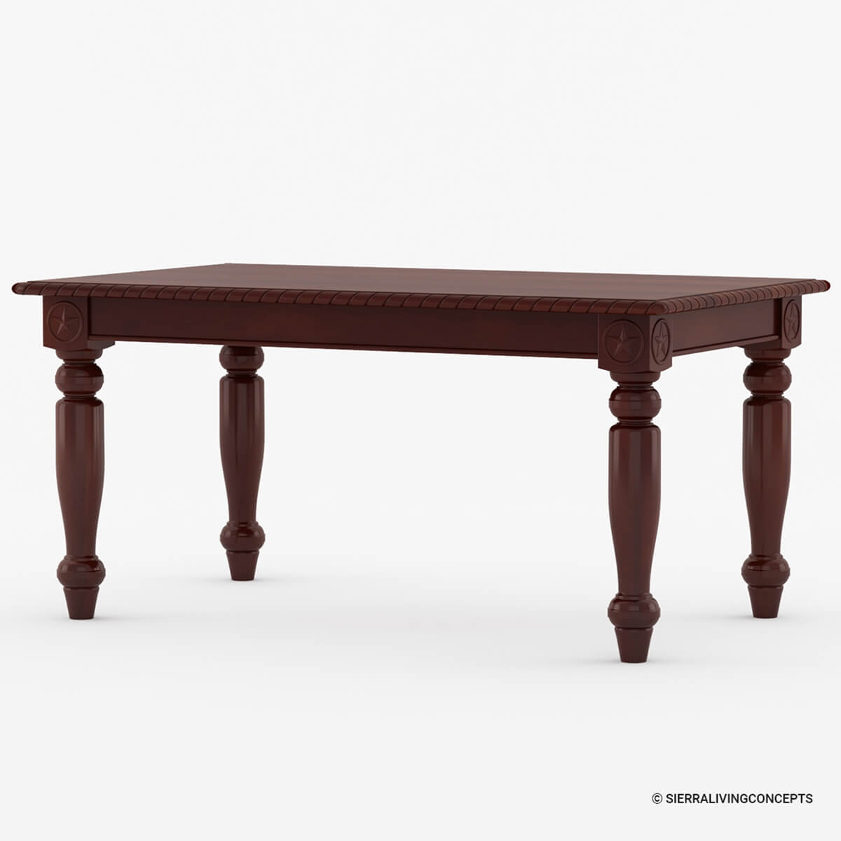 Inspired by Old World tradition and elegance, this rectangular dining table is a classic staple for breaking bread, with contemporary sensibilities to mesh with today's lifestyle. It is all in the details of this sophisticated table. Just consider the modern band that trims the edges with carved star emblem enhancing the look, coupled with the timeless look of the heavy turned baluster legs. A subtle display if wood grains adds a natural decorative touch with dark finish that is the epitome of high-end dining. Accommodating up to 6 dining chairs, this gracious dining table is ready to show off your stylish table settings, centerpieces, or home cooked dishes with subdued panache. It makes the perfect piece for transitional, traditional, or contemporary decor schemes.