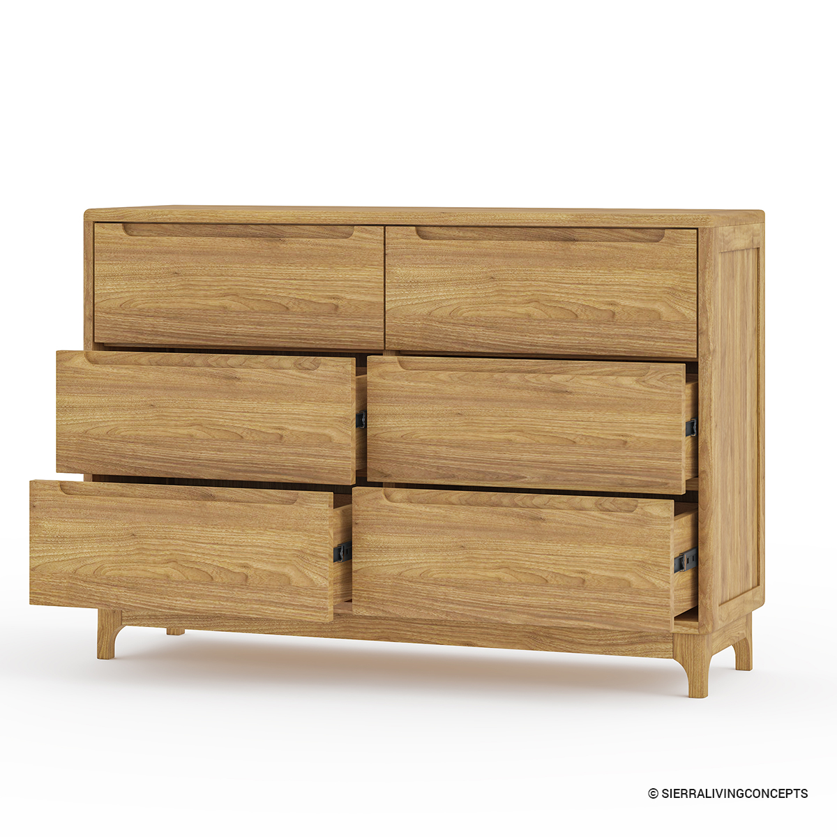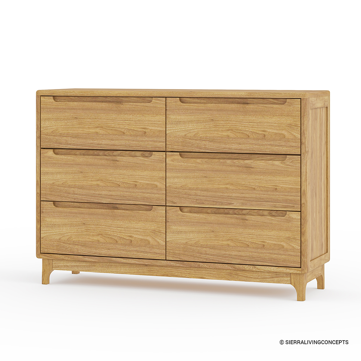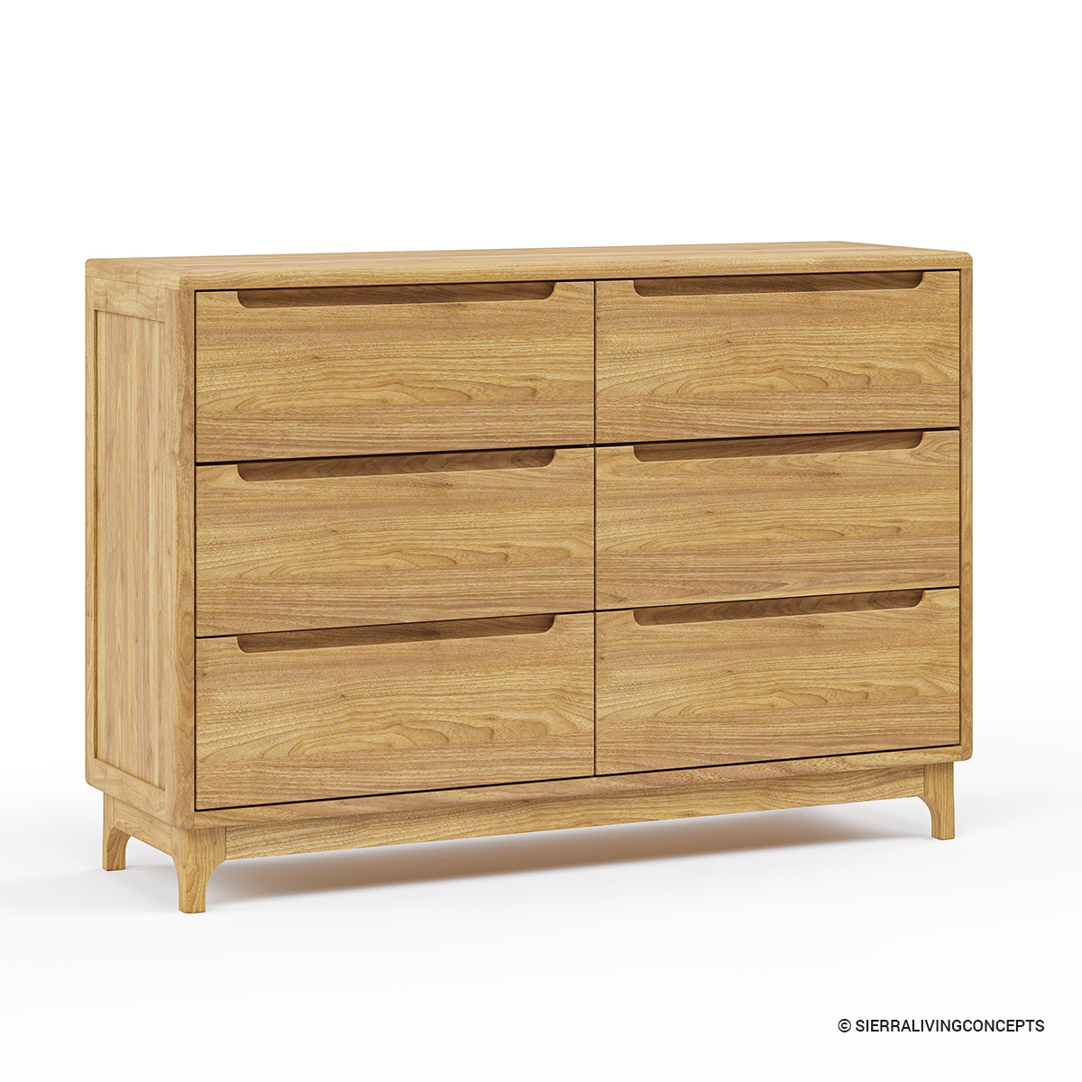 solid wood dresser leans on the modern-rustic side. Its compact body consists of a sleek top frame where you can arrange decor or your everyday essentials with ease. The flush sides and base hold a 6-drawer facade. Each drawer has a built-in cutout handle that’s located at the top edge. With ample storage capacity and a minimalist appeal, this dresser is built to impress with both practicality as well as visuals.