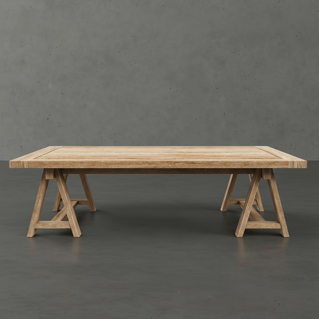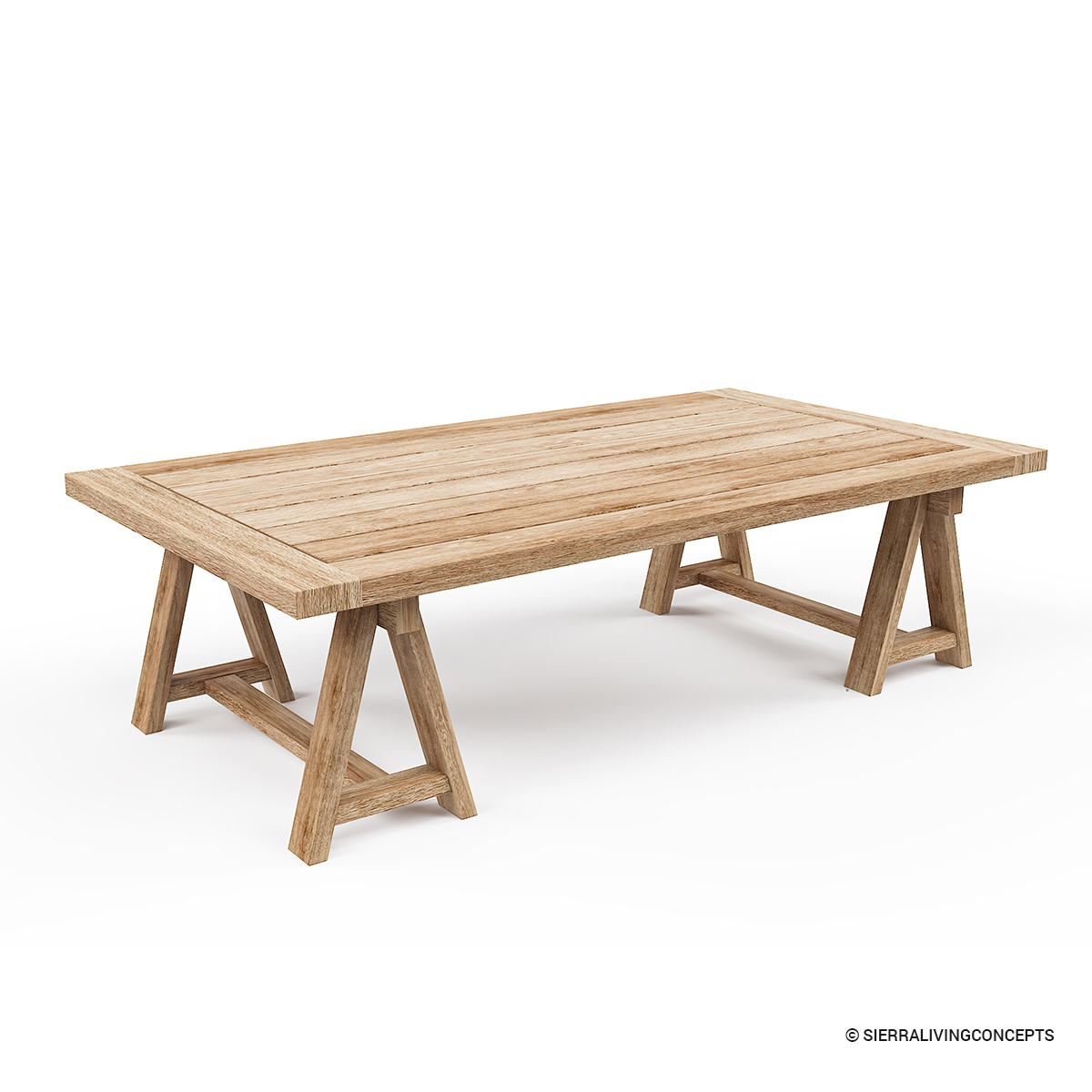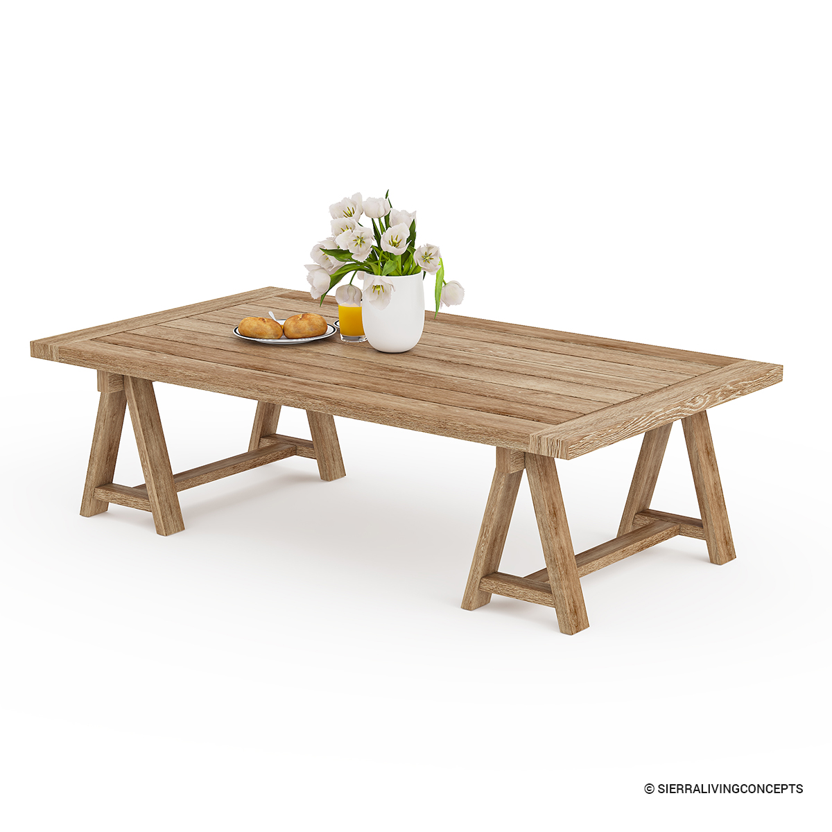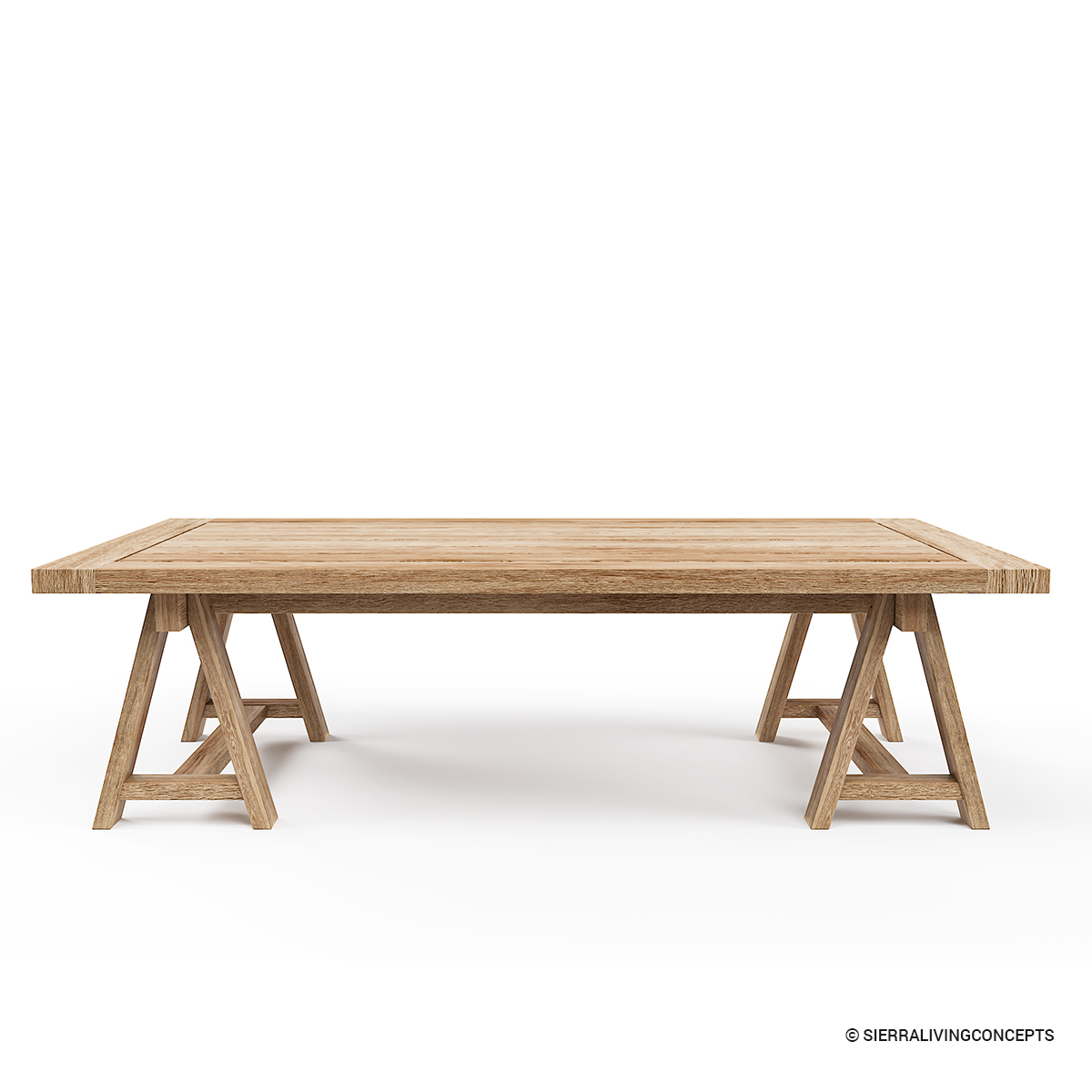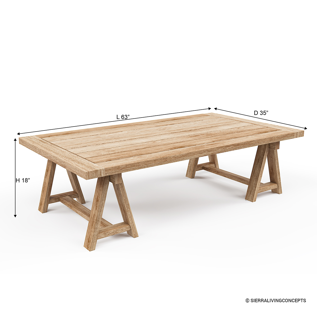Exuding natural and sophisticated vibes, this coffee table is supported by A-shaped double bases which are also connected by a trestle join. The overall look of this coffee table is simple and the nature is sustainable. It is crafted to withstand varying and challenging weather conditions.
