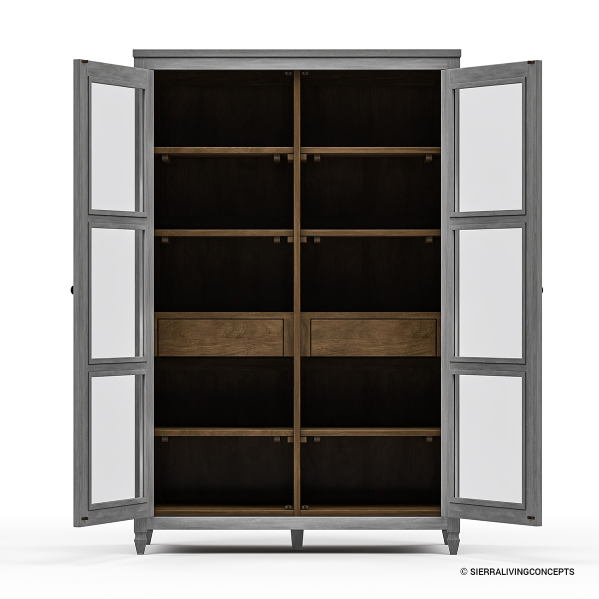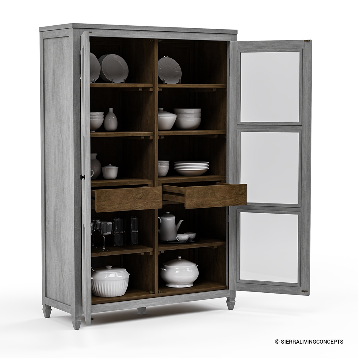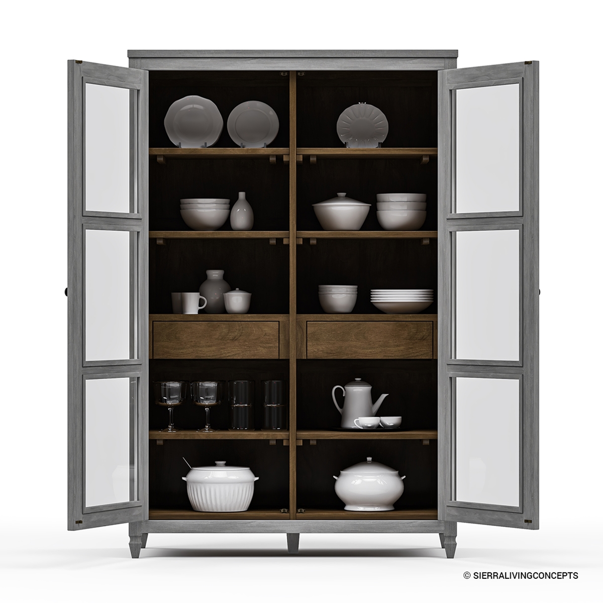 In addition to its immense functionality, this heirloom piece will be an equally gorgeous visual statement. The rustic gray outlook elevates its beauty standards, while the brown finished interiors make a great contrast with the outer display, creating a lasting appeal. The clean lines and bold silhouette of the cabinet integrates with any dining space, bonding instantly with a variety of interior styles. This timeless cabinet stands off the floor on four Adam-style feet that complete its design and assures its stability.