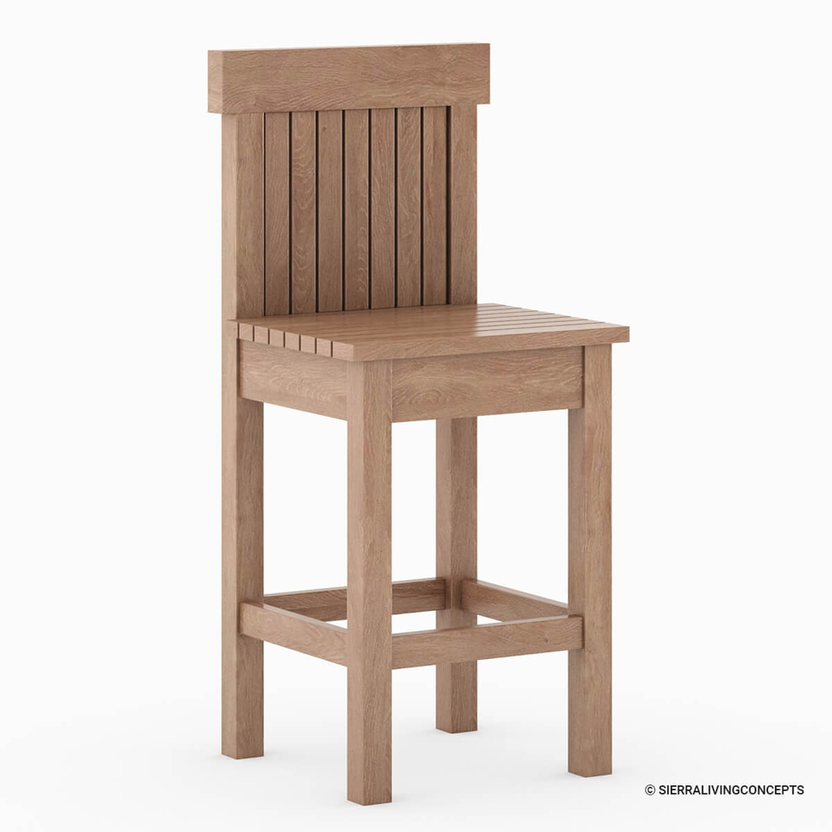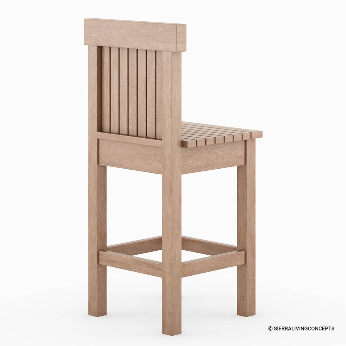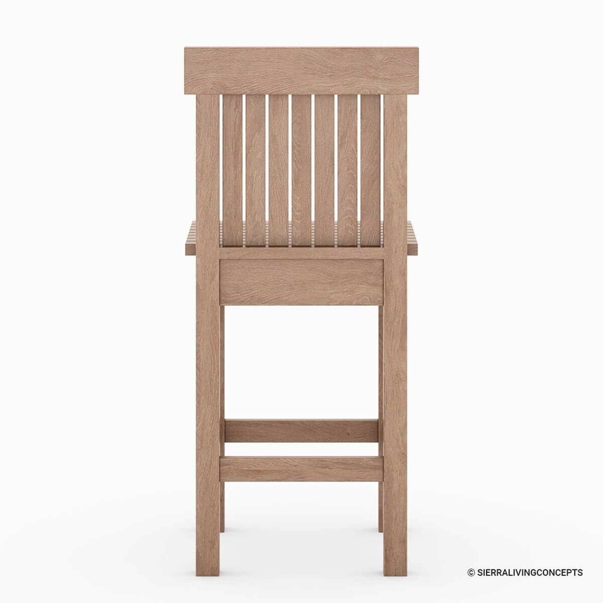 The ergonomic design matched with the rustic beauty of teak wood defines this marvelous outdoor bar stool and helps you in attaining a timeless look for your outdoor bar space. With a bold personality and organic character, this bar stool features a spacious slatted seat with its edges expanded beyond the frame, long straight legs, and a comfortable slatted back with a wide top. The legs are connected by a square stretcher that allows your foot a stable pedestal to rest while you sit and drink your favorite beverage.