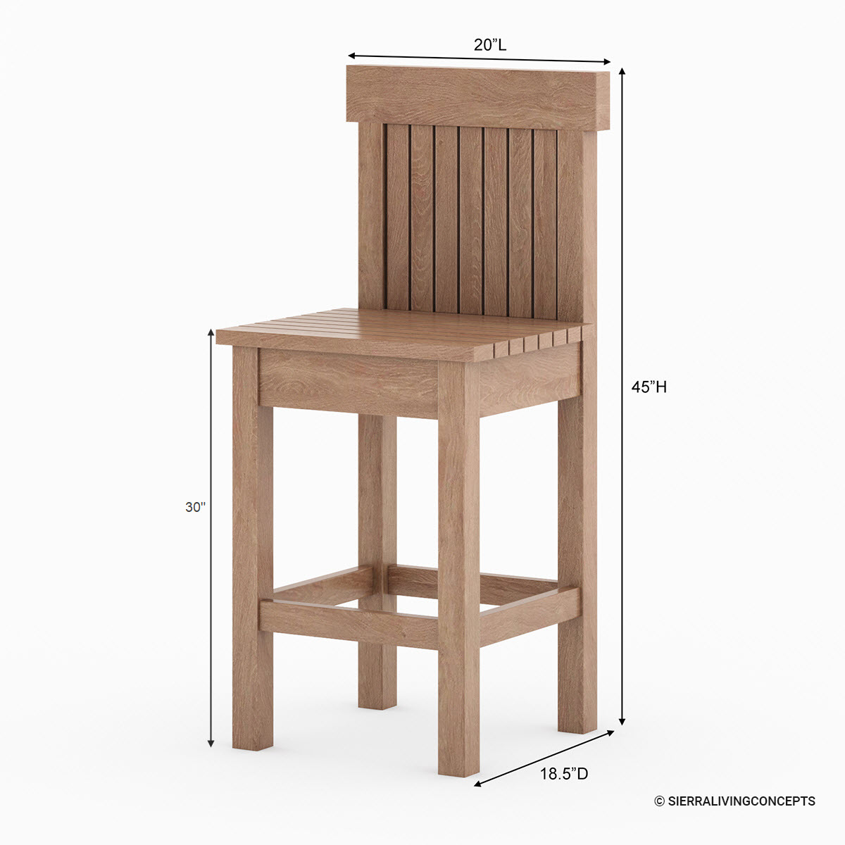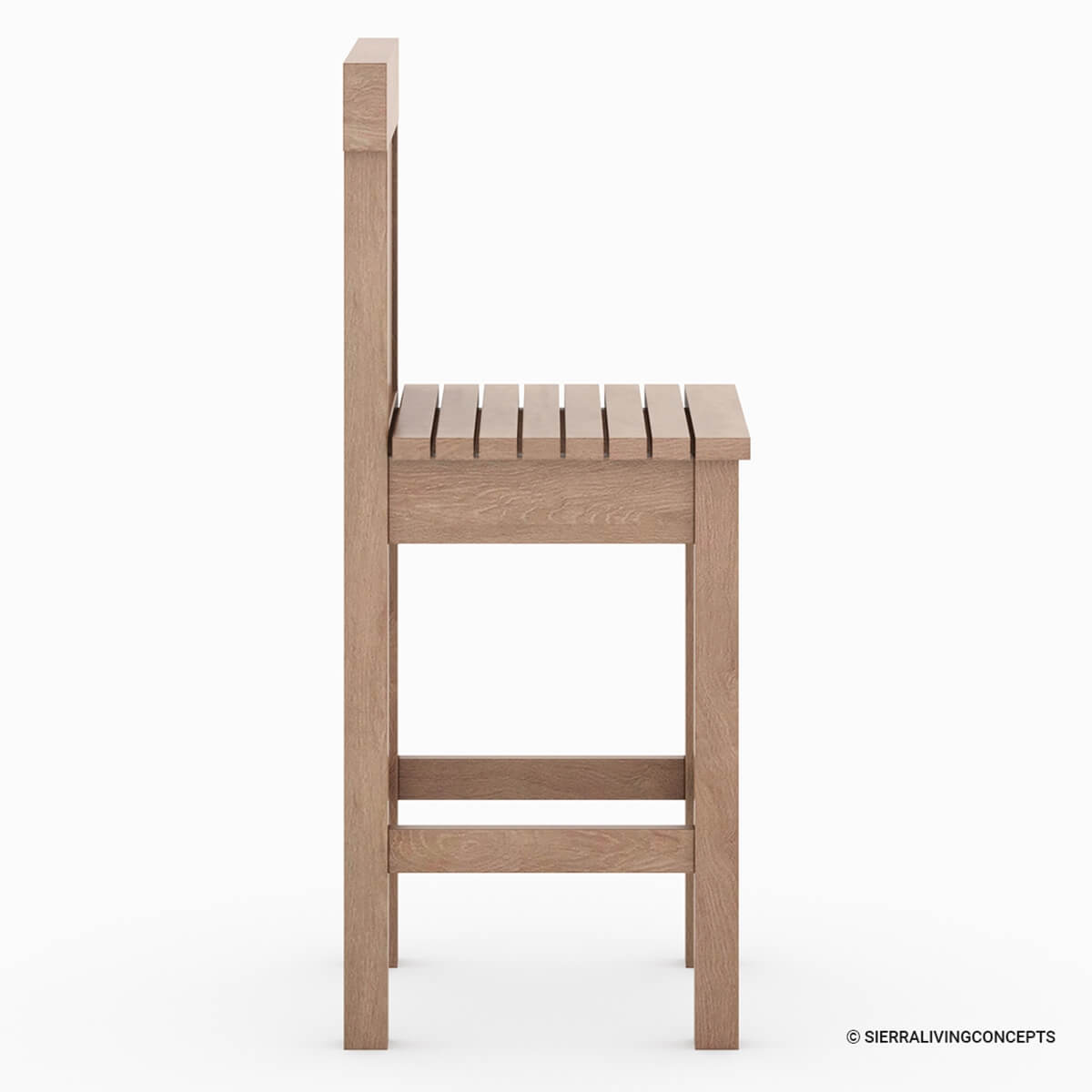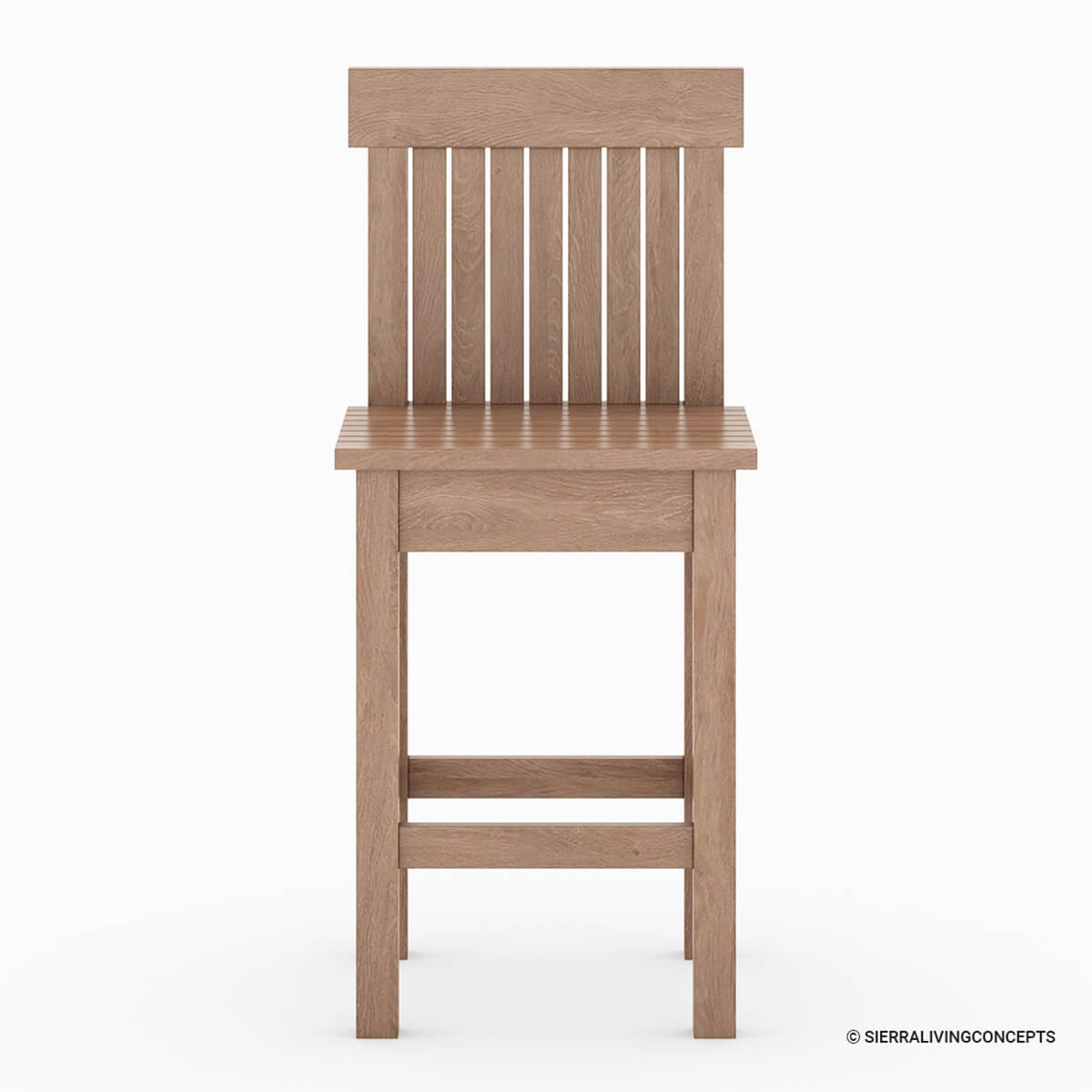 The ergonomic design matched with the rustic beauty of teak wood defines this marvelous outdoor bar stool and helps you in attaining a timeless look for your outdoor bar space. With a bold personality and organic character, this bar stool features a spacious slatted seat with its edges expanded beyond the frame, long straight legs, and a comfortable slatted back with a wide top. The legs are connected by a square stretcher that allows your foot a stable pedestal to rest while you sit and drink your favorite beverage.