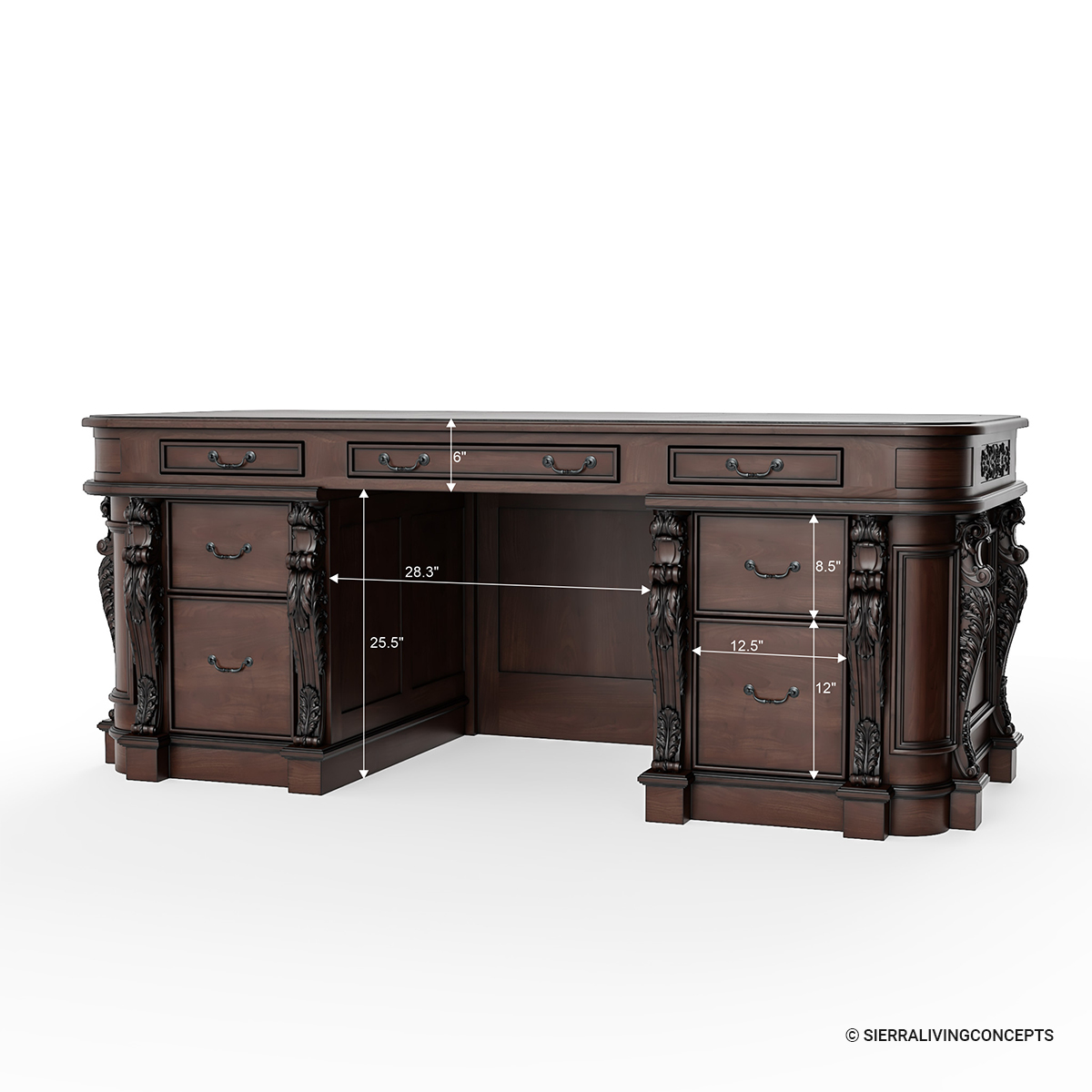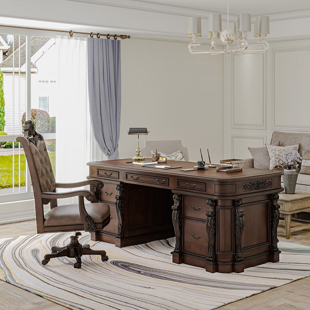 Beyond being a mere gathering of office fixtures, this ensemble declares its distinction and timeless allure. It effortlessly metamorphoses any workspace into a sanctuary of prestige, radiating an ambiance steeped in historical importance and unrivaled craftsmanship. Through its intricate detailing, luxurious solid wood finishes, and deliberate, comfortable ergonomic composition, it encapsulates the apex of executive office furniture décor.
