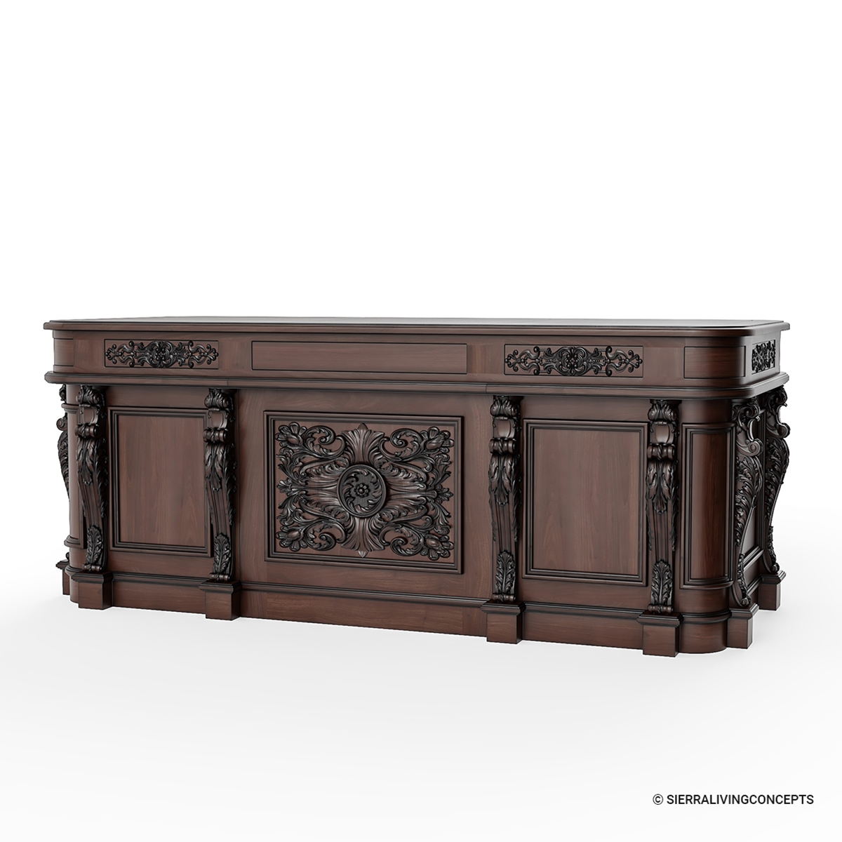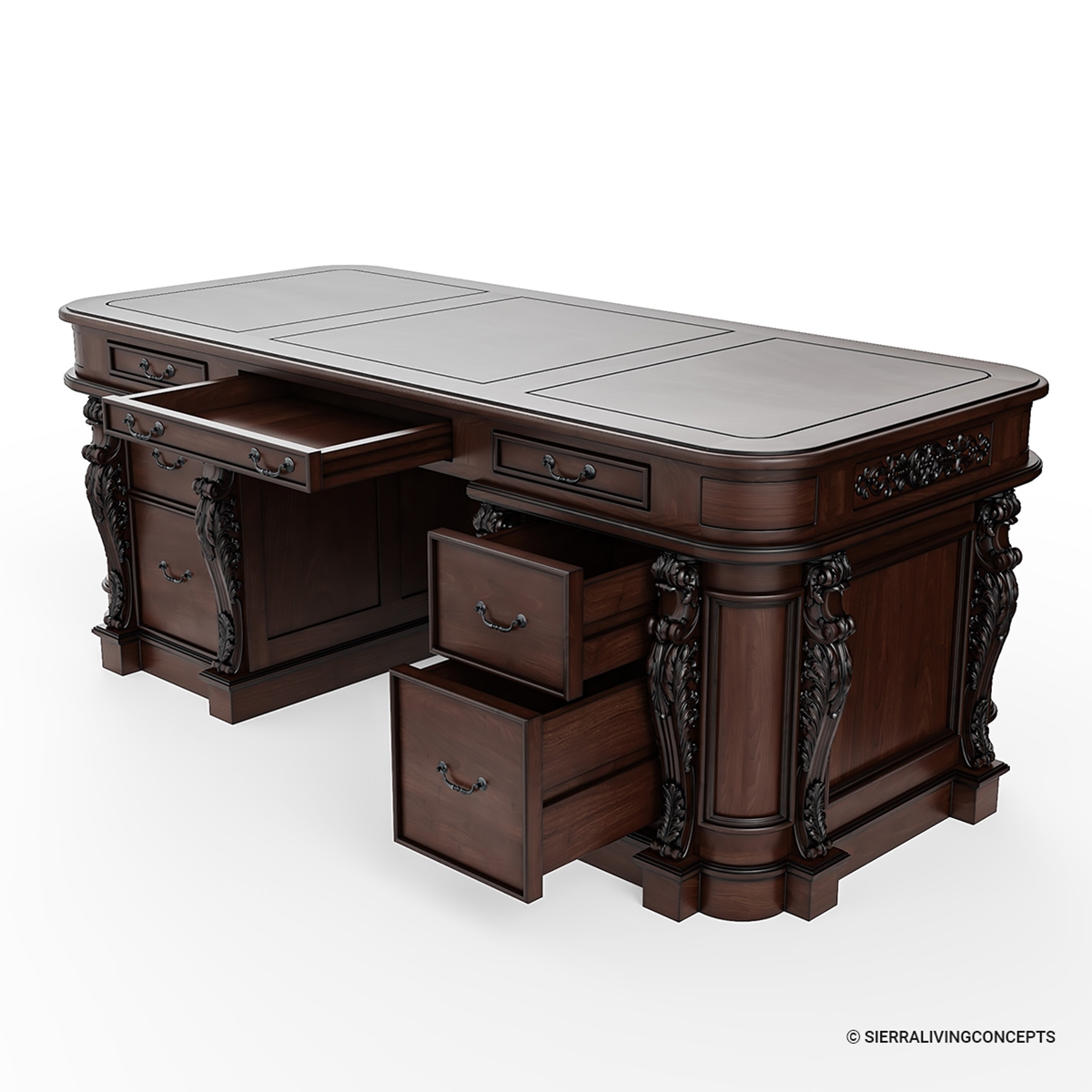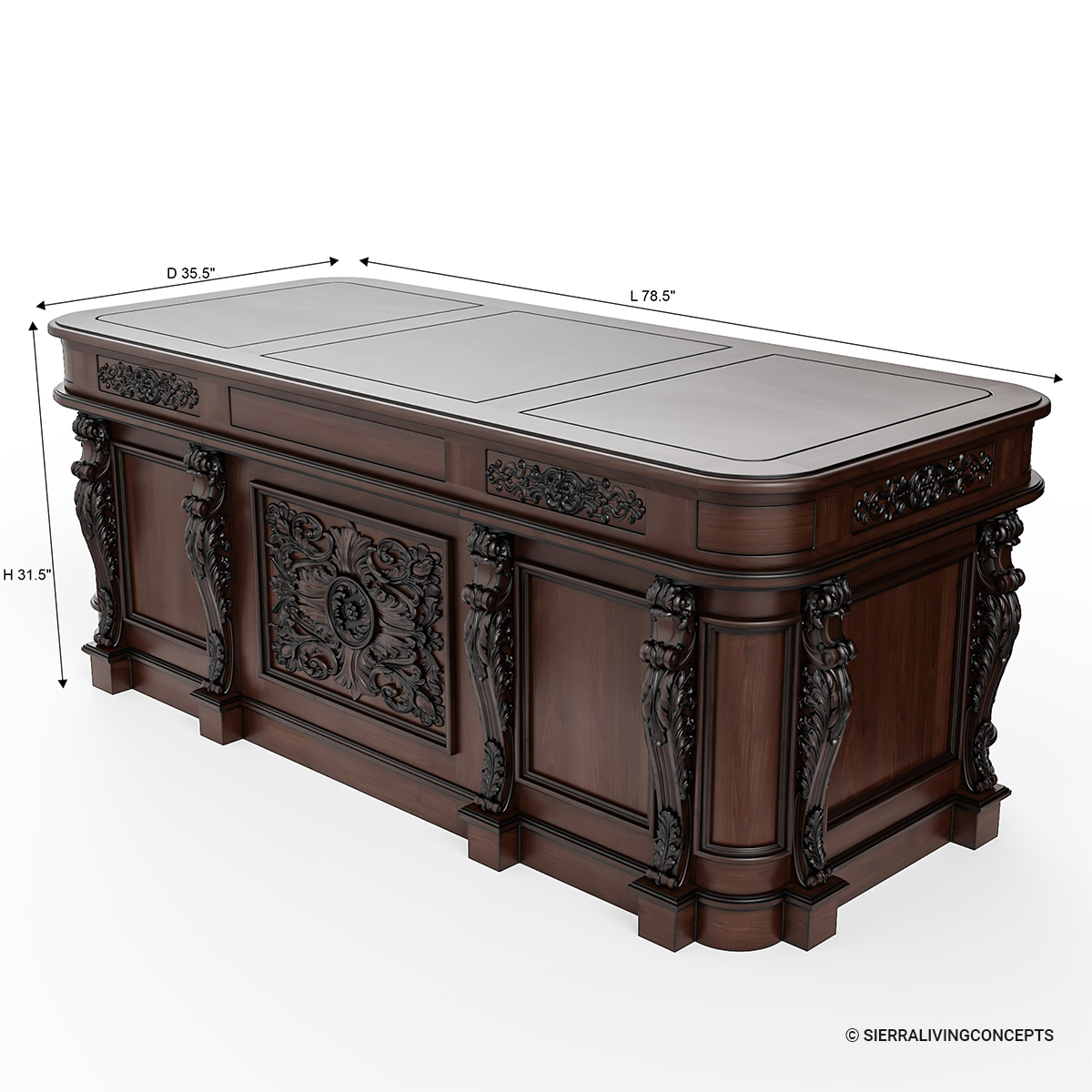 Enter the world of executive extravagance with our Washington Resolute Presidential Office Desk and Chair Set. Each piece in this collection is a testament to meticulous historical craftsmanship, painstakingly hand-carved from premium solid wood. The result is a harmonious fusion of classical beauty, historical authenticity, and ergonomic perfection, ensuring your workspace is a sanctuary of luxury.