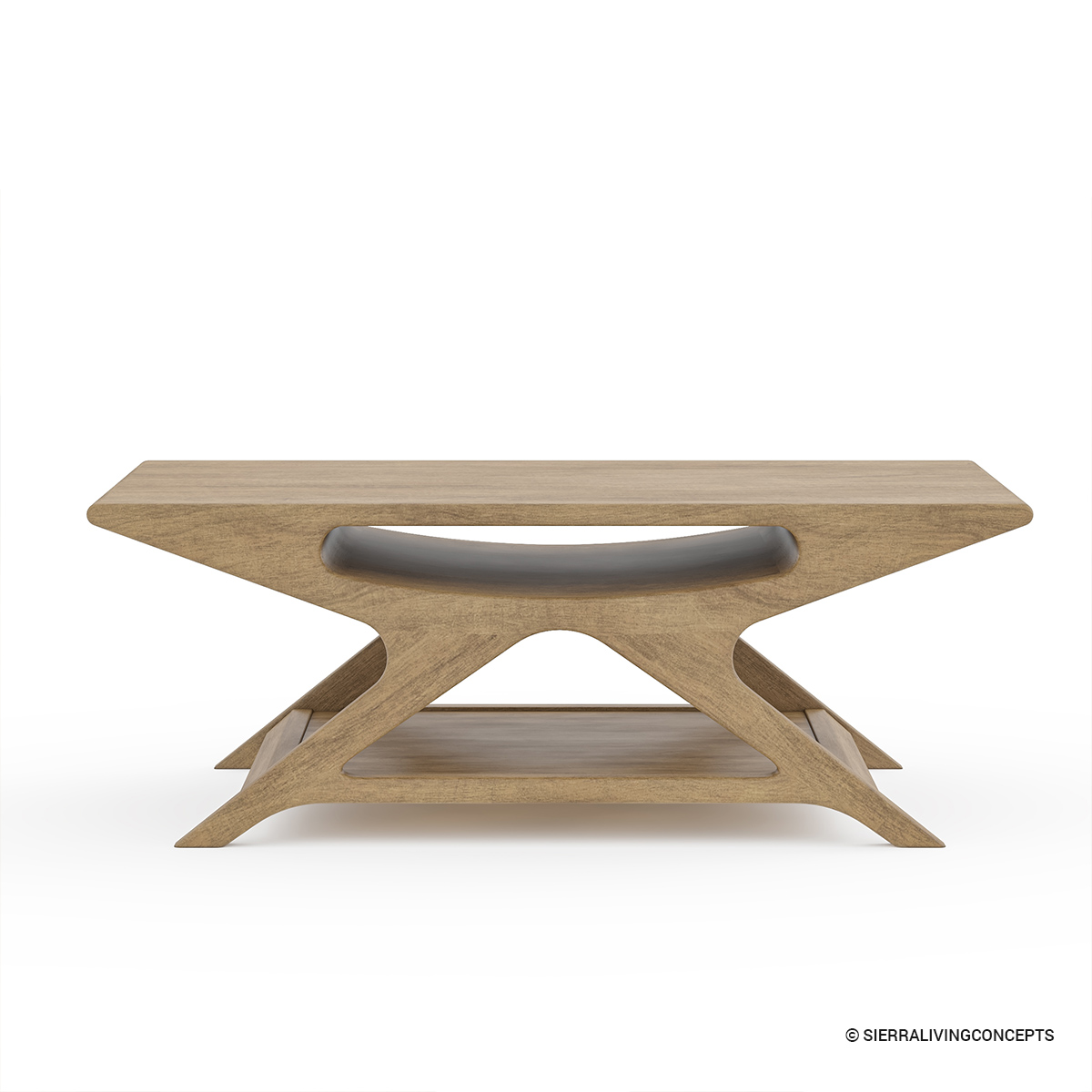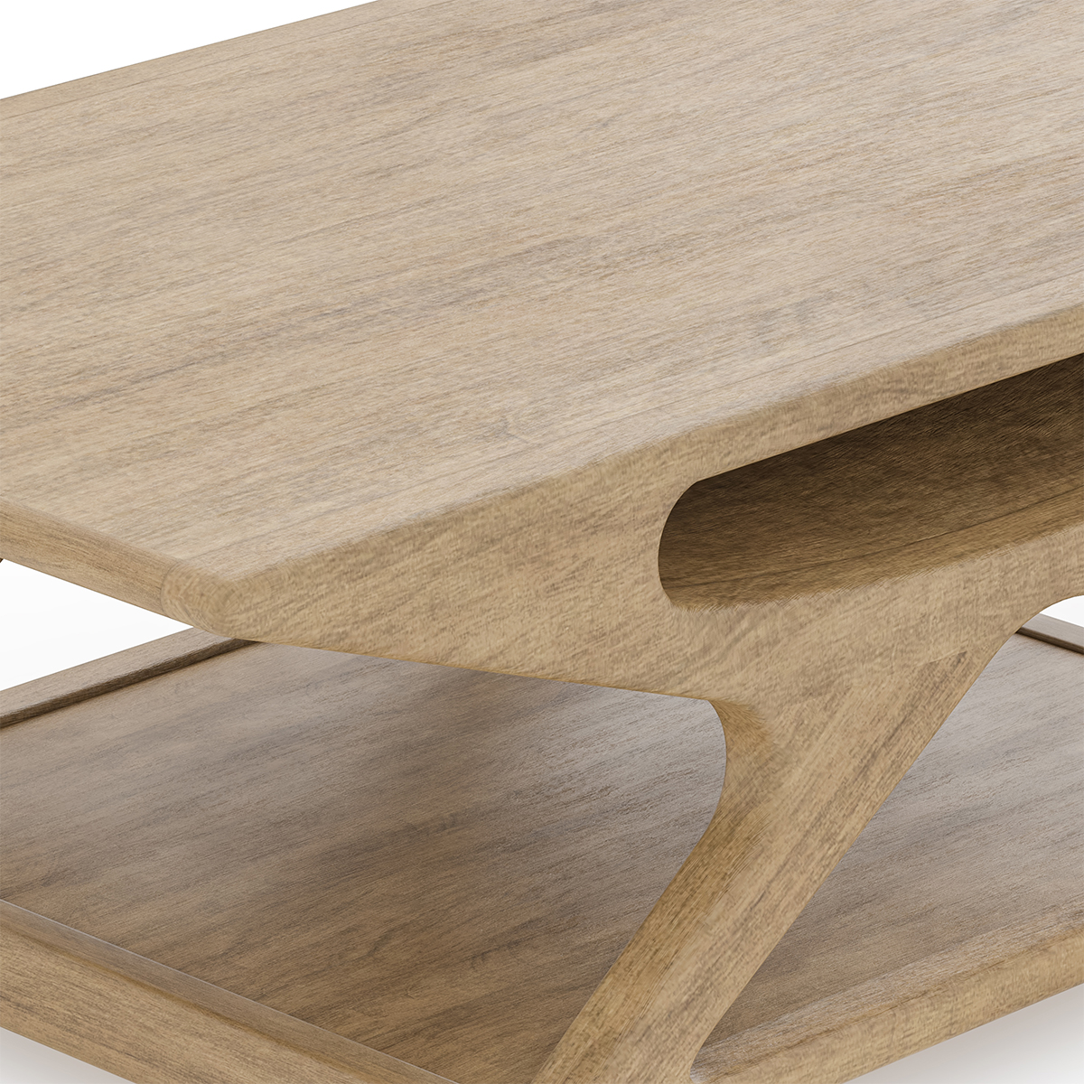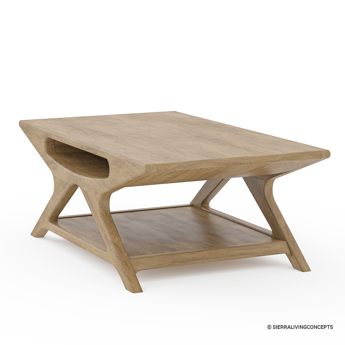 • Generous tabletop space for books and decor, with a unique carved section for remotes and coasters. The center cutout is perfect for newspapers and small items.
