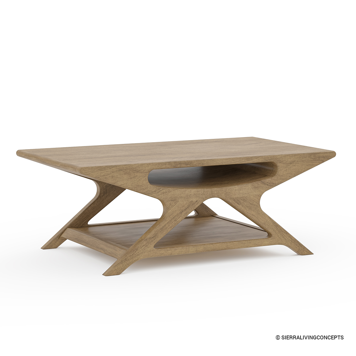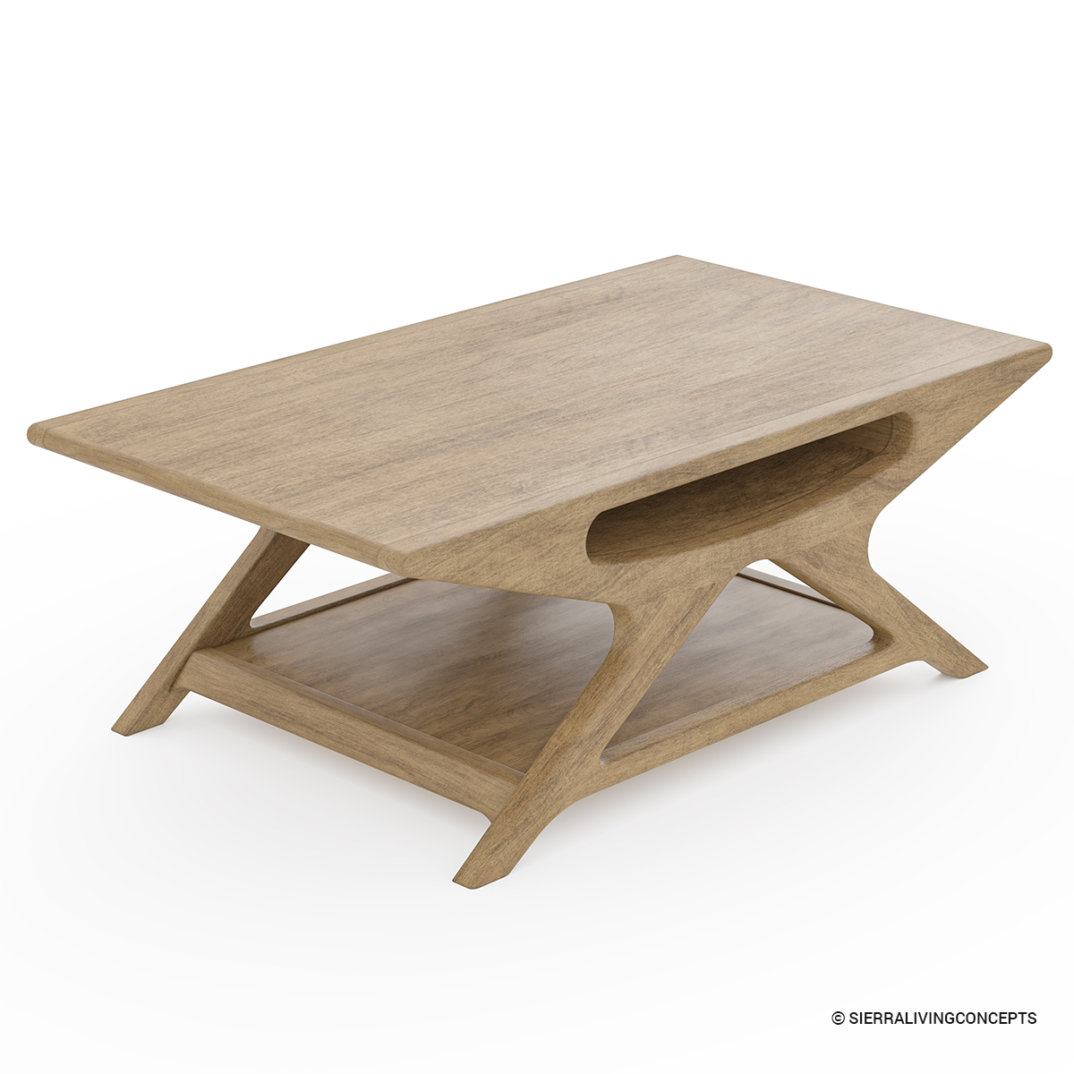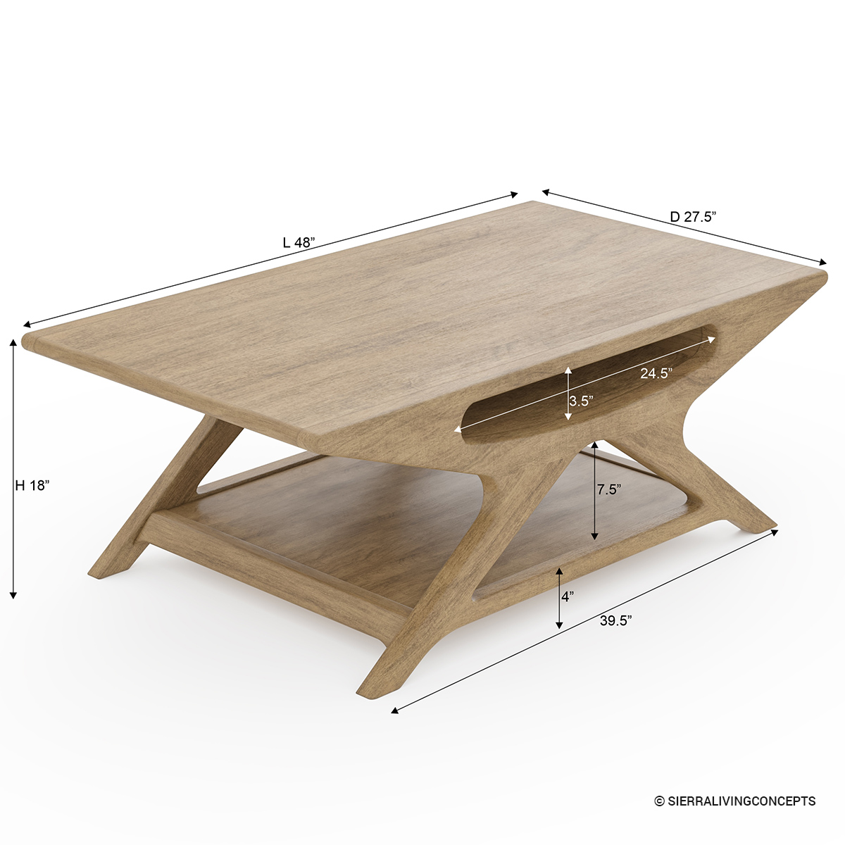 • Generous tabletop space for books and decor, with a unique carved section for remotes and coasters. The center cutout is perfect for newspapers and small items.