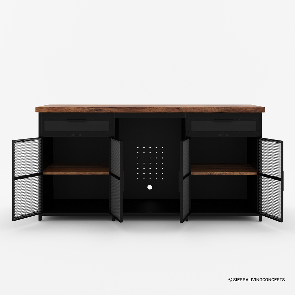 • Blending modern industrial style with iron, mesh, and wood, this extra long sideboard buffet offers a perfect mix of sleek and rustic elements.