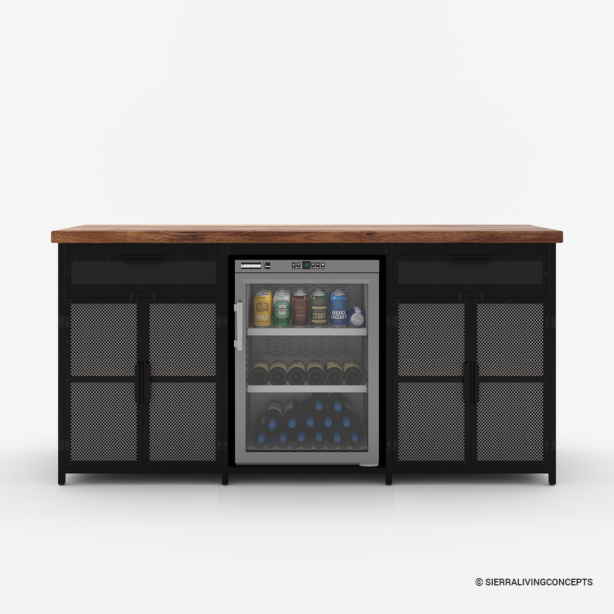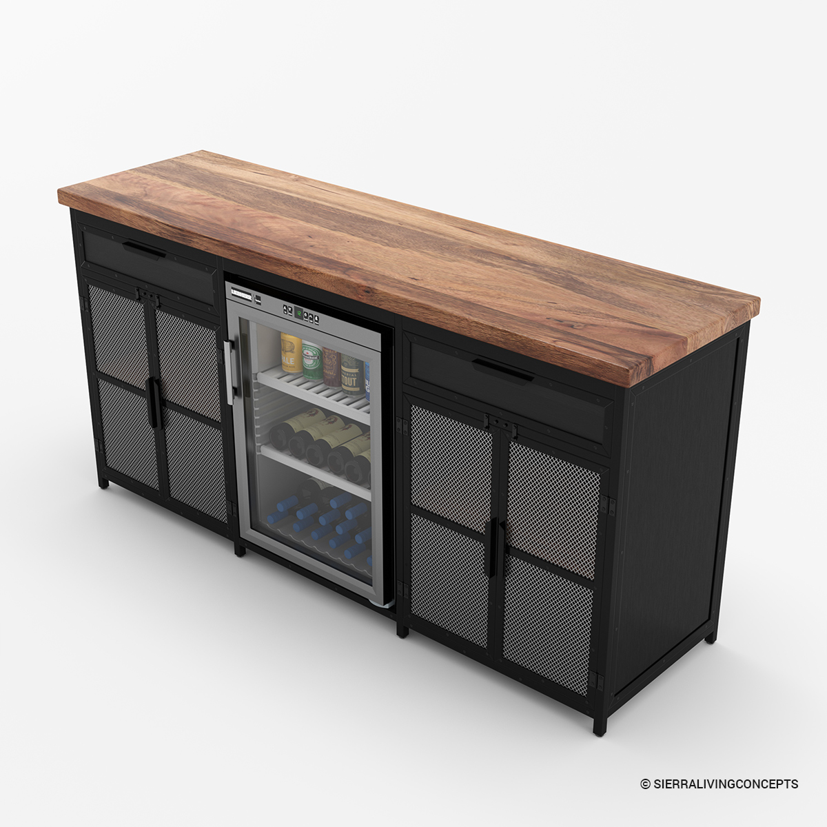• This industrial sideboard fridge space features a two-tone black and natural rustic wood finish, enhanced by stylish mesh accents for a bold visual impact.