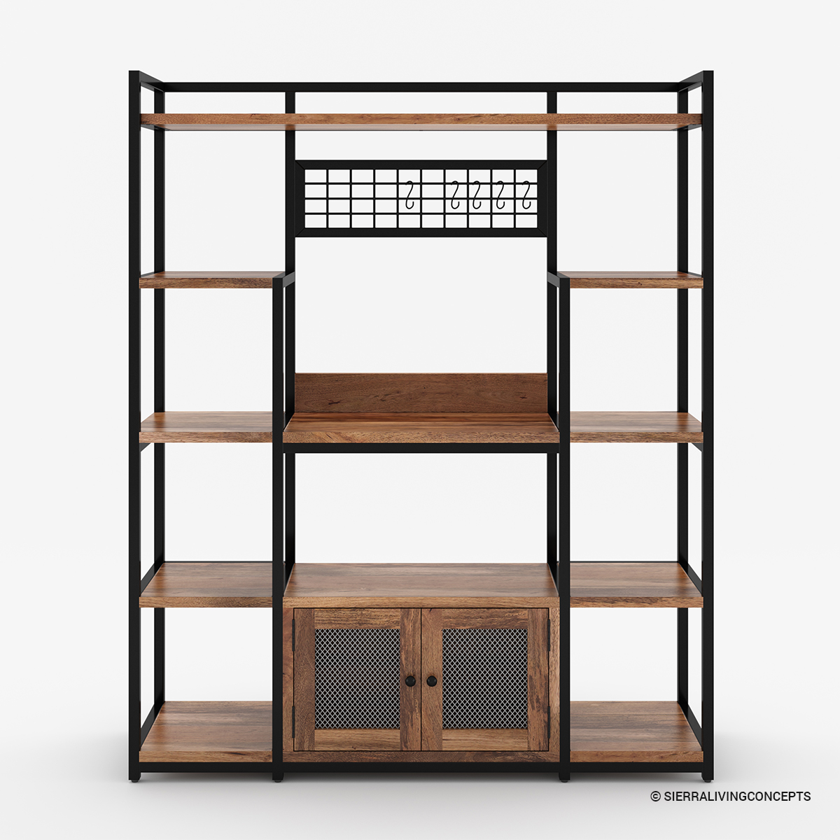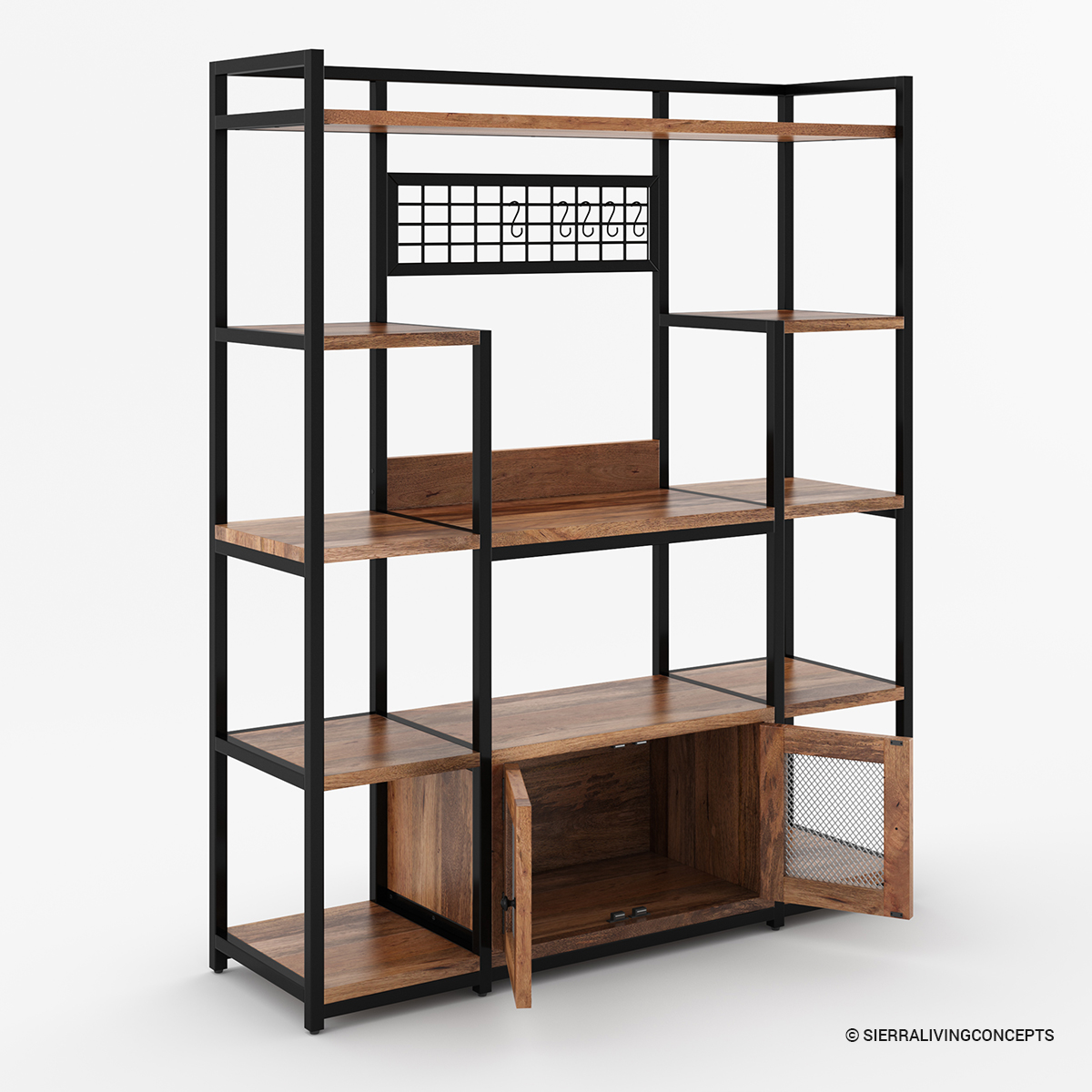 Every homemaker’s dream functional piece, our Starke 5 Shelf Traditional Kitchen Bakers Rack with Storage is here to change your kitchen for the better. Made with a mix of classic solid wood and wrought iron, this industrial bakers rack gives you plenty of storage space with 5 shelves. It features mesh accents, hooks, and hidden compartments, adding both style and great convenience to your home.