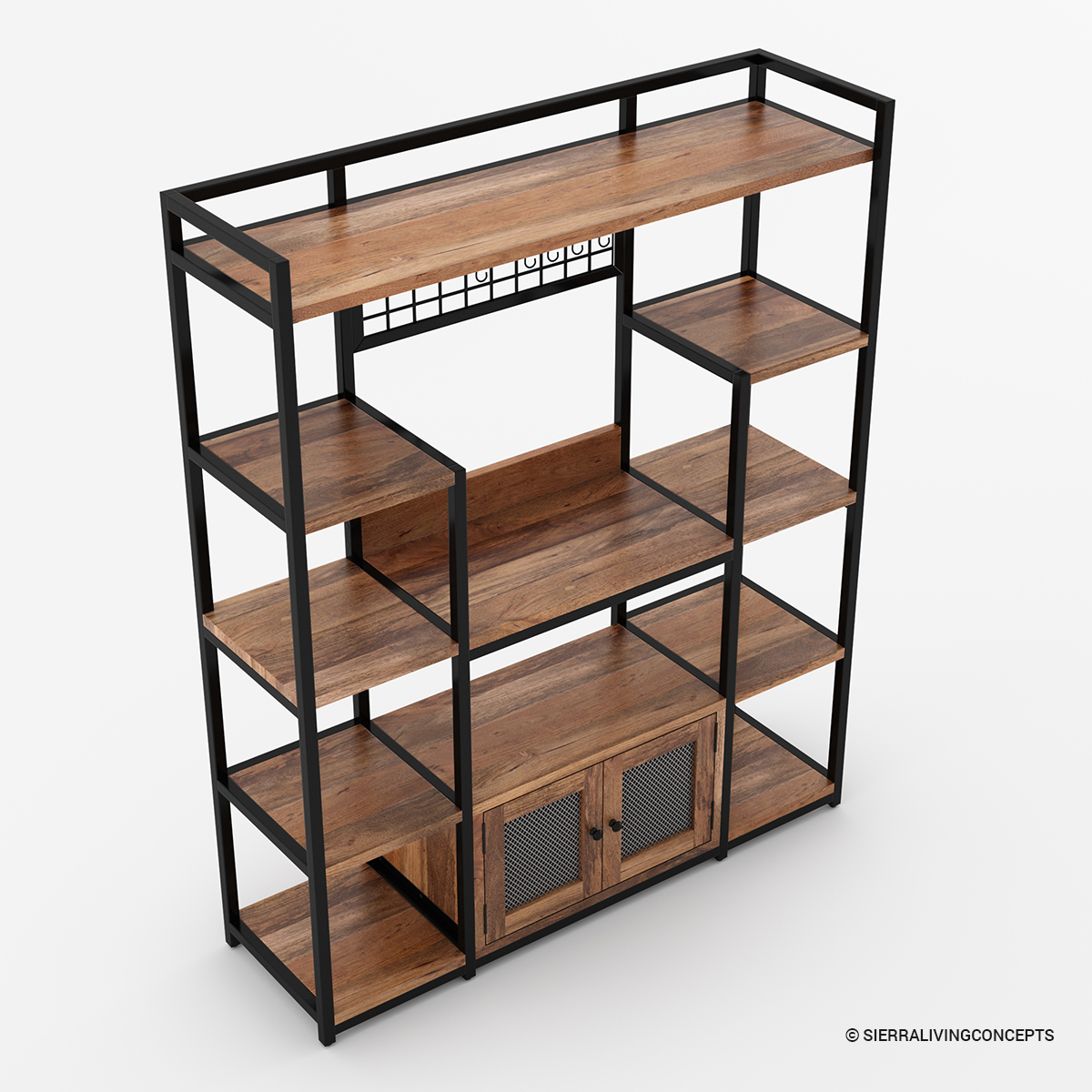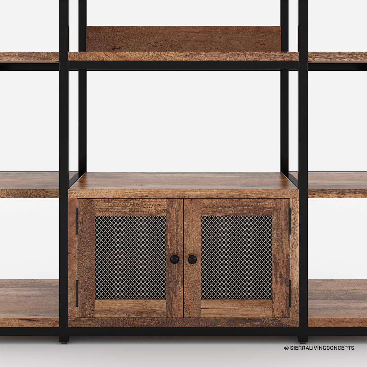 • The bottom two tiers offer a large shelf for microwaves and plates, plus a closed mesh cabinet and side shelves for hidden storage.