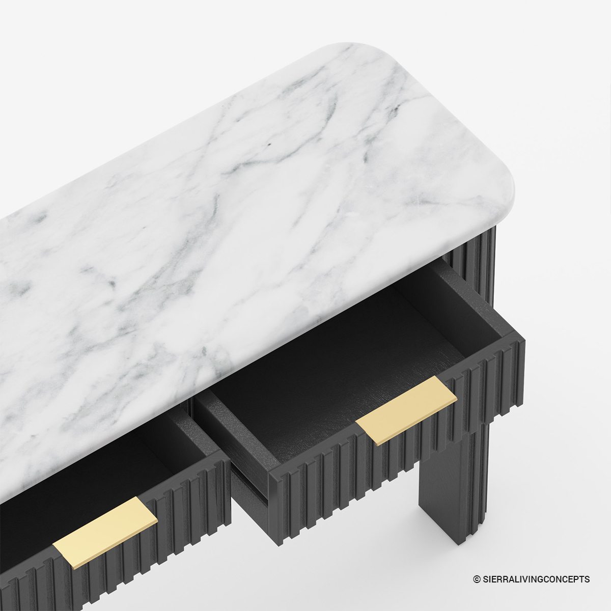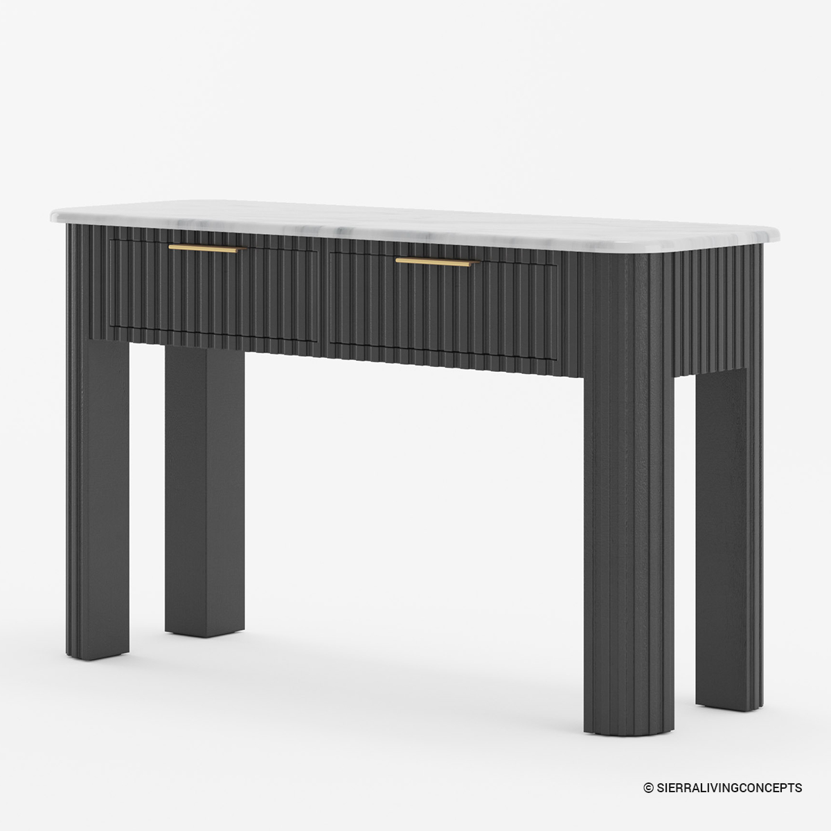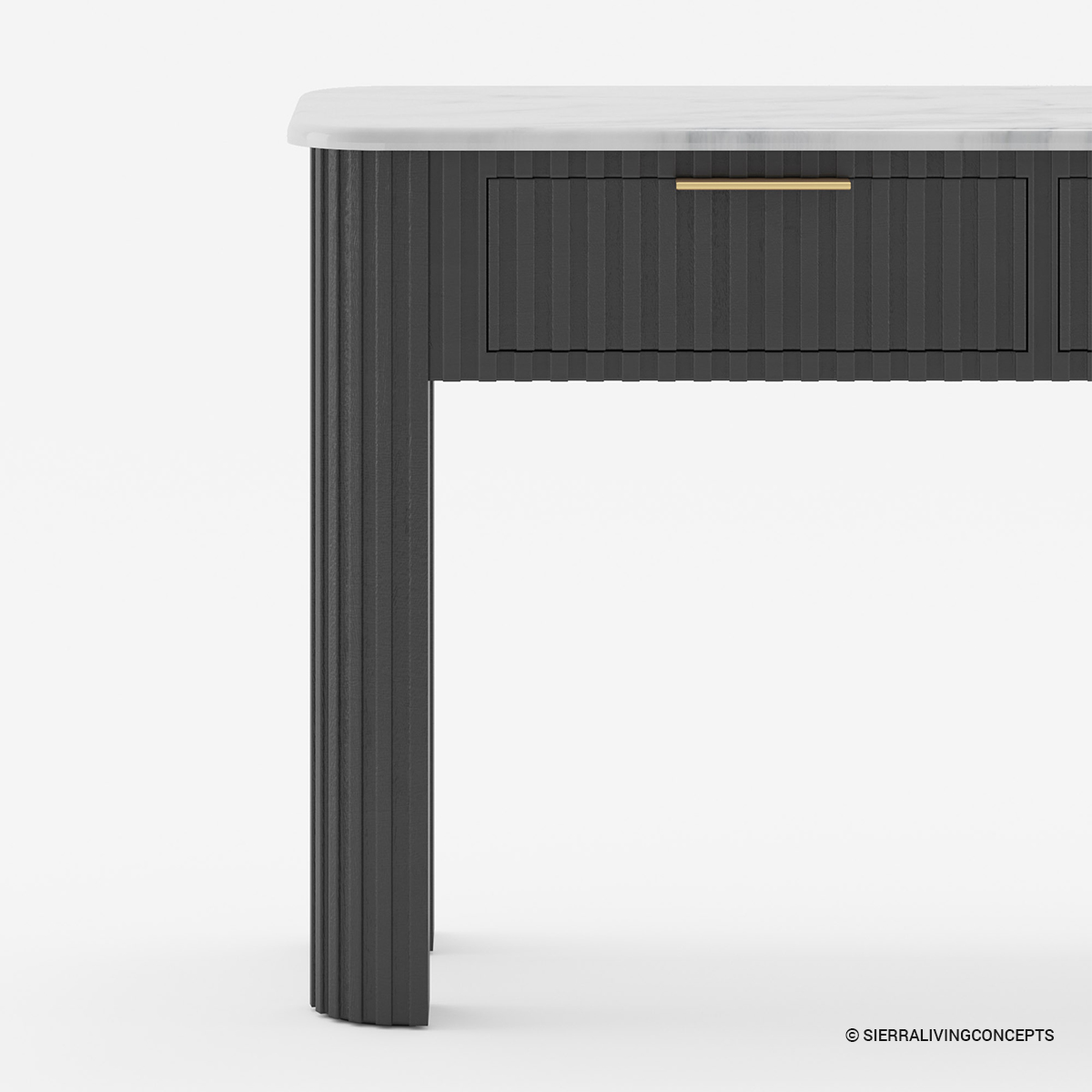 The perfect entrance needs the perfect accent piece, and our Rome Marble Top Fluted Modern Black Makeup Vanity Desk delivers just that. This fluted makeup vanity desk with drawers has a striking black design or a large white marble top, giving you plenty of space to decorate. It includes smooth drawers for handy storage, and its strong legs or gold accents adding both style and long-lasting quality to this modern black console table with a marble top.