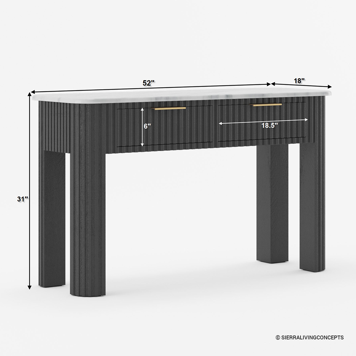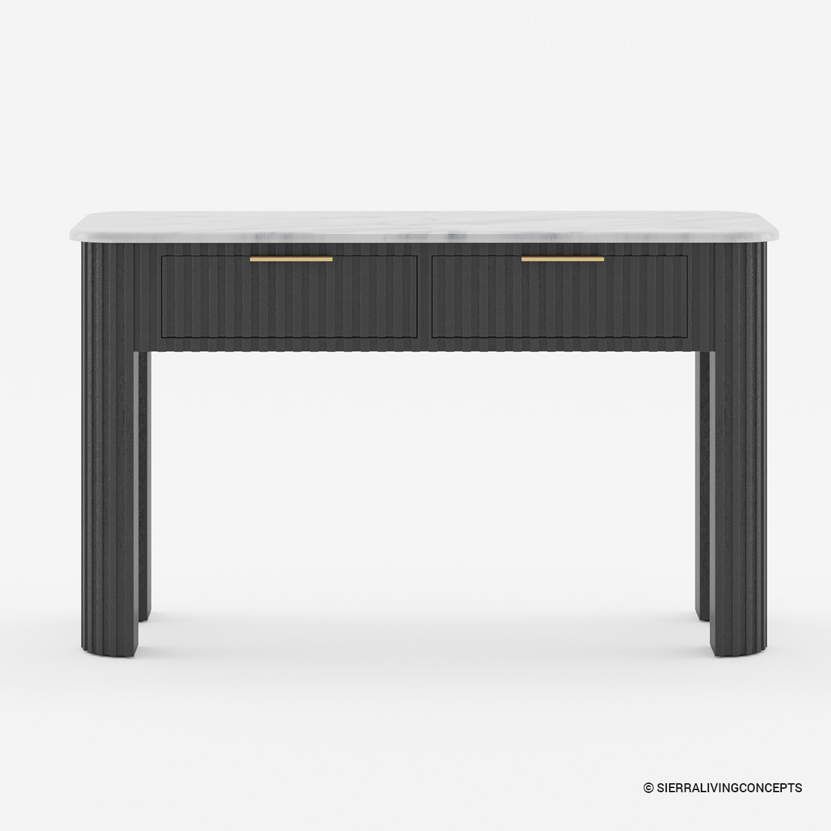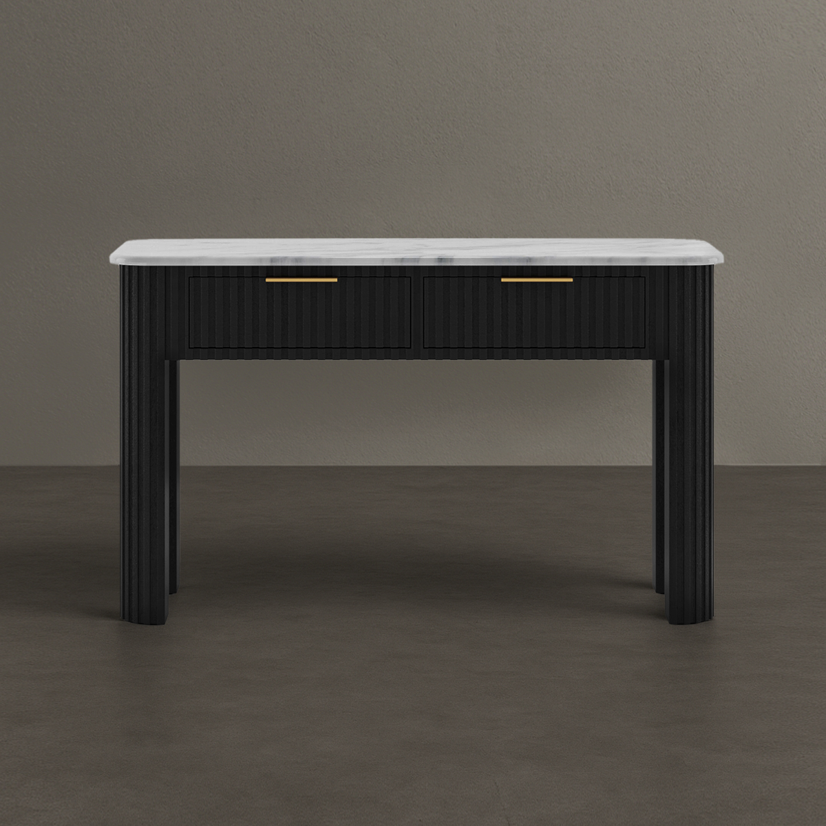 The perfect entrance needs the perfect accent piece, and our Rome Marble Top Fluted Modern Black Makeup Vanity Desk delivers just that. This fluted makeup vanity desk with drawers has a striking black design or a large white marble top, giving you plenty of space to decorate. It includes smooth drawers for handy storage, and its strong legs or gold accents adding both style and long-lasting quality to this modern black console table with a marble top.