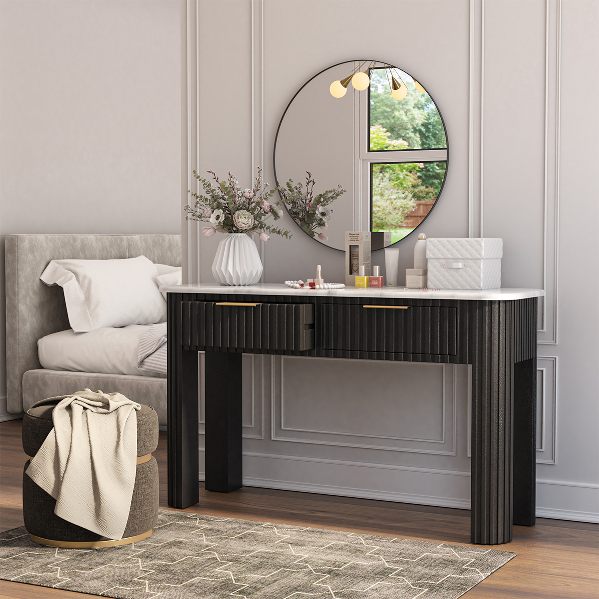• Bold and beautiful, the striking black hue, and marble countertop of this modern makeup vanity desk are complemented by classic fluted detail to add a touch to any interior.