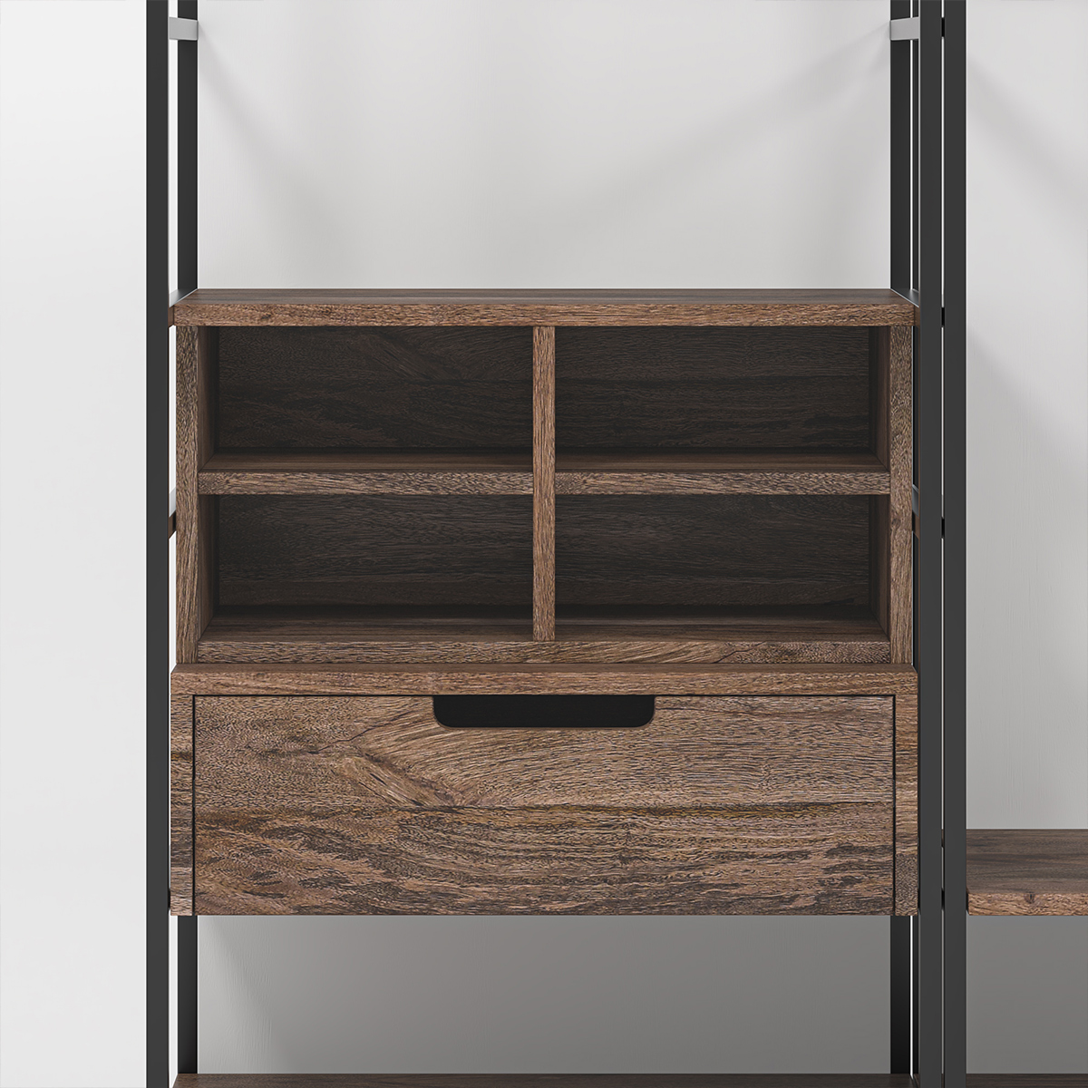 • Rightmost section features hanging rod, three differently sized drawers, and an open shelf below for baskets or footwear in sturdy industrial design.