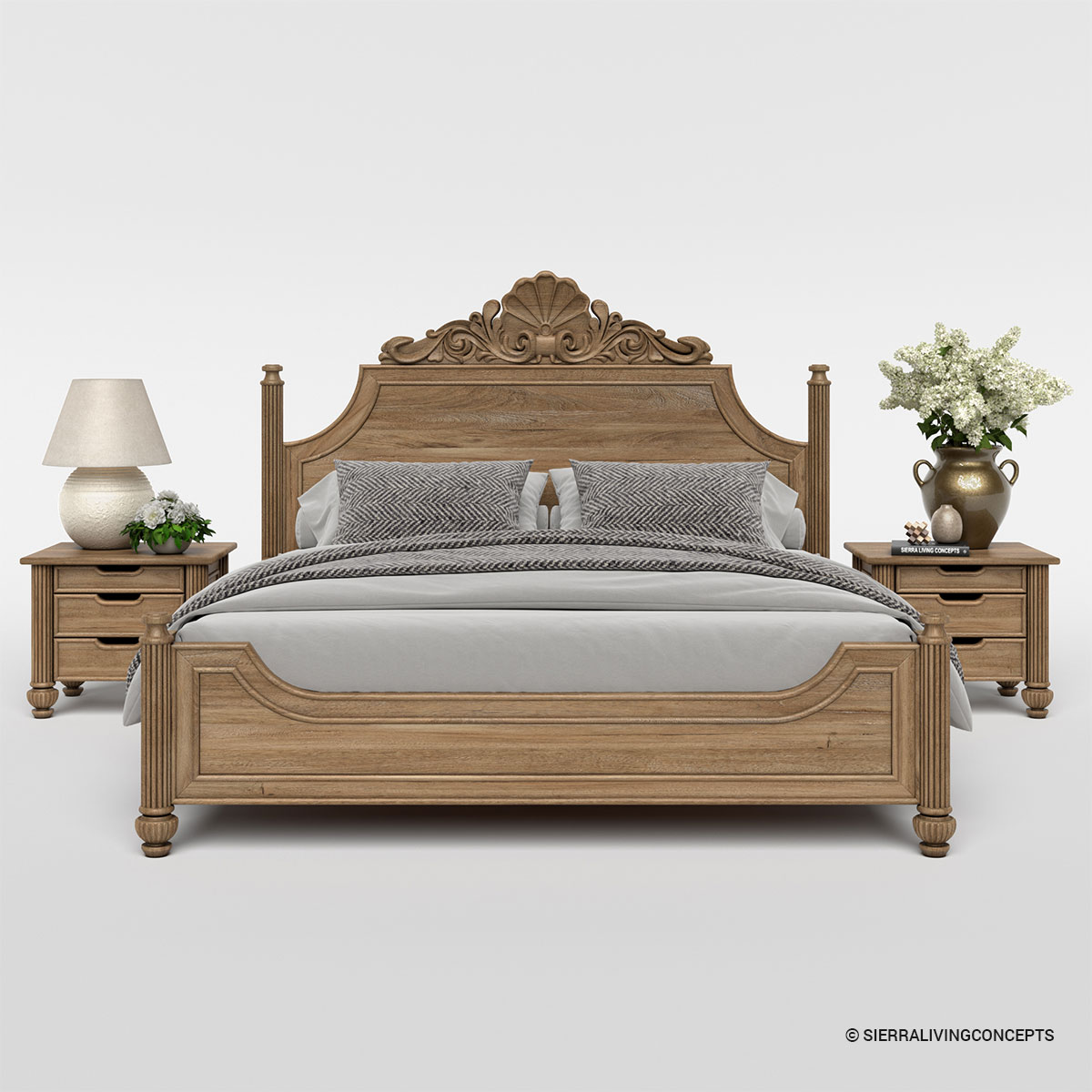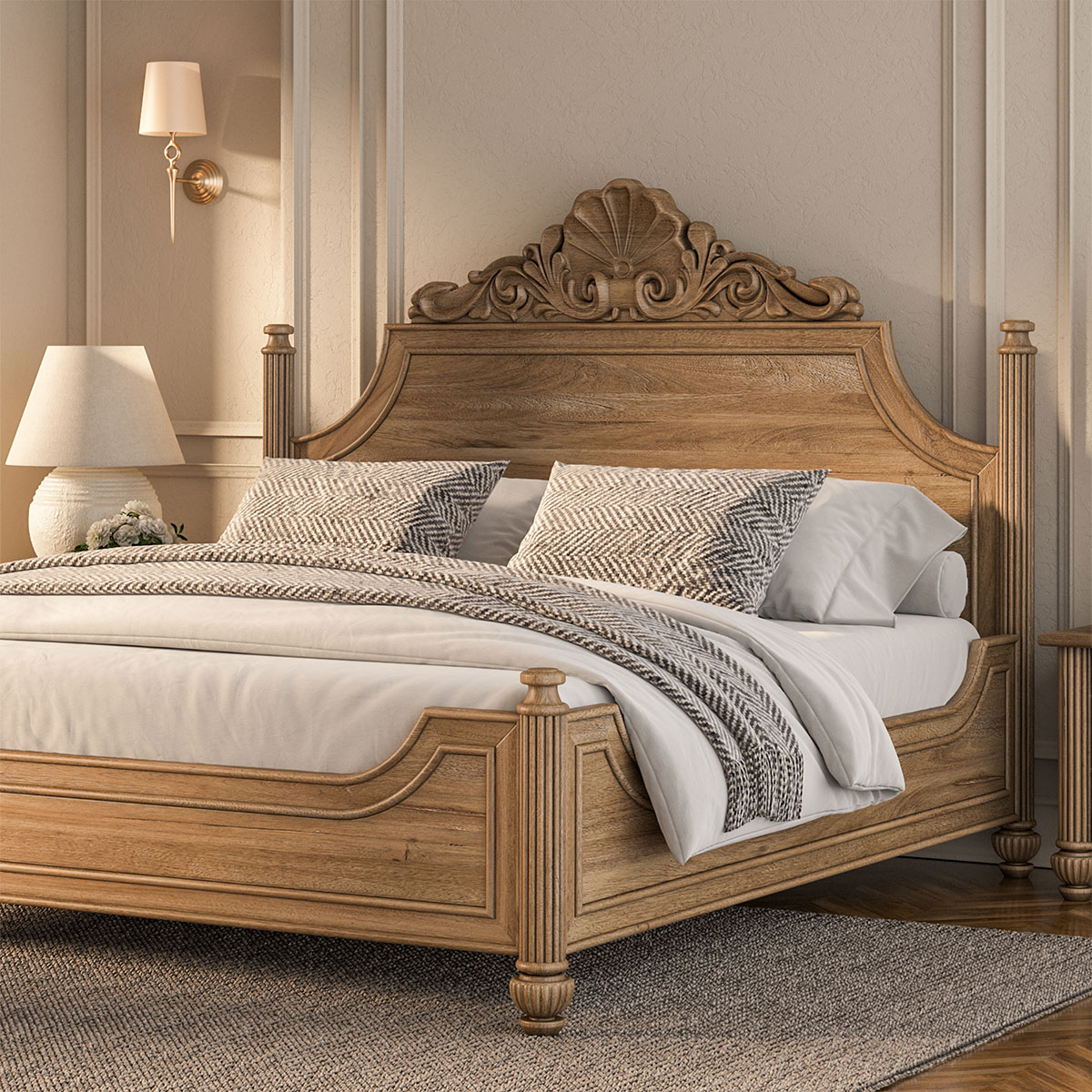 • Featuring swirl carvings, panel detailing, and rich earthy warmth, this solid wood bedroom set brings refined, artisan-crafted elegance.