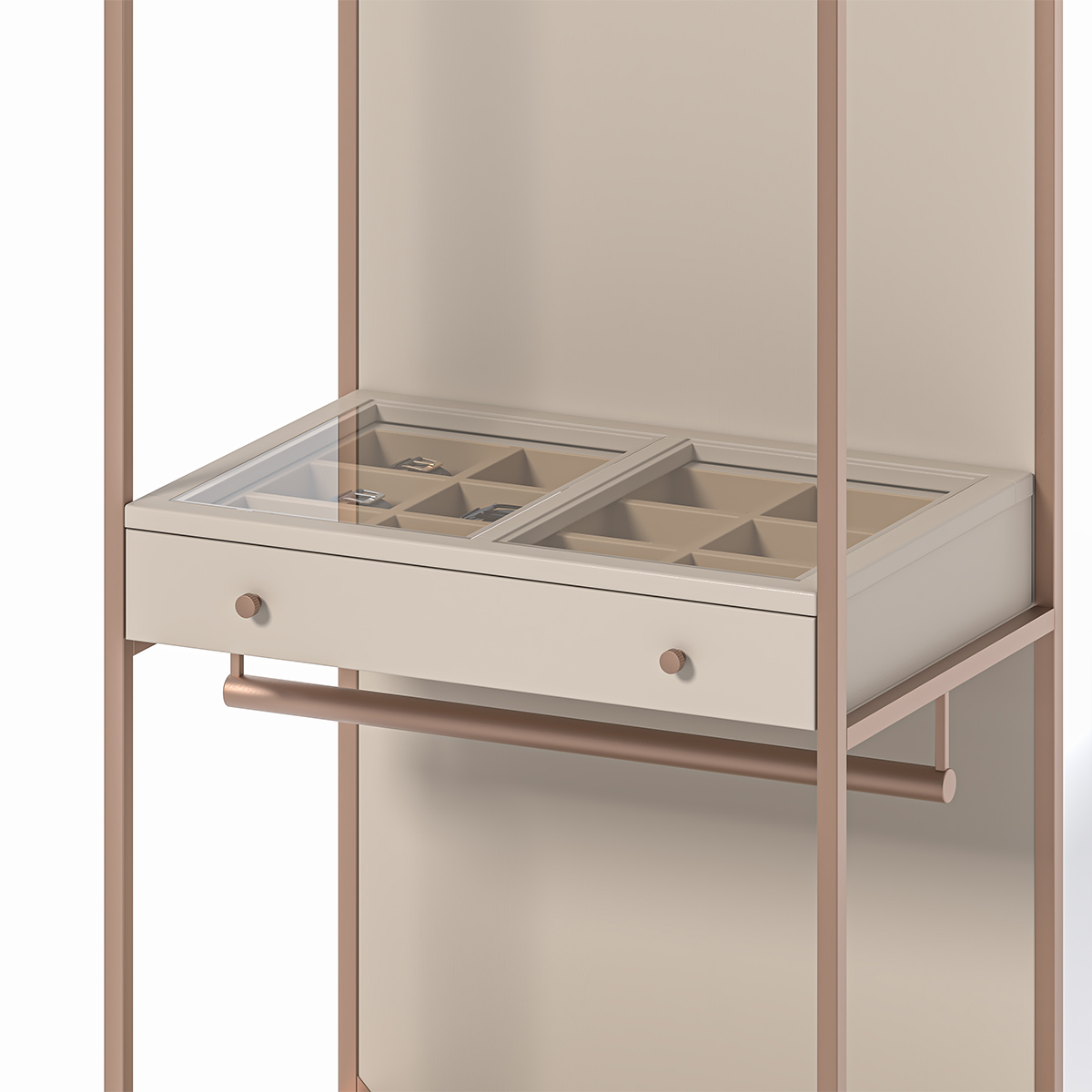 • Organize efficiently with two hanging spaces and a central velvet-lined, glass-topped accessory drawer divided for watches and more.