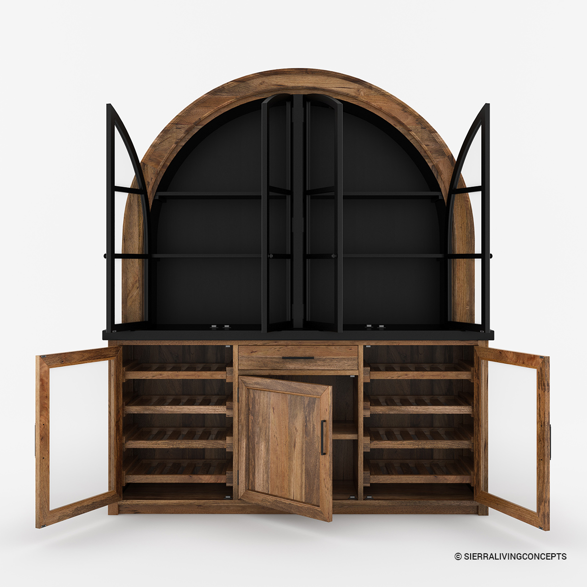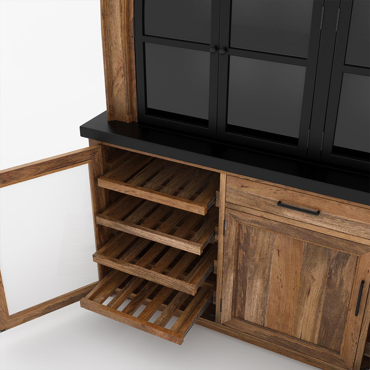 • The lower portion includes two side display cabinets, each with four smooth-glide pull-out wine trays on iron channels for effortless bottle organization and access.