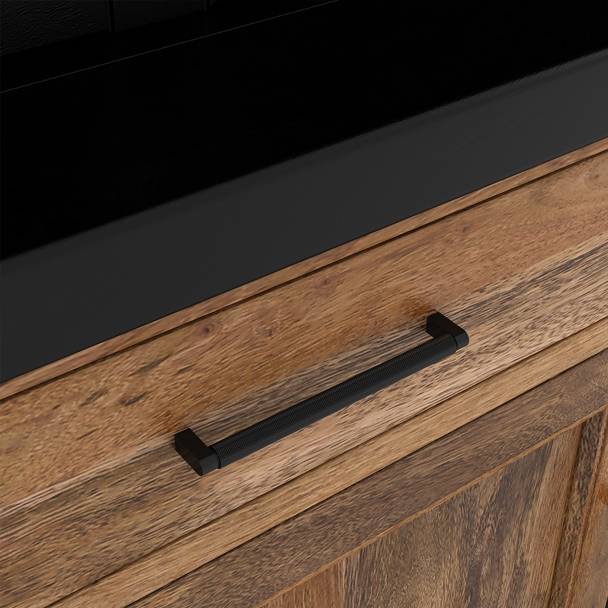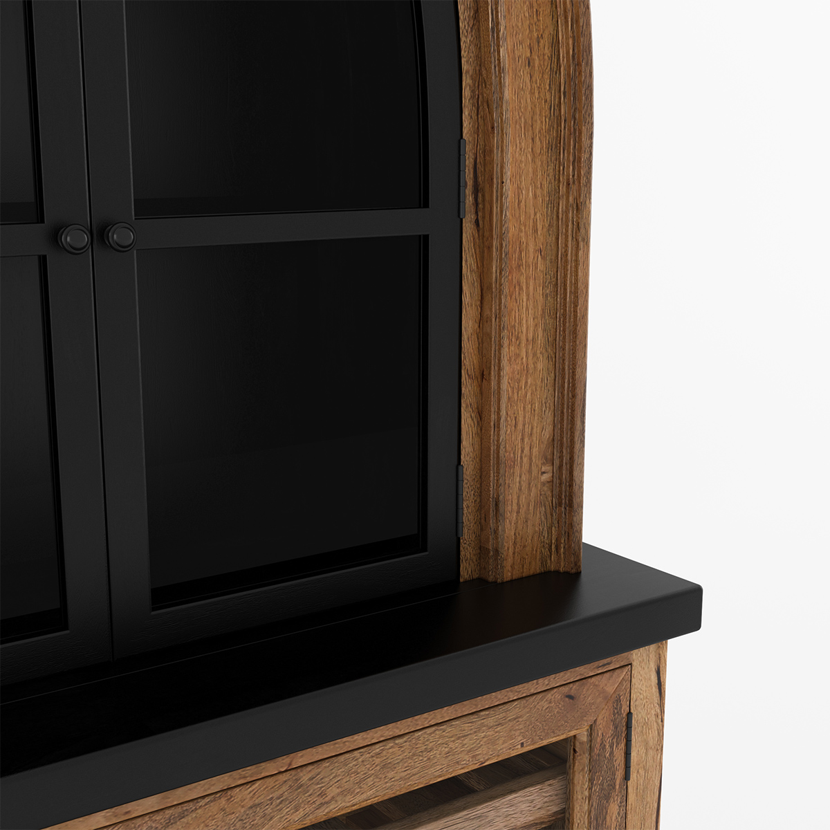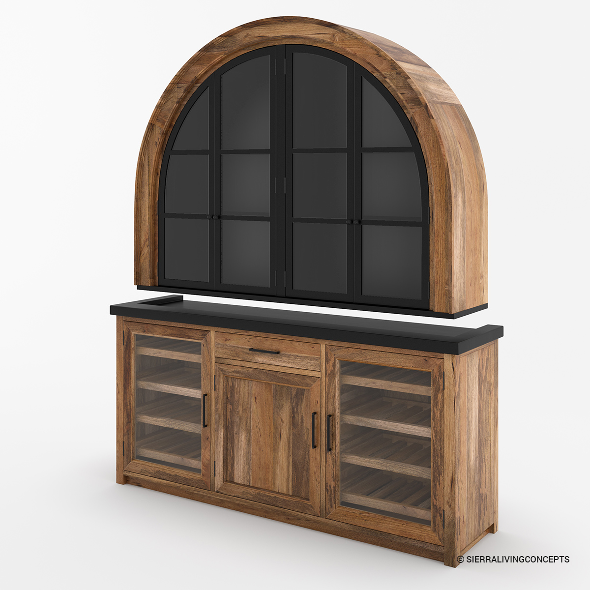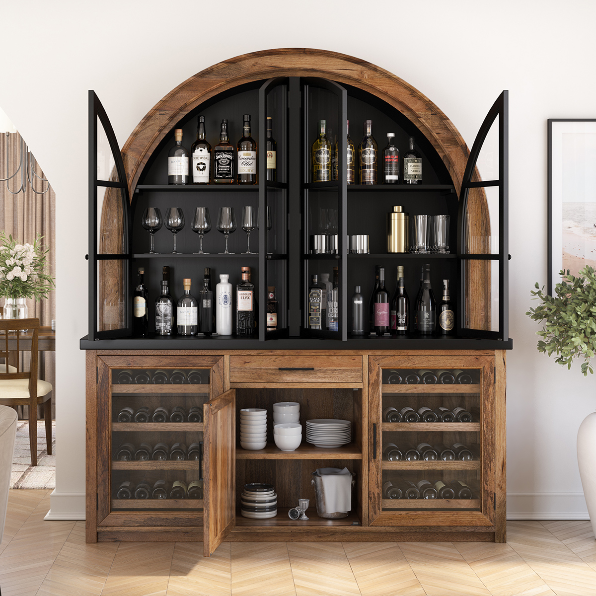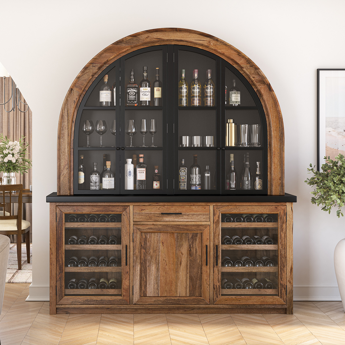• Featuring a grand arched silhouette with bold paneling, this bar hutch cabinet is finished in two-tone rustic wood and black, creating a dramatic, eye-catching focal point.