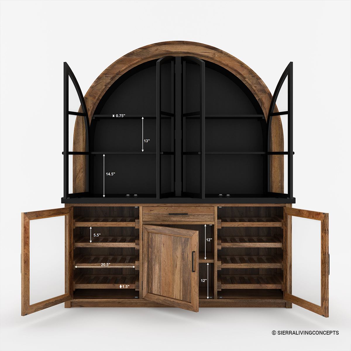 • Styled as a bar cabinet with hutch, the arched upper section features two window‐style dual glass door cabinets, each with two removable shelves for customizable displays of spirits or collectibles.