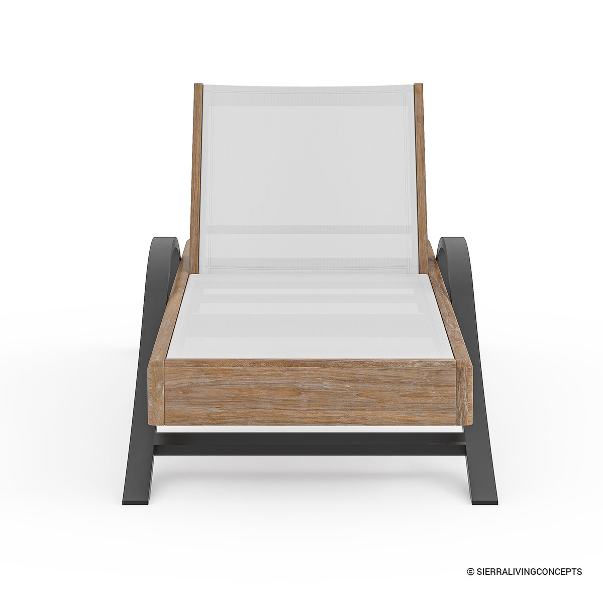 • With a mixed-material style, this teak chaise lounge combines natural wood textures with a matte black undercarriage and a light sling fabric for a crisp, modern outdoor appeal.