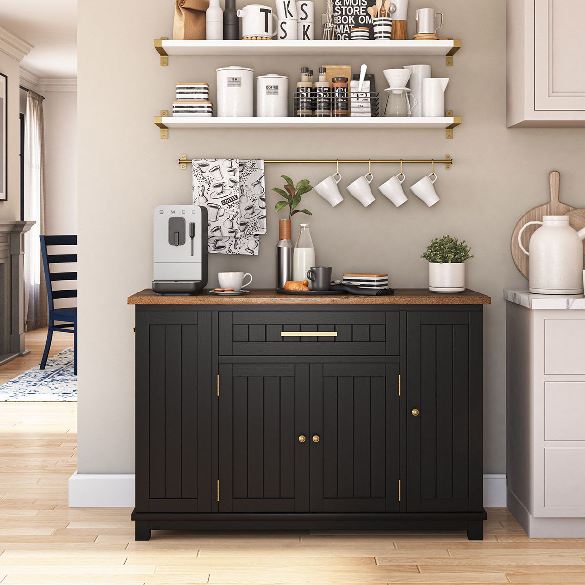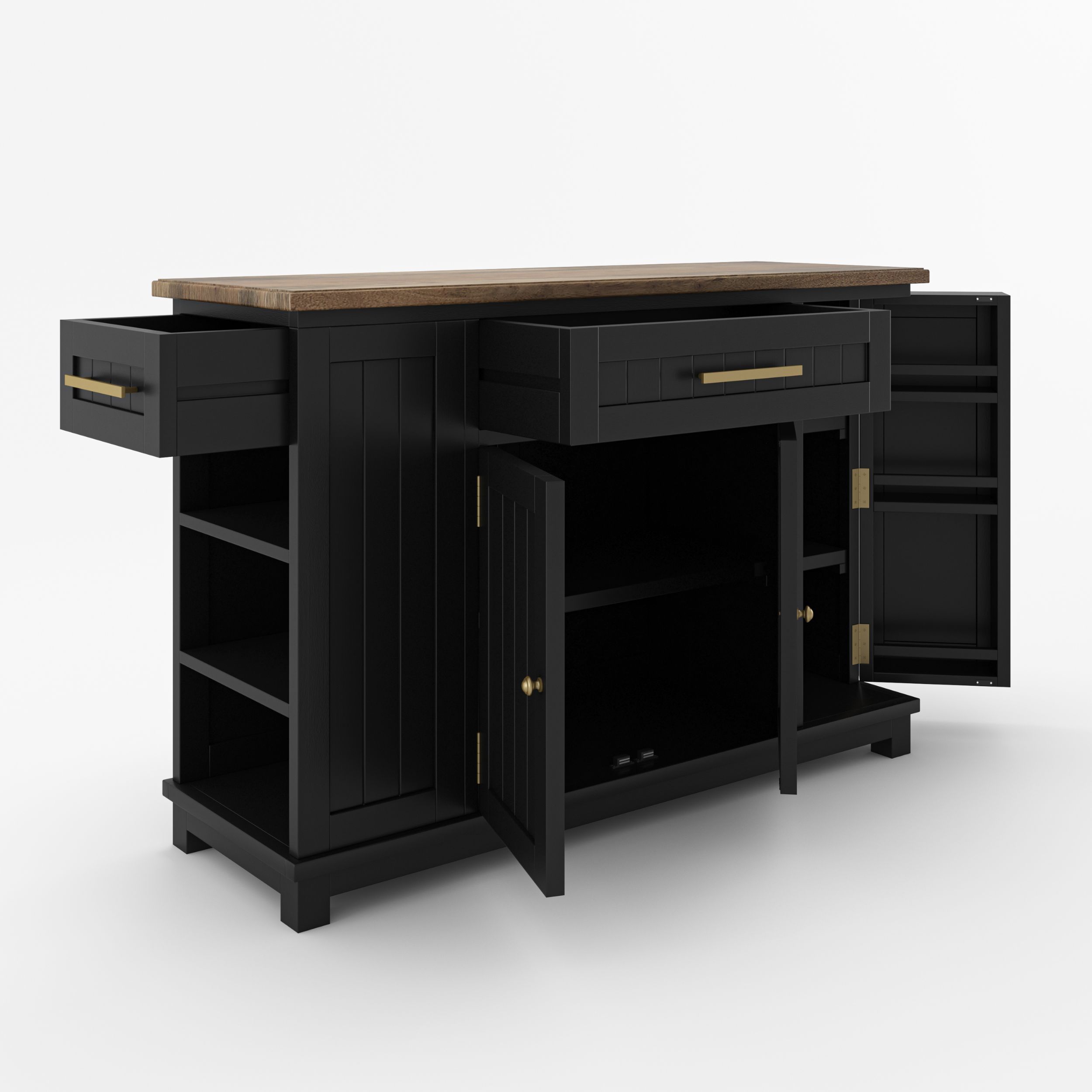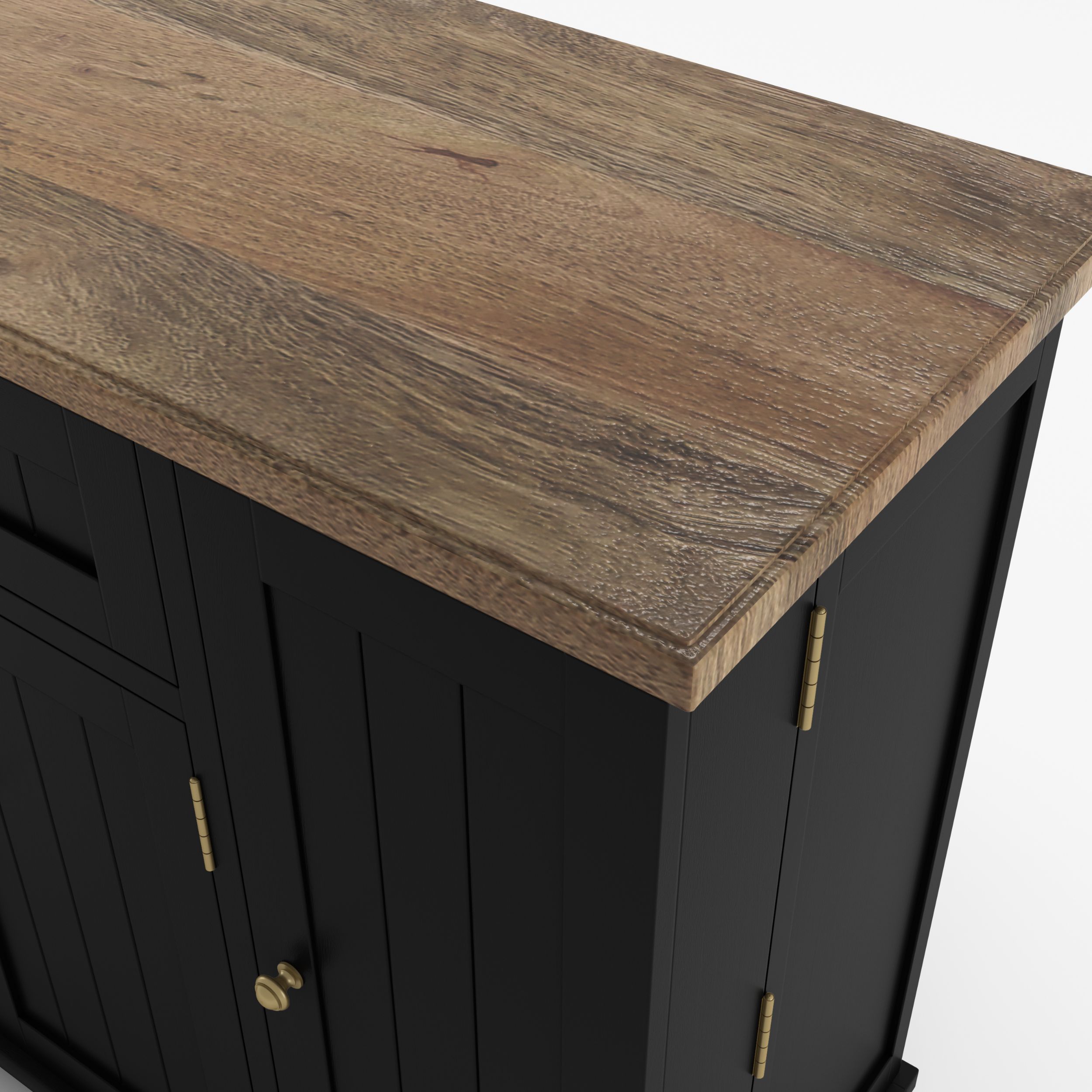 Complement your favorite kitchen pieces with our Renie Modern Black Kitchen Buffet Island Cabinet, which melds modern farmhouse charm with clever storage. With its sleek black beadboard panels, warm natural wood top, and versatile customizable features, this island base cabinet adds both elegance and everyday practicality to your space.