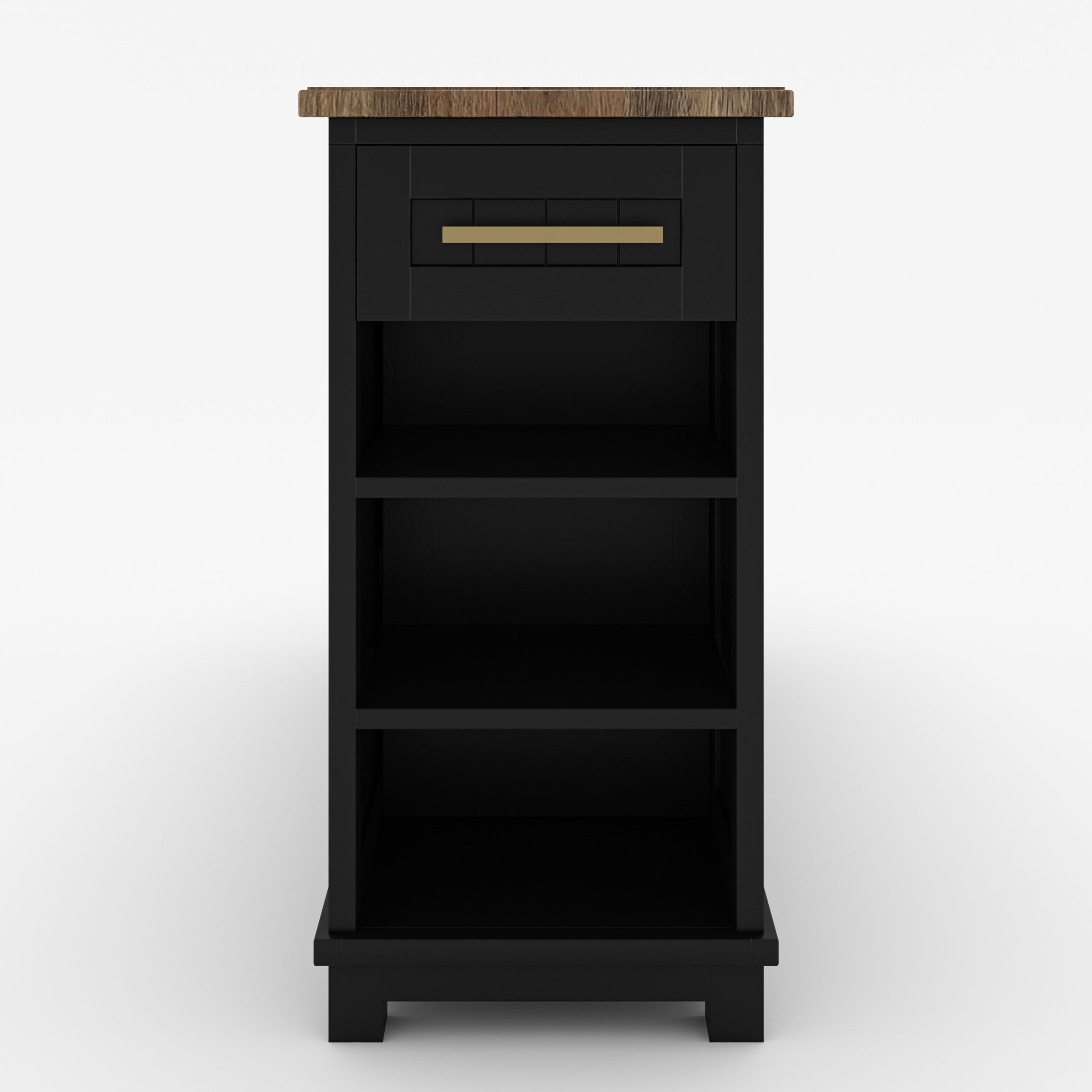 • The cabinet island's timeless beauty is enhanced by elegant beadboard paneling and a matte black finish, which is perfectly balanced by the warmth of the natural wood top.