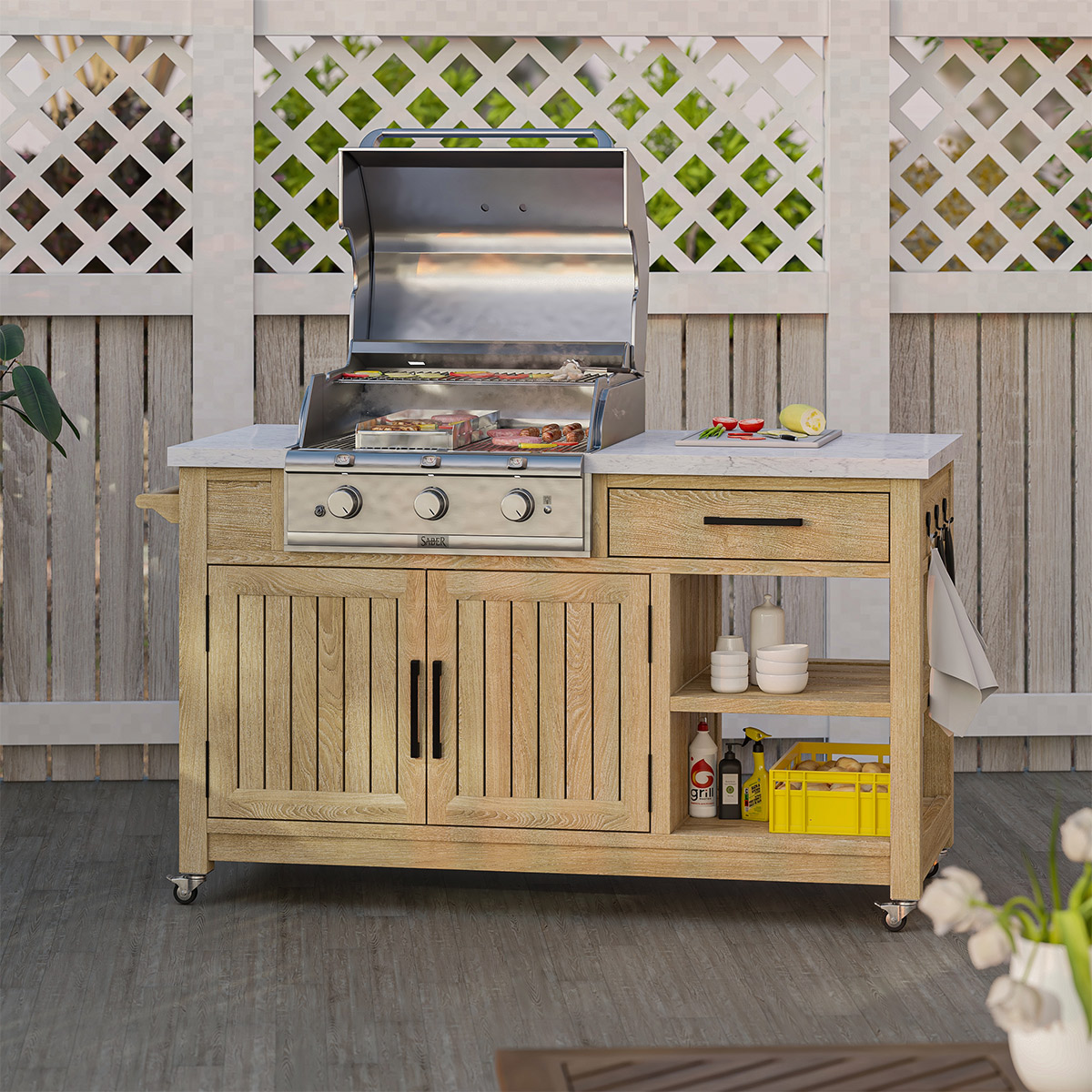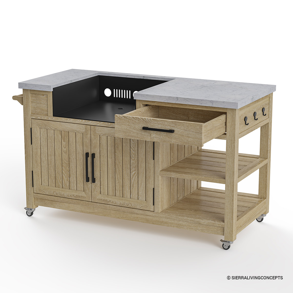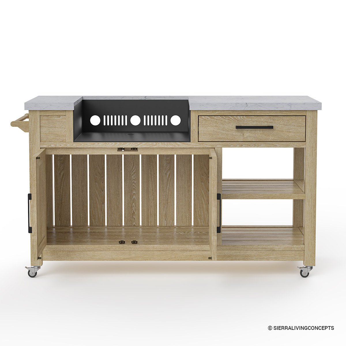 • A sleek outdoor grill space cart with storage, it combines cooking and organizing in one, featuring a light wood body and marble counter to elevate your open-air culinary setup.