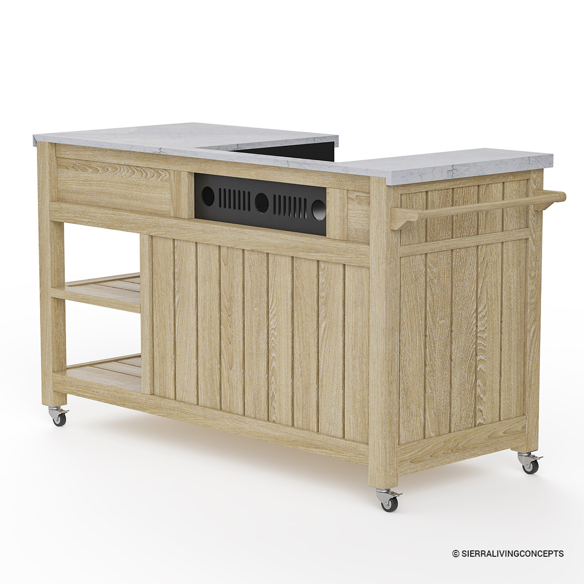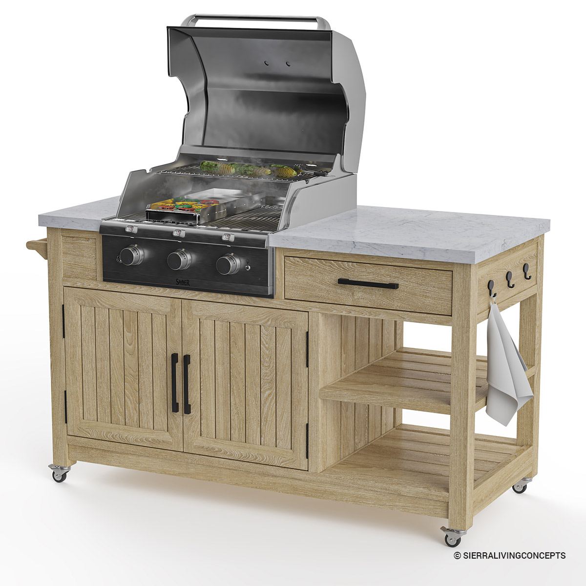 Elevate your next patio gathering or BBQ party with our Bill Outdoor BBQ Kitchen Cart with Storage & BBQ Grill Space that blends rustic charm and modern function. It's a one-of-a-kind outdoor grill cart with storage, prep space, and mobility, made of weather-resistant A-Grade teak and a luxurious marble top.