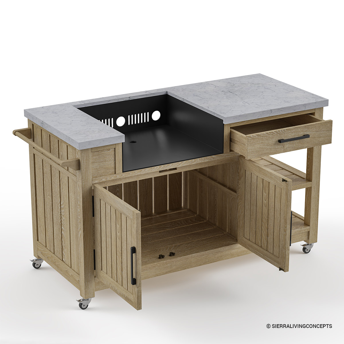 • The marble counter on this outdoor barbecue space cart includes a dedicated 25-inch grill section with cable port and vent for safe BBQ setup, heat dispersion, and ample prep space.