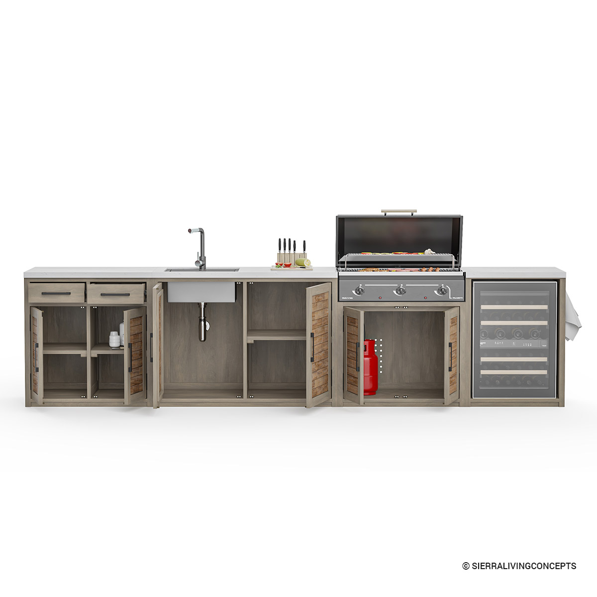 • Completing the set, the final outdoor kitchen storage cabinet includes an under-counter cutout—perfect for installing a wine cooler or mini-fridge in your all-in-one outdoor kitchen station.