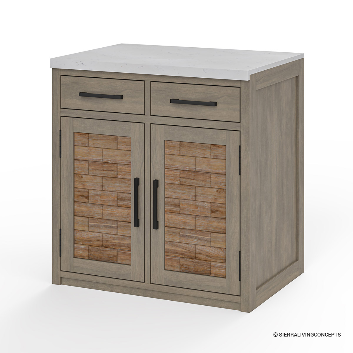 • Create a custom cooking space with these 4-piece modular outdoor kitchen cabinets, featuring marble countertops, driftwood finishes, and stone-textured doors for a premium outdoor kitchen setup.
