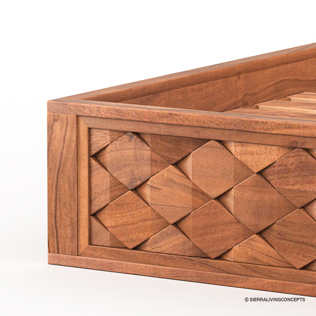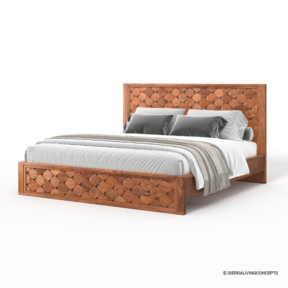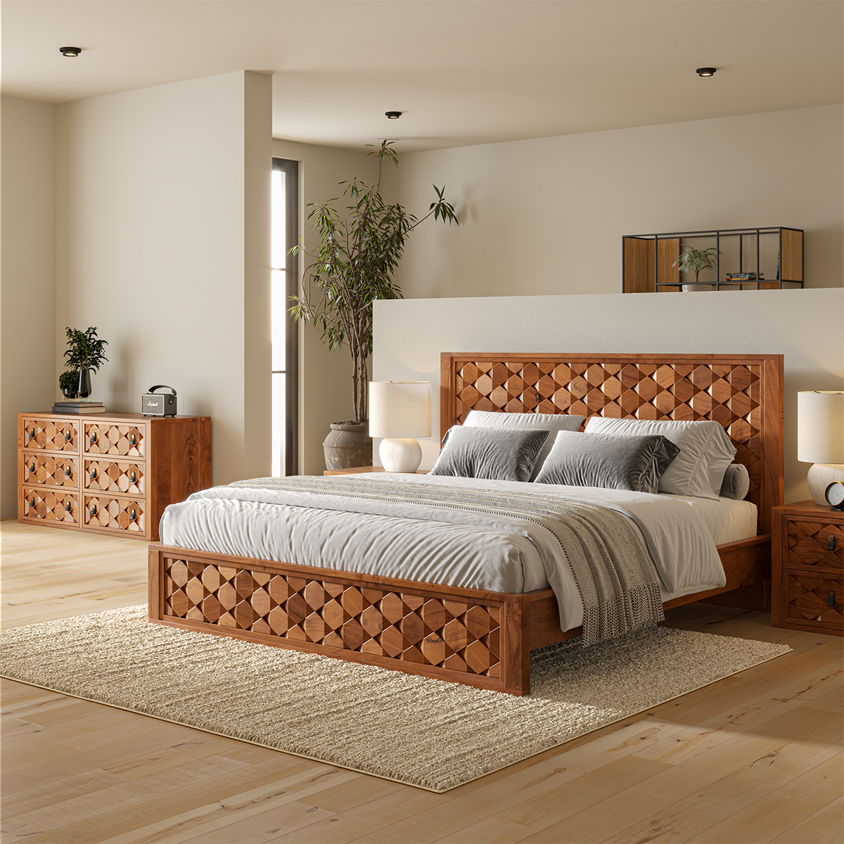 • The unique hand-carved concave hexagon weave pattern geometric design, creating a stunning textured look in a warm, natural finish, is what sets this wooden bedroom set apart.