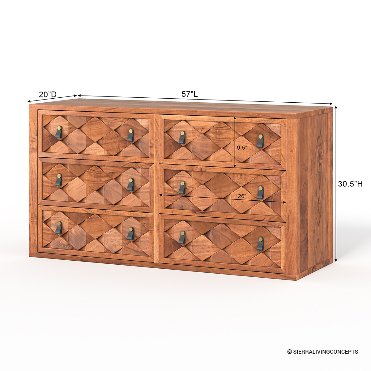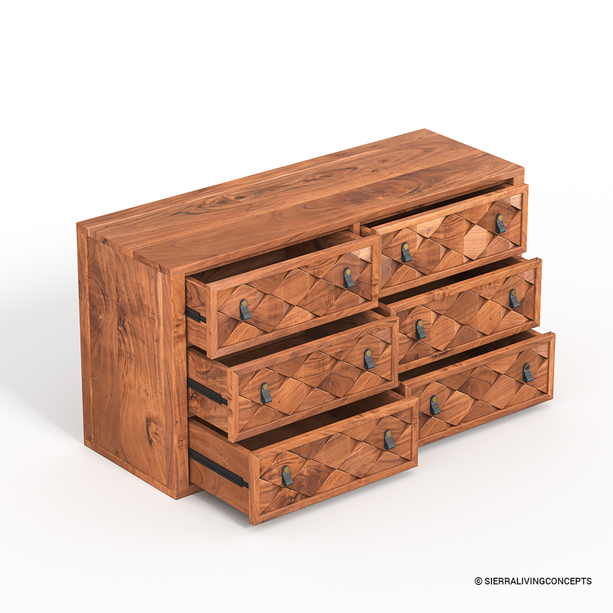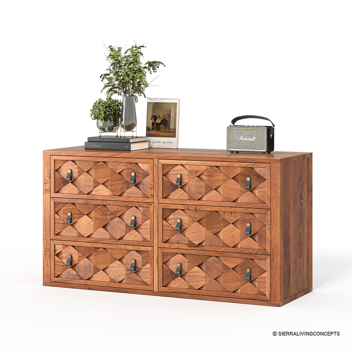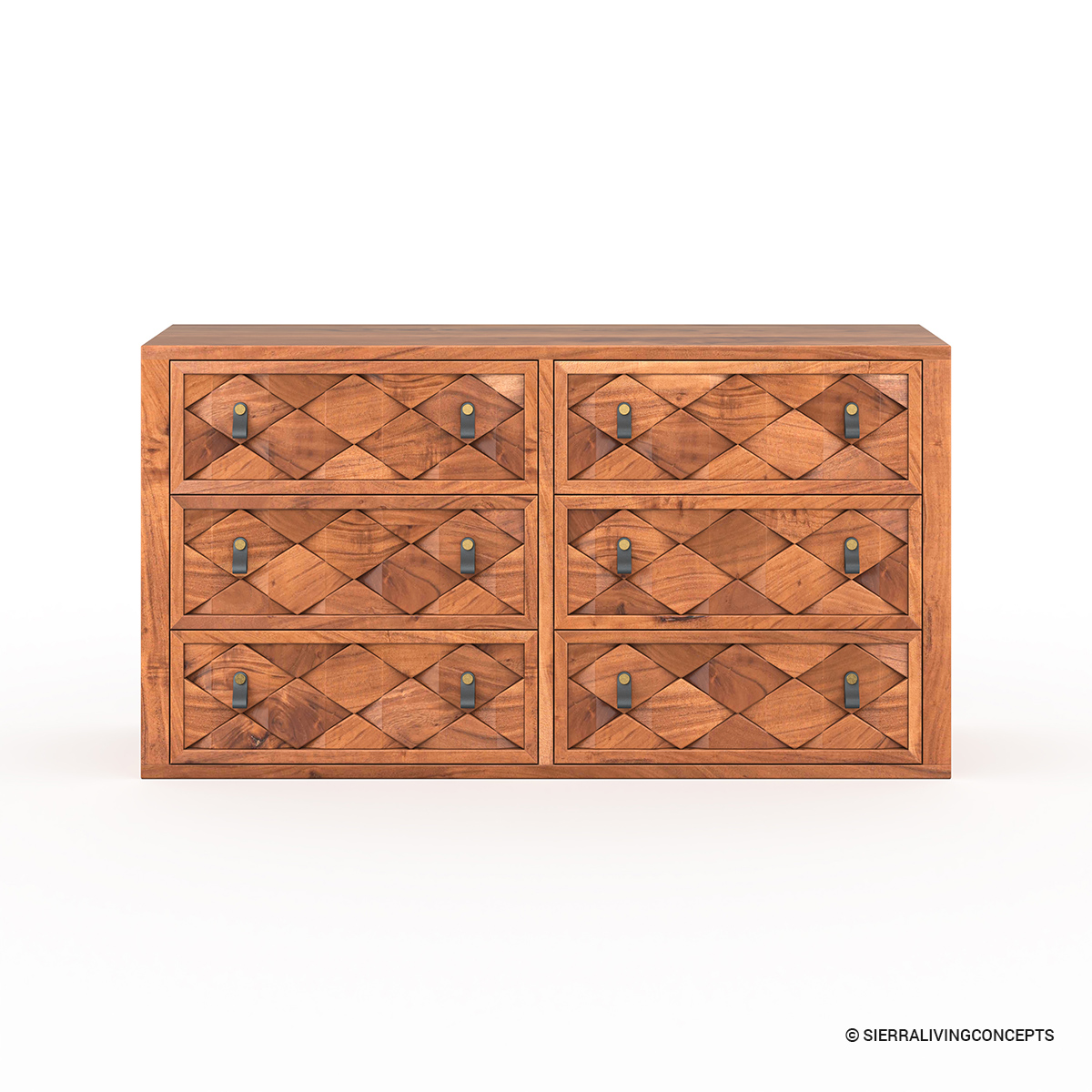 • The drawer fronts stand out with a hand-carved geometric hexagon weaving pattern, giving this dresser with 6 drawers deep texture, all finished in a natural tone that highlights the wood grain.