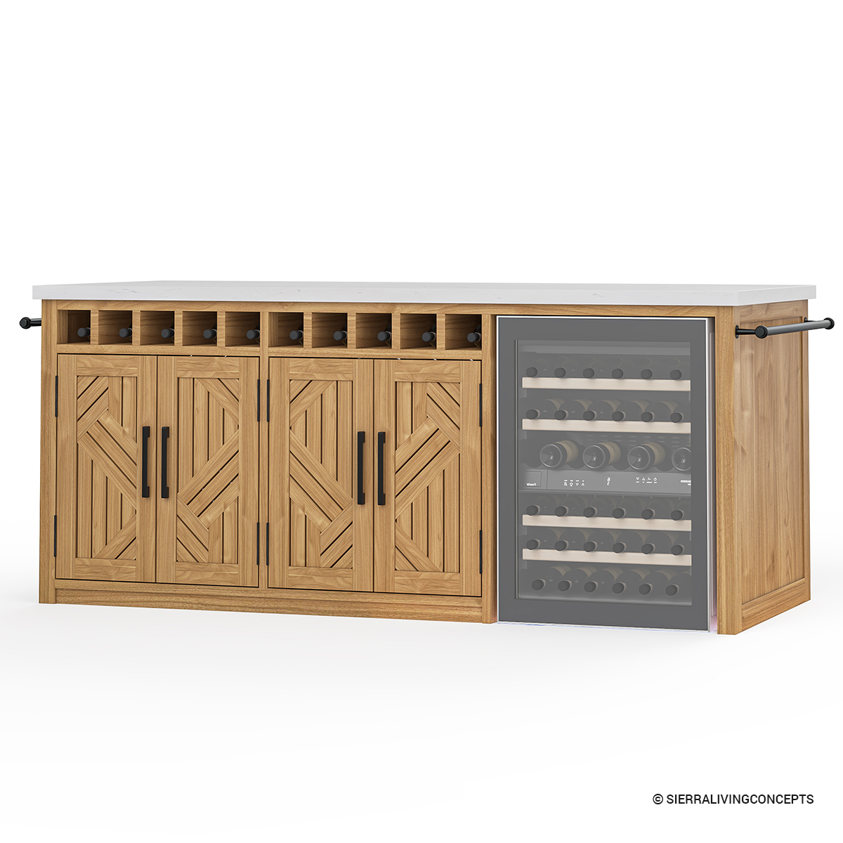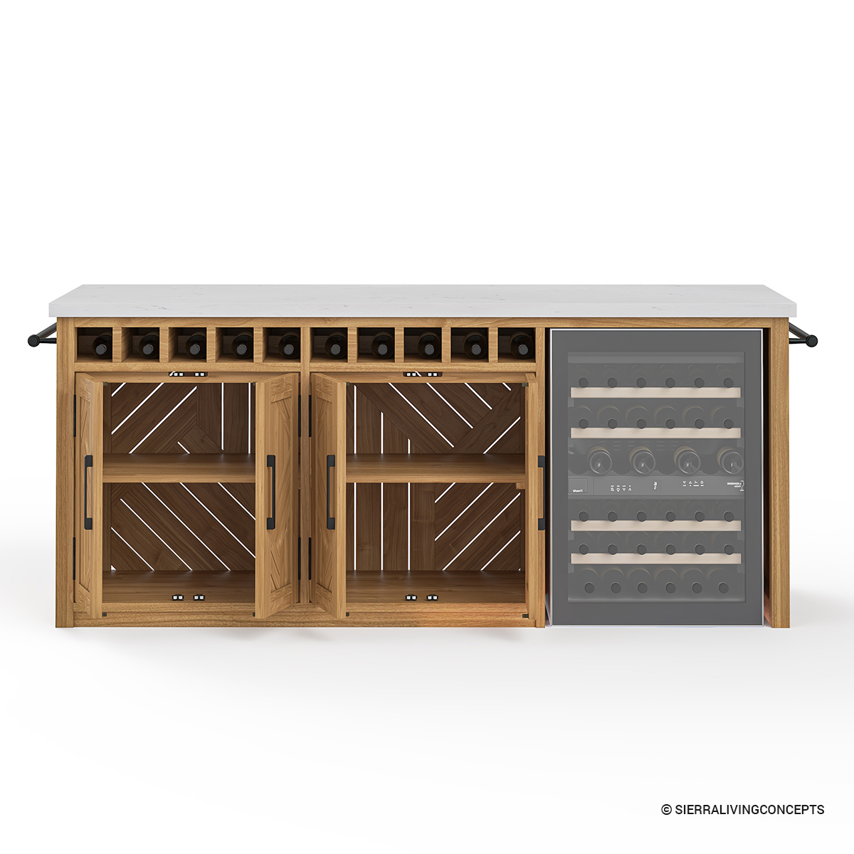 • Storage made smart, with ten wine cubbies, dual-door cabinets with interior shelving, and an open slot specially designed for seamless beverage fridge installation in your outdoor kitchen bar island.