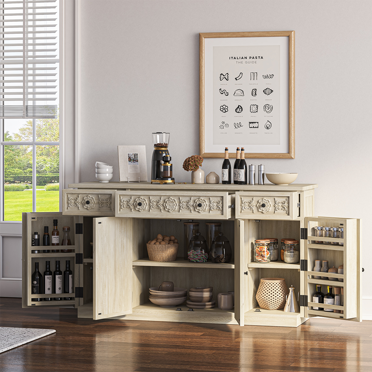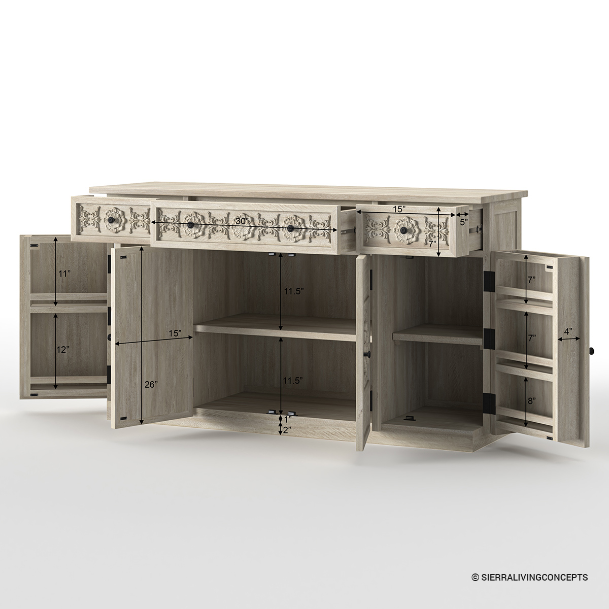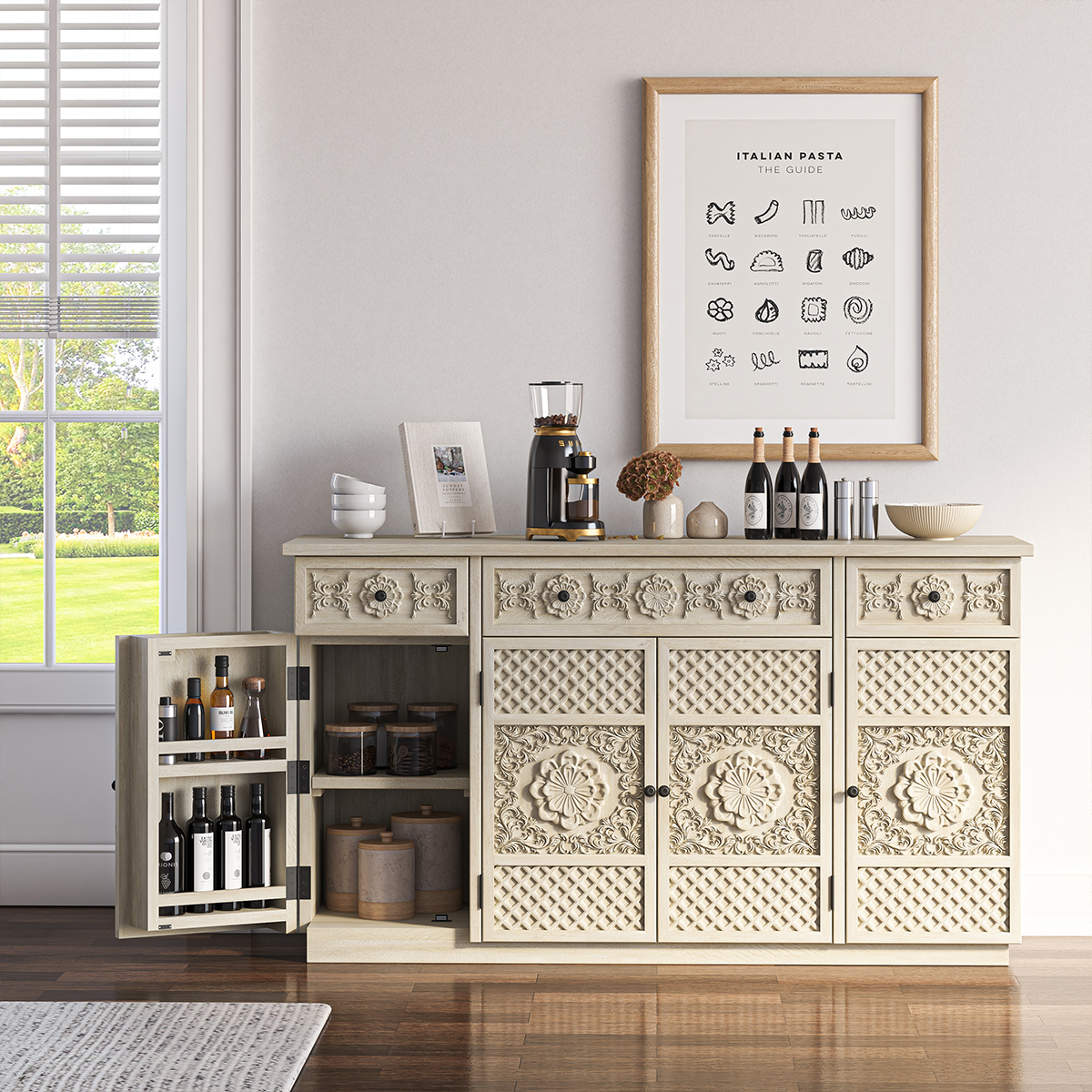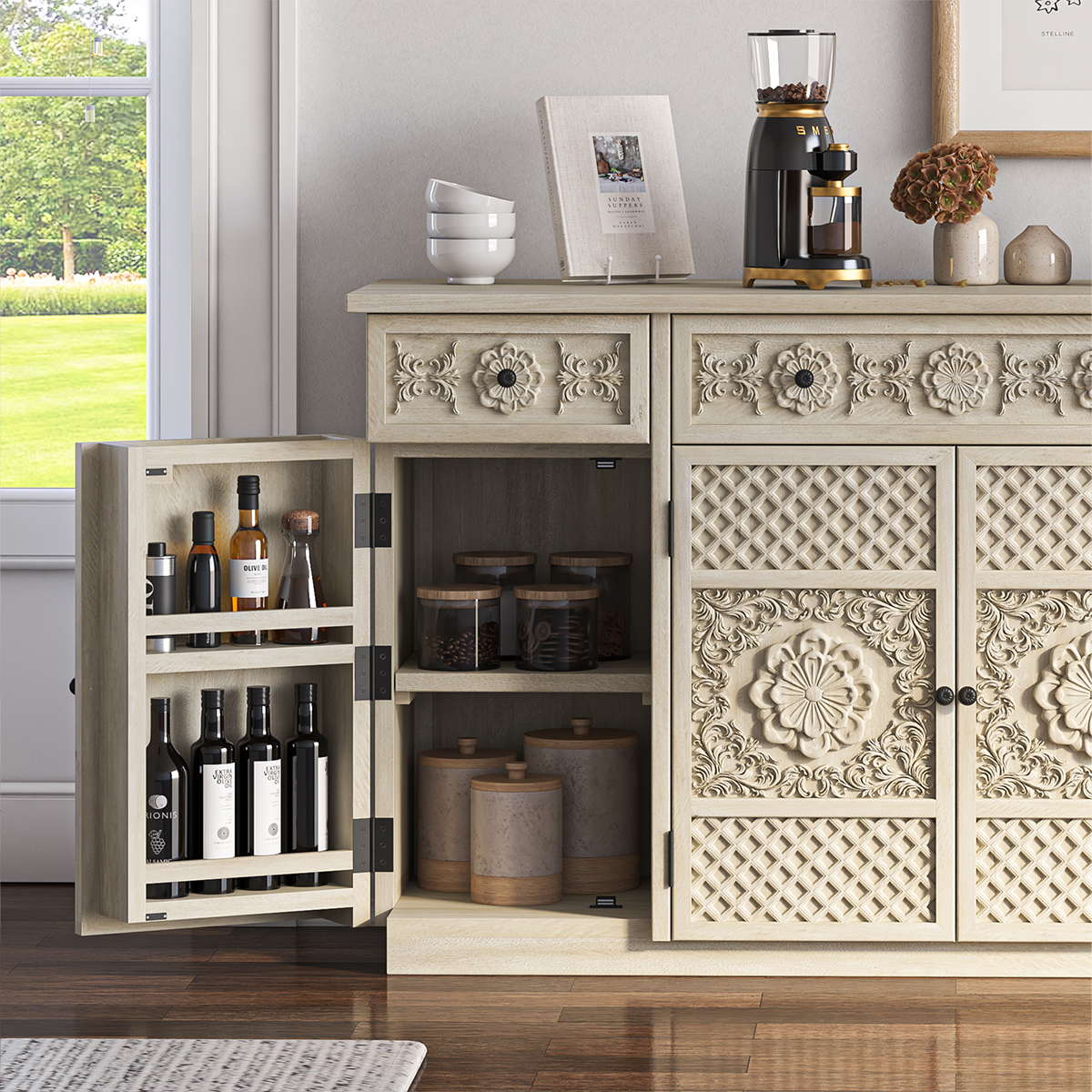 Bring charm, order, and artistry into your kitchen with our Nuala Hand Carved Solid Wood Kitchen Buffet Island Cabinet. Whether you're casually baking on the weekend or serving at a dinner party, this solid wood buffet island offers an inviting, clutter-free space that is as practical as it is stunning.