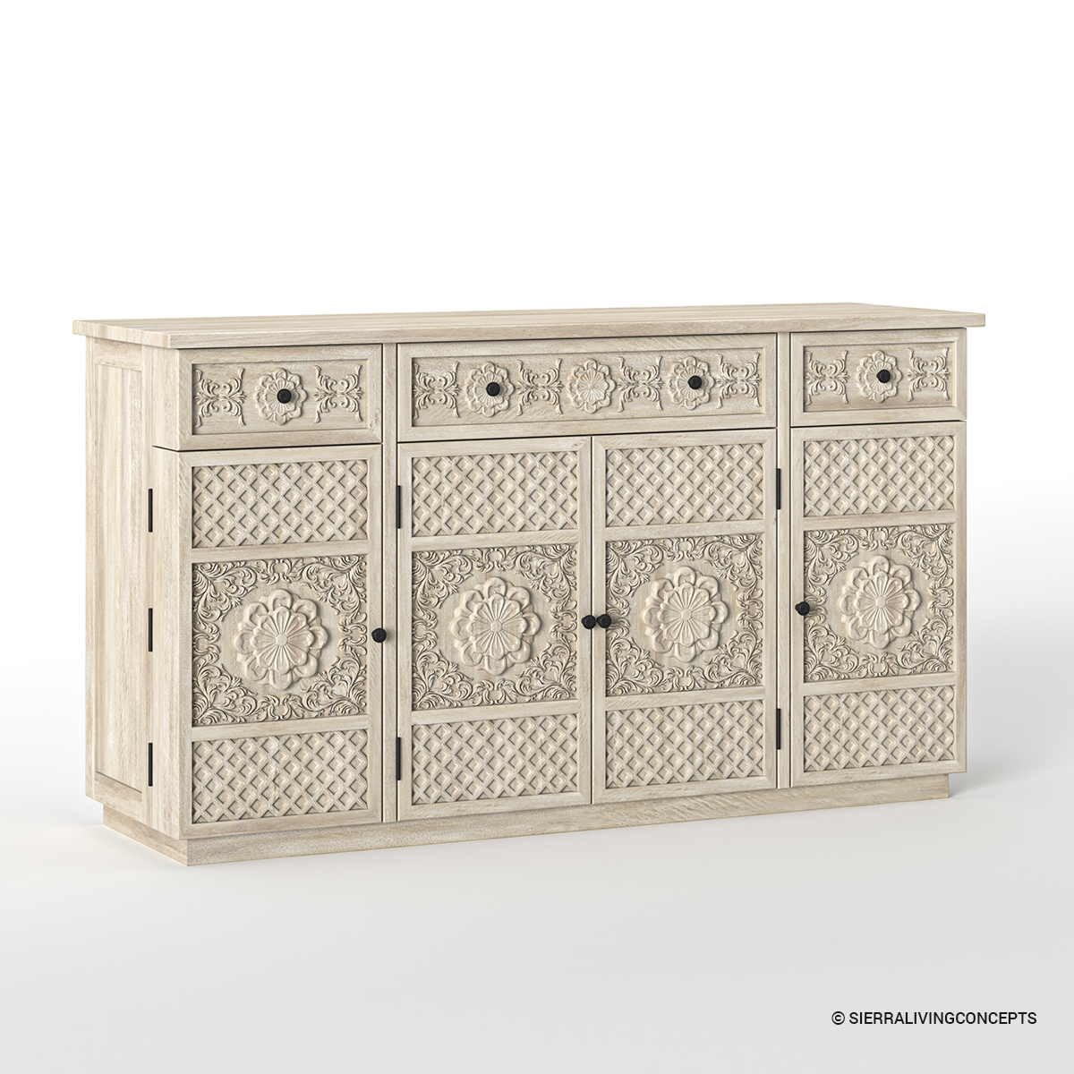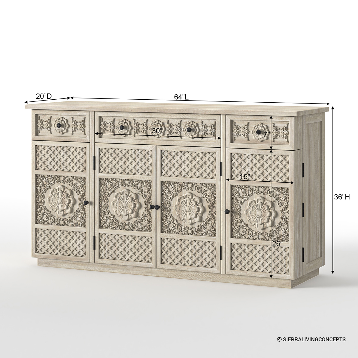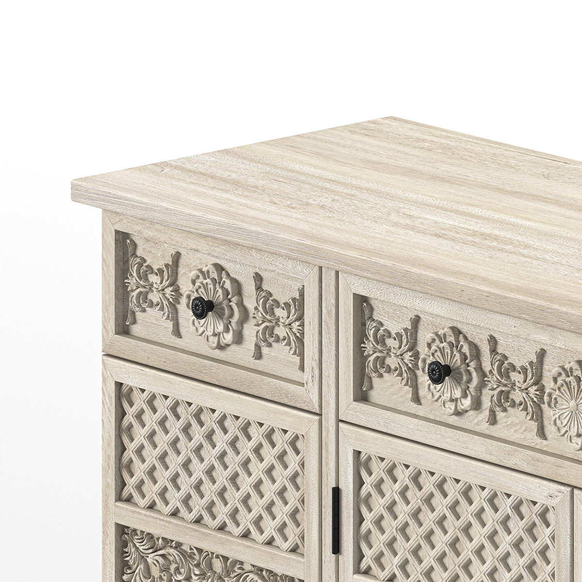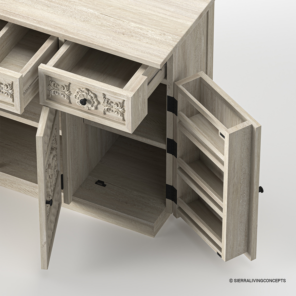 • Drenched in a weathered white finish, the facade of this buffet island cabinet features intricate latticework and floral medallion carvings, all delicately etched by hand for a one-of-a-kind touch and timeless appeal.