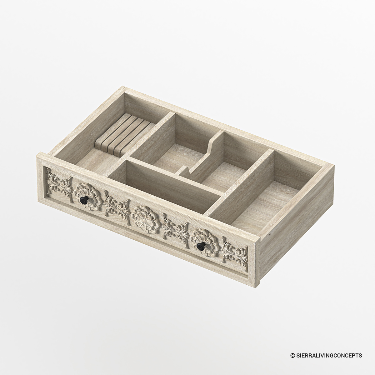 • Below the top, four streamlined supply drawers include sectioned organizers tailored for spoons, knives, and small accessories, ensuring everything stays neatly in place.