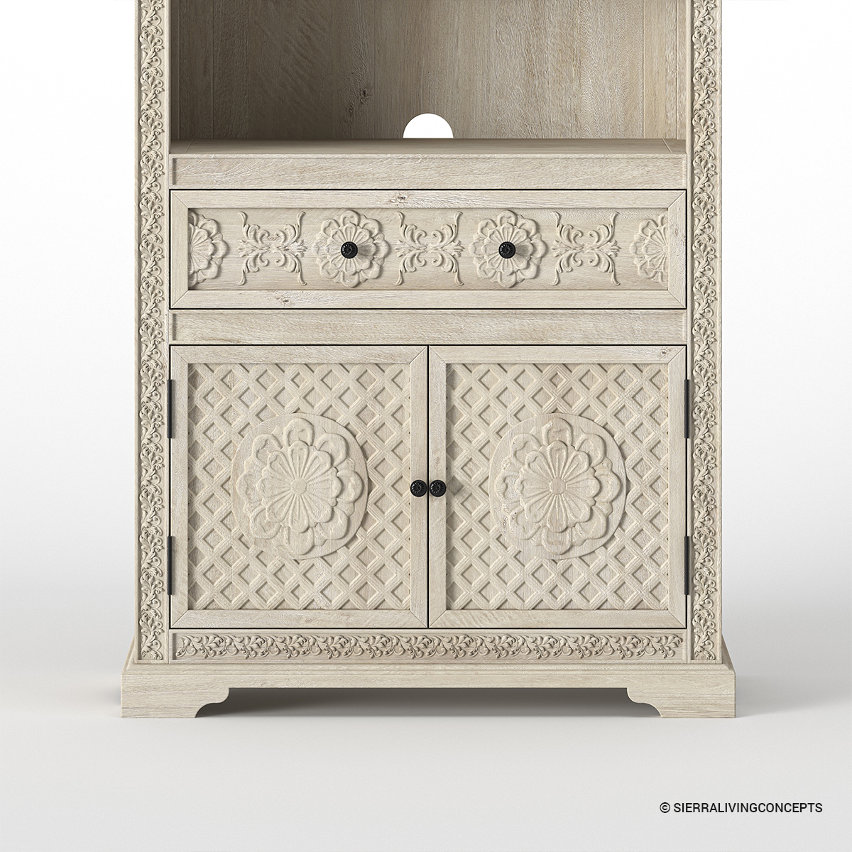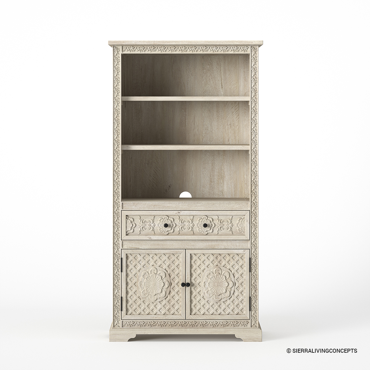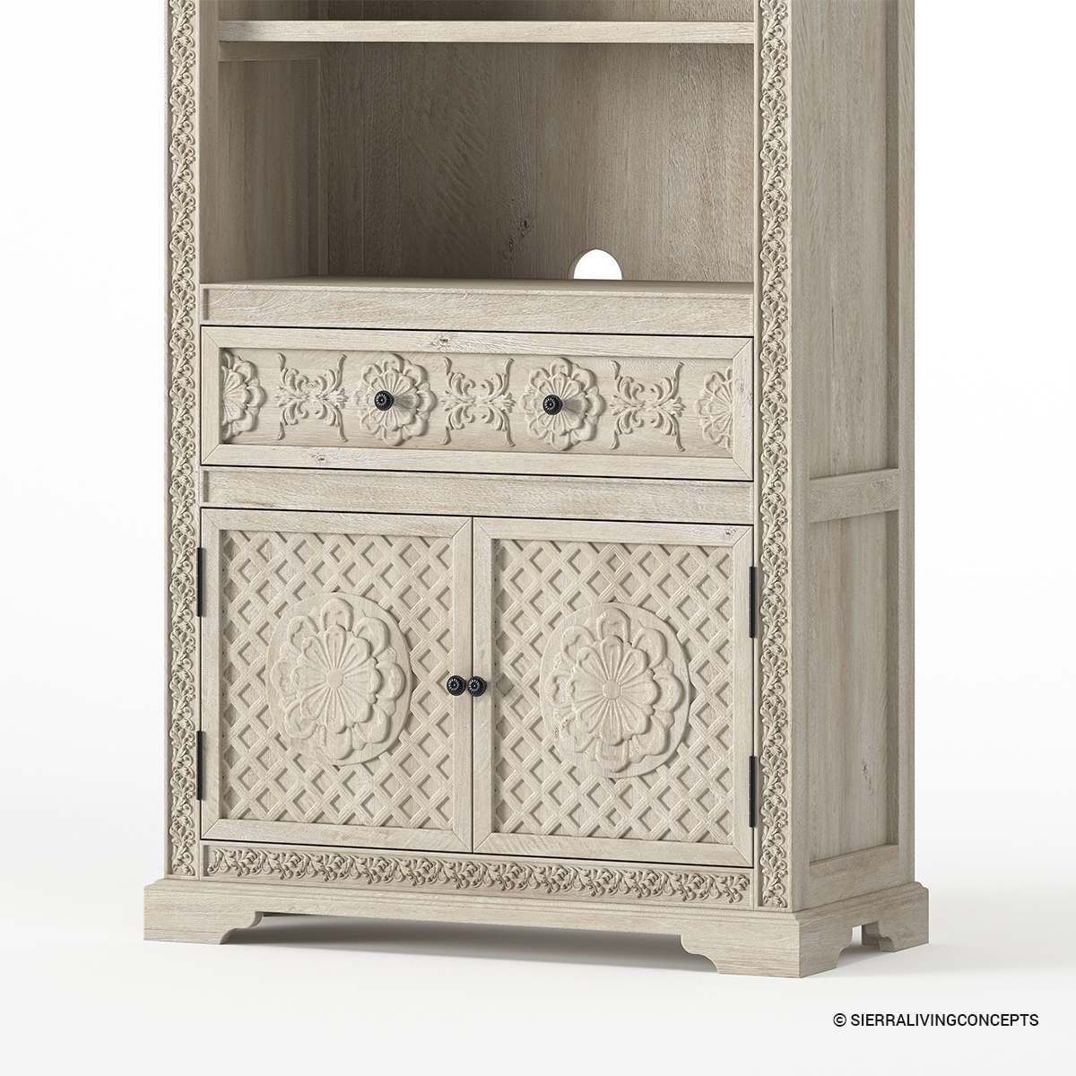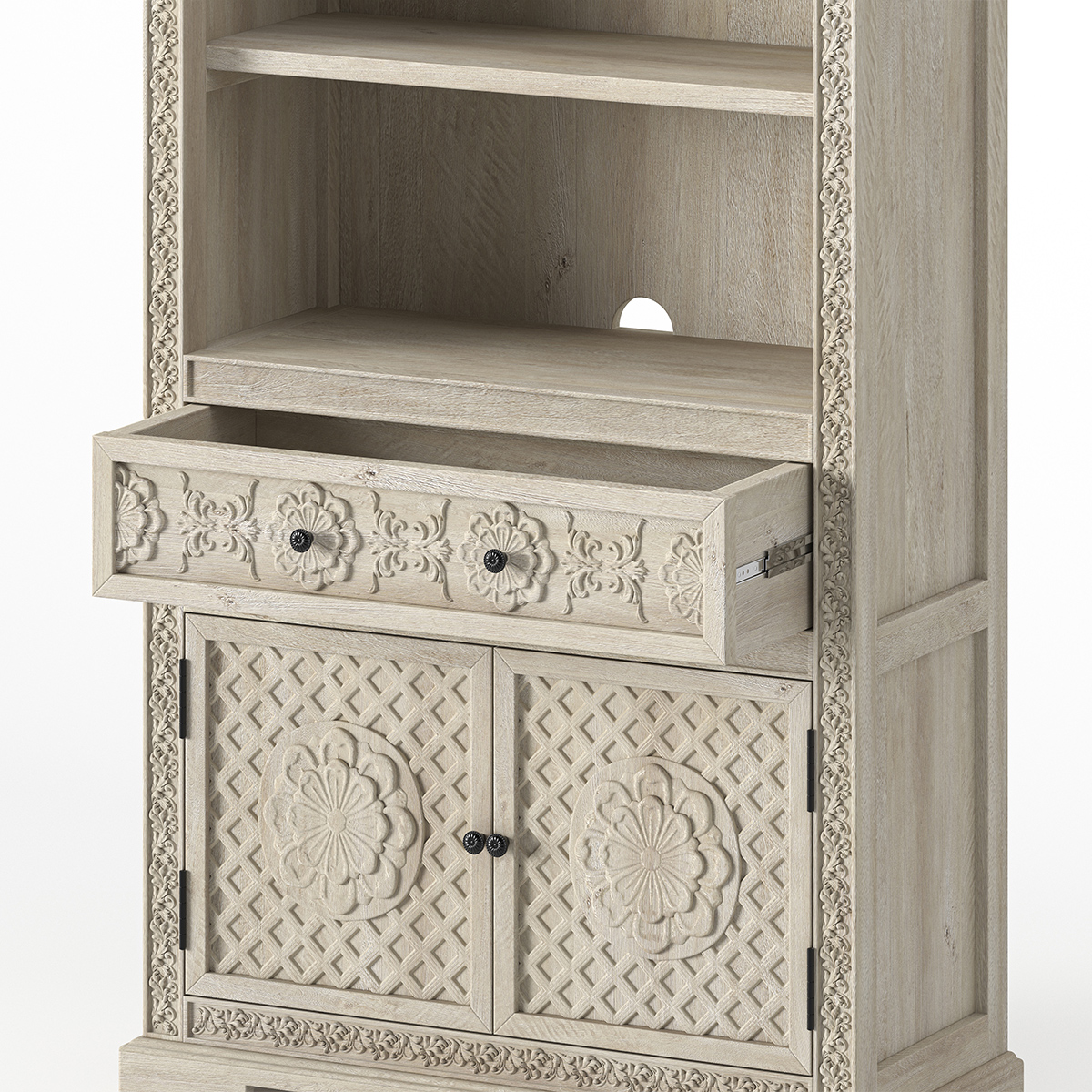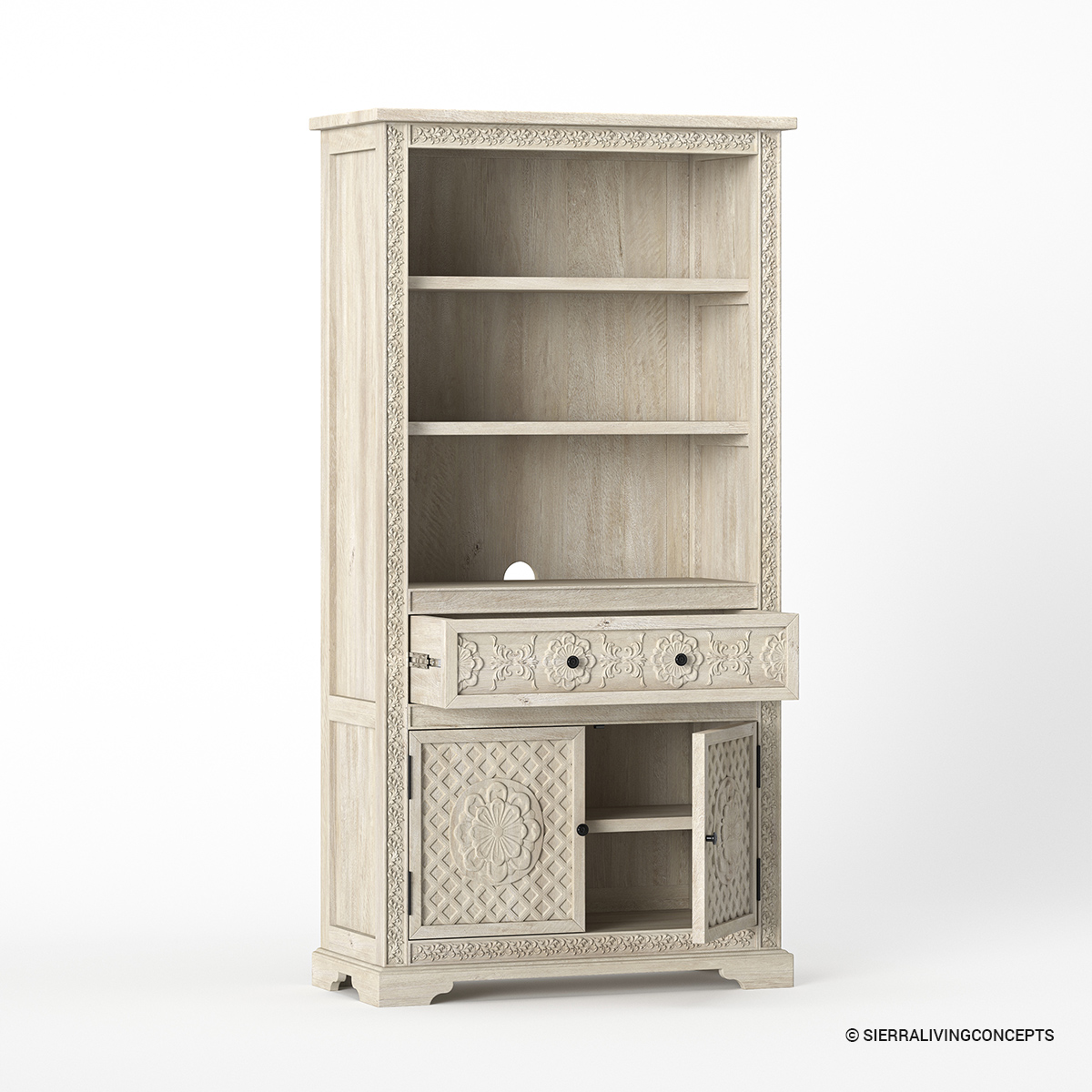 Our Nuala Hand Carved Solid Wood Bookcase with Door can transform your workspace from merely practical to a very inspiring study. This hand-carved bookcase with bottom cabinet provides perfect organization for your reading and files, while its artistic presence stimulates you to do your best work, demonstrating that a beautiful space is also productive.