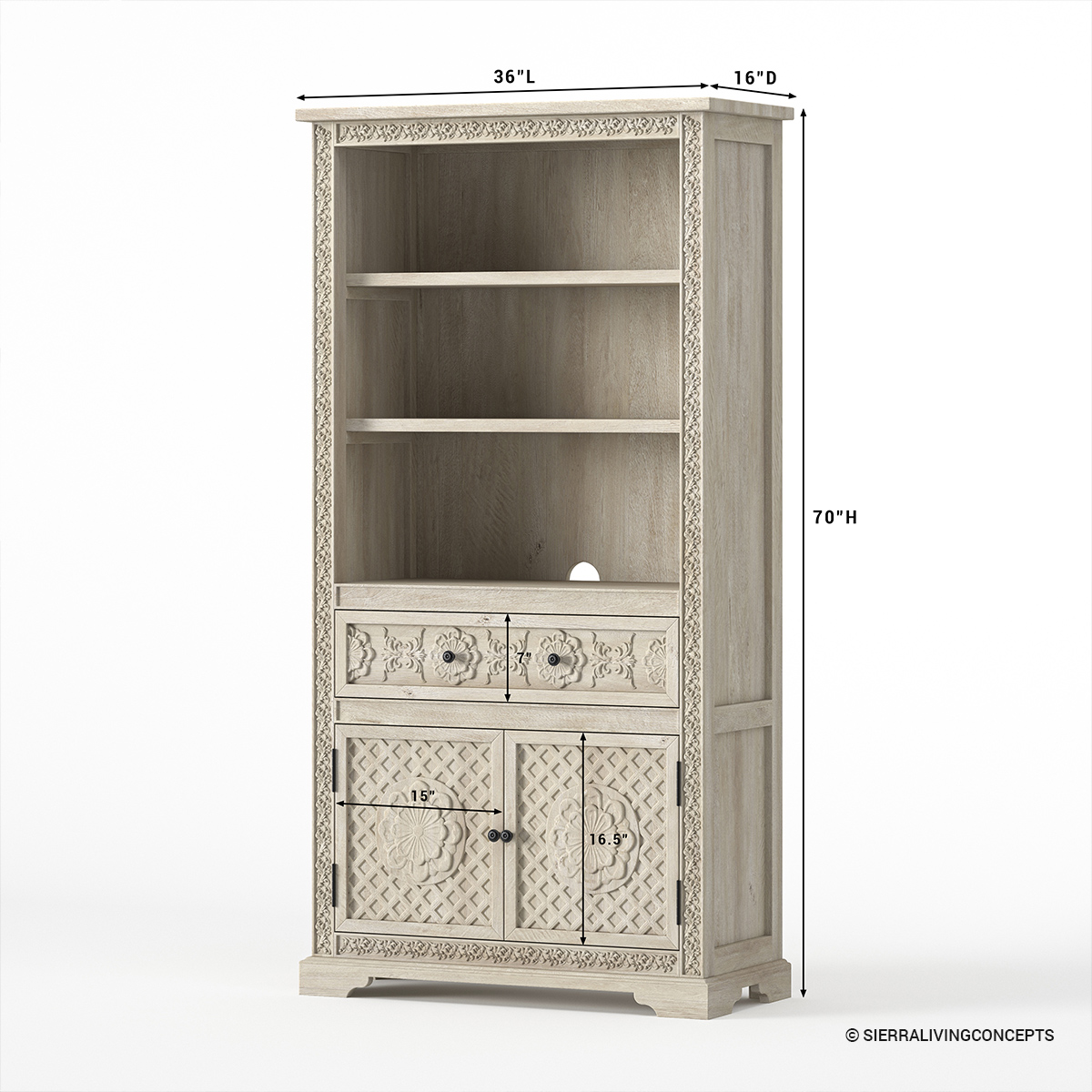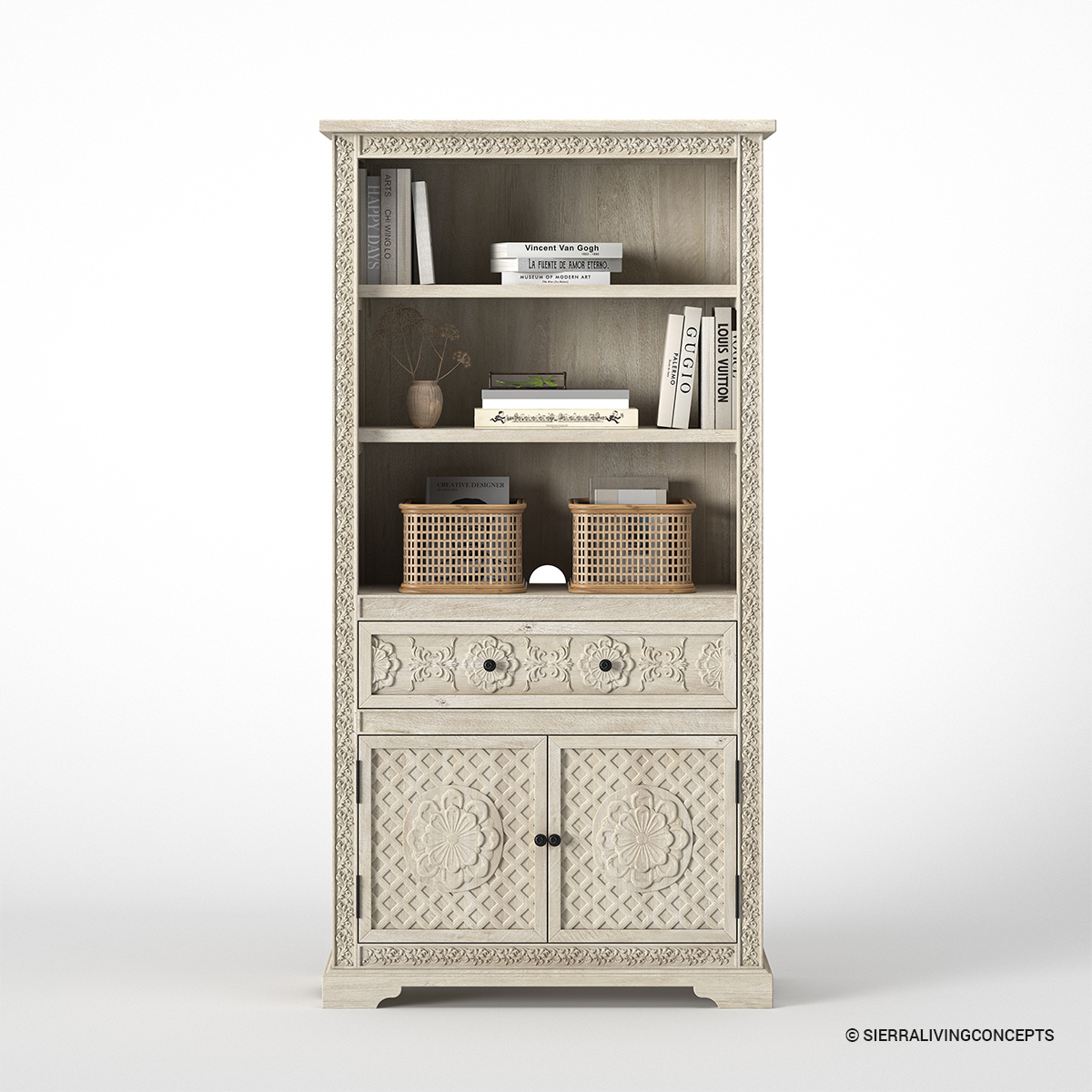 • This bookcase with storage cabinet combines bohemian charm with classic elegance. Handcrafted from fine solid wood, it exemplifies exquisite carving and timeless design that will last a lifetime.