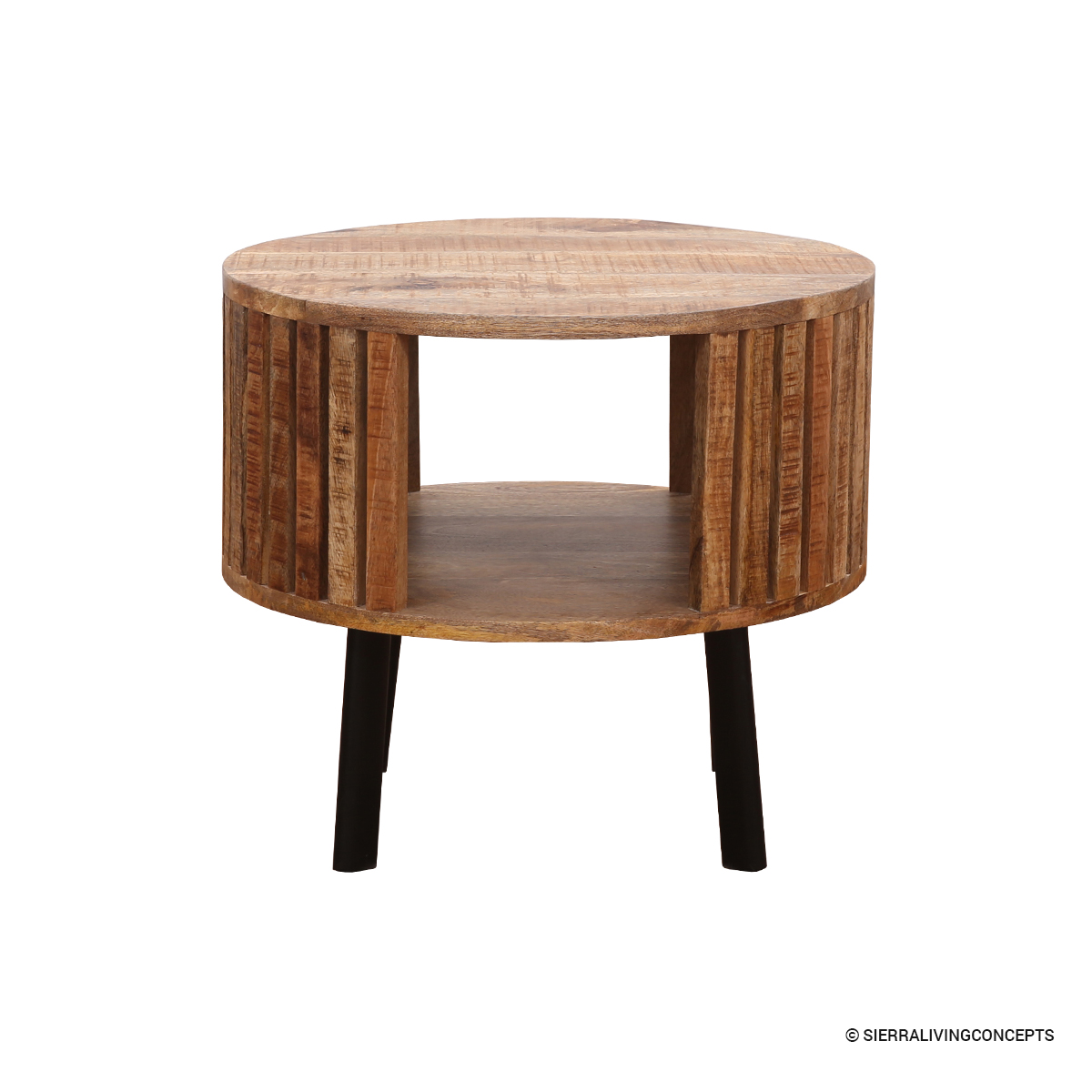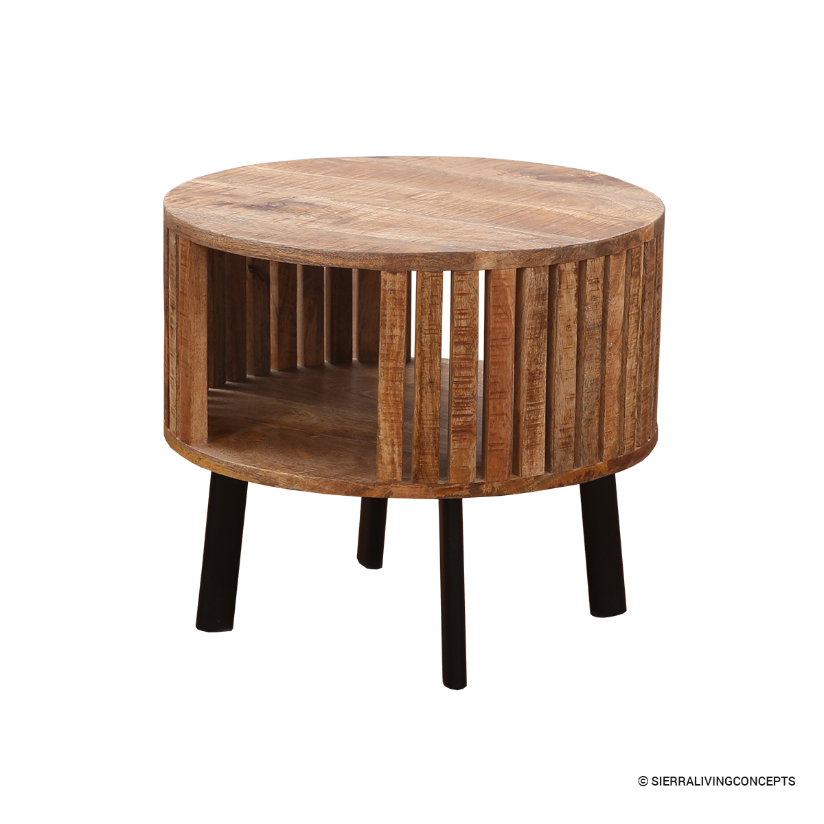 • Designed as a small round end table, its open slatted body includes a lower internal shelf, ideal for storing books, magazines, or displaying small decor items.
